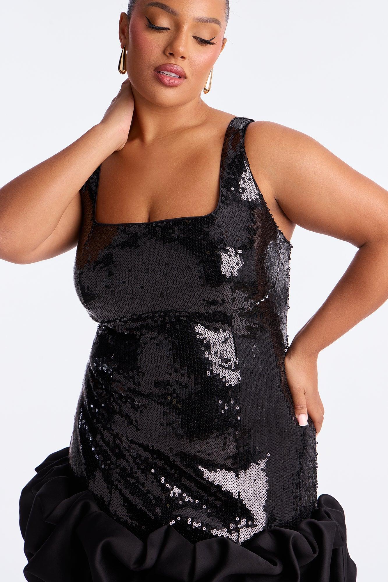 Available In Black. Sequin Mini Dress Square Neck Sleeveless Bubble Hem No Stretch Invisible Back Zipper Length Measured Flat = 34" Tall is 2" Longer Than Regular Length Self: 95% Polyester 5% Spandex Contrast: 100% Polyester Lining: 100% Polyester Imported