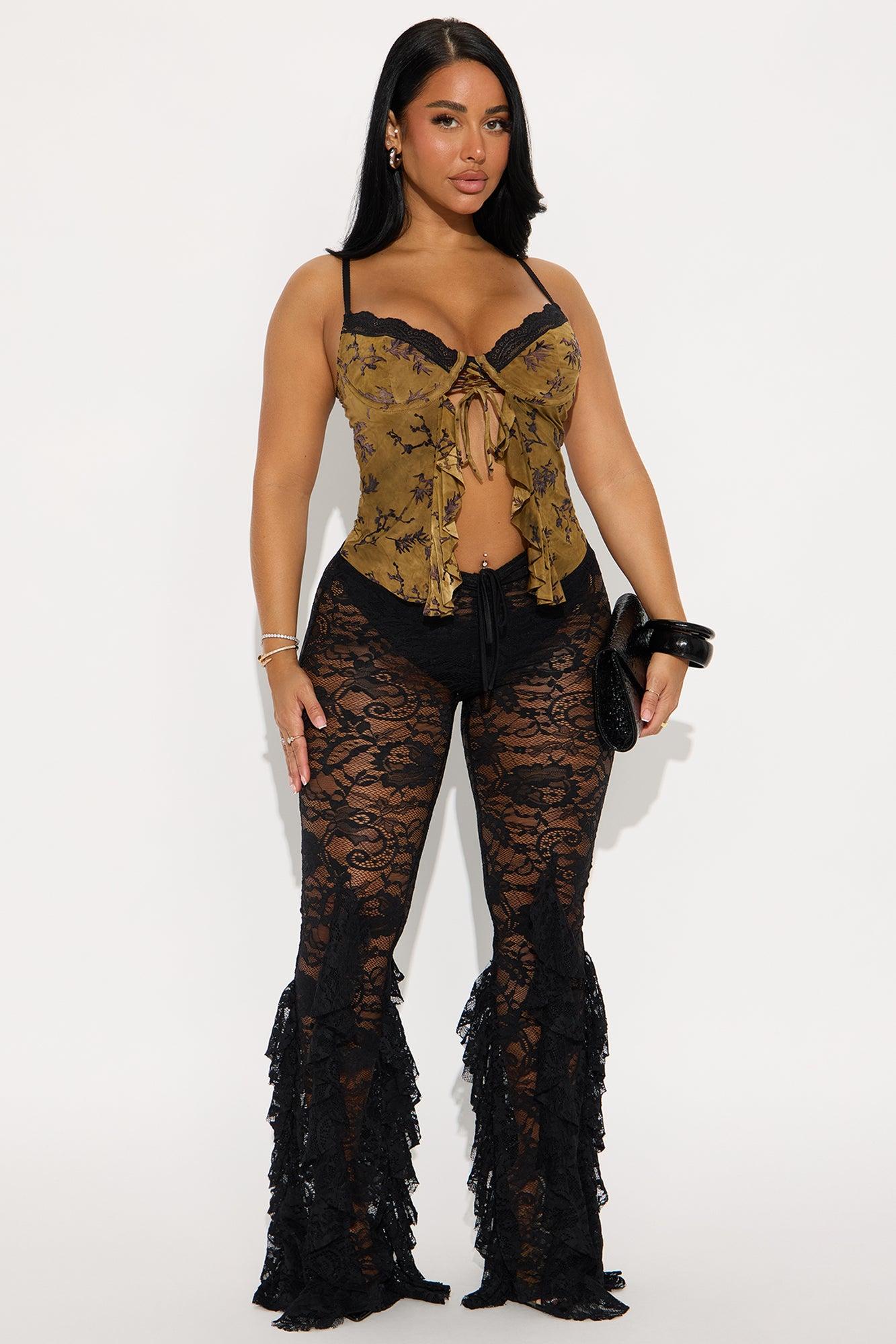 Available In Olive. Flyaway Top Adjustable Straps Lace Trim Underwire Lace Up Detail Tie Front Ruffle Hook And Eye Back Closure Cut Out & Backless Stretch Disclaimer: Print Placement May Vary. Self: 95% Polyester 5% Spandex Contrast: 90% Nylon 10% Spandex Imported California Proposition 65WARNING: Cancer and Reproductive Harm - www.P65Warnings.ca.gov.