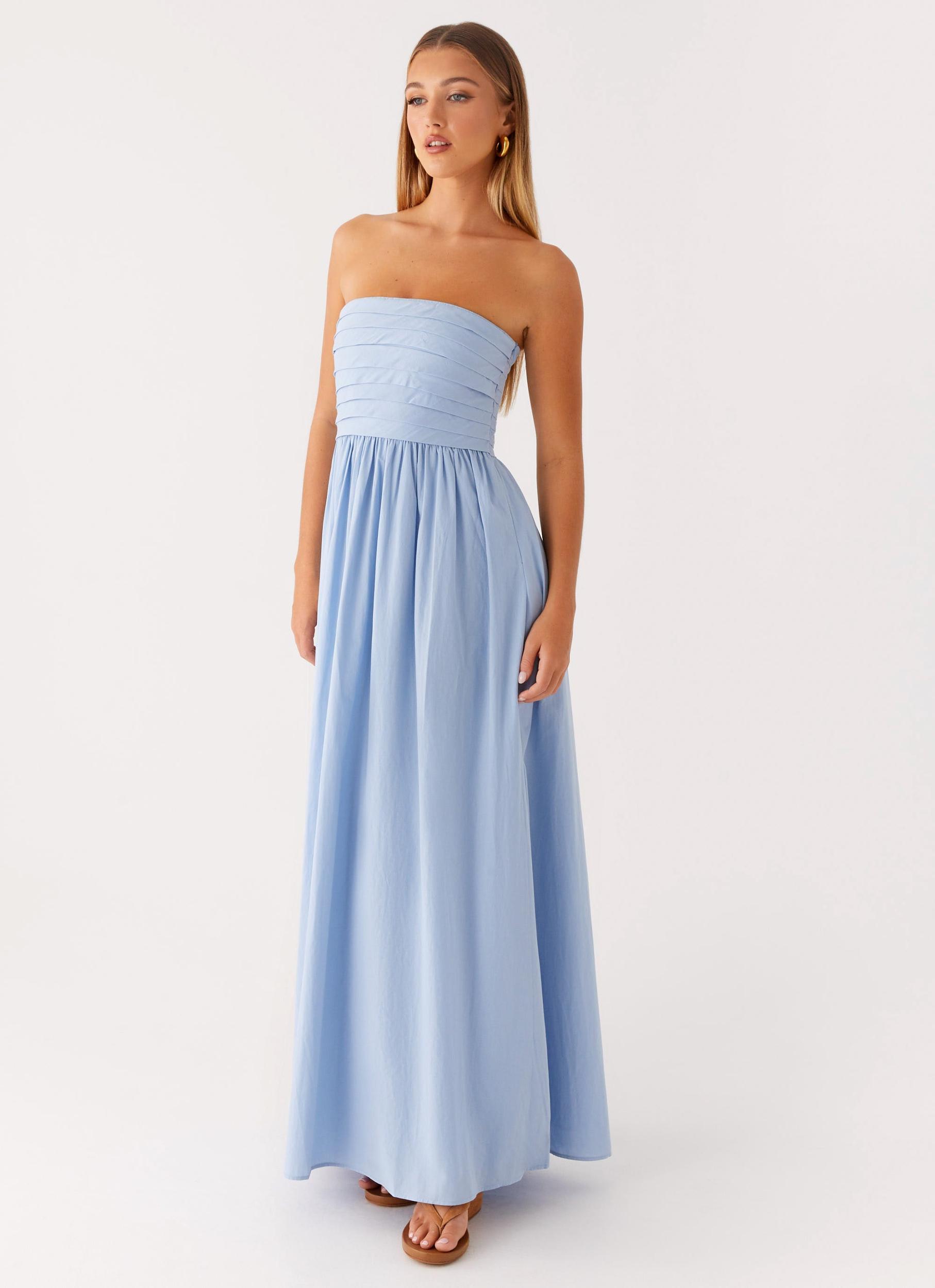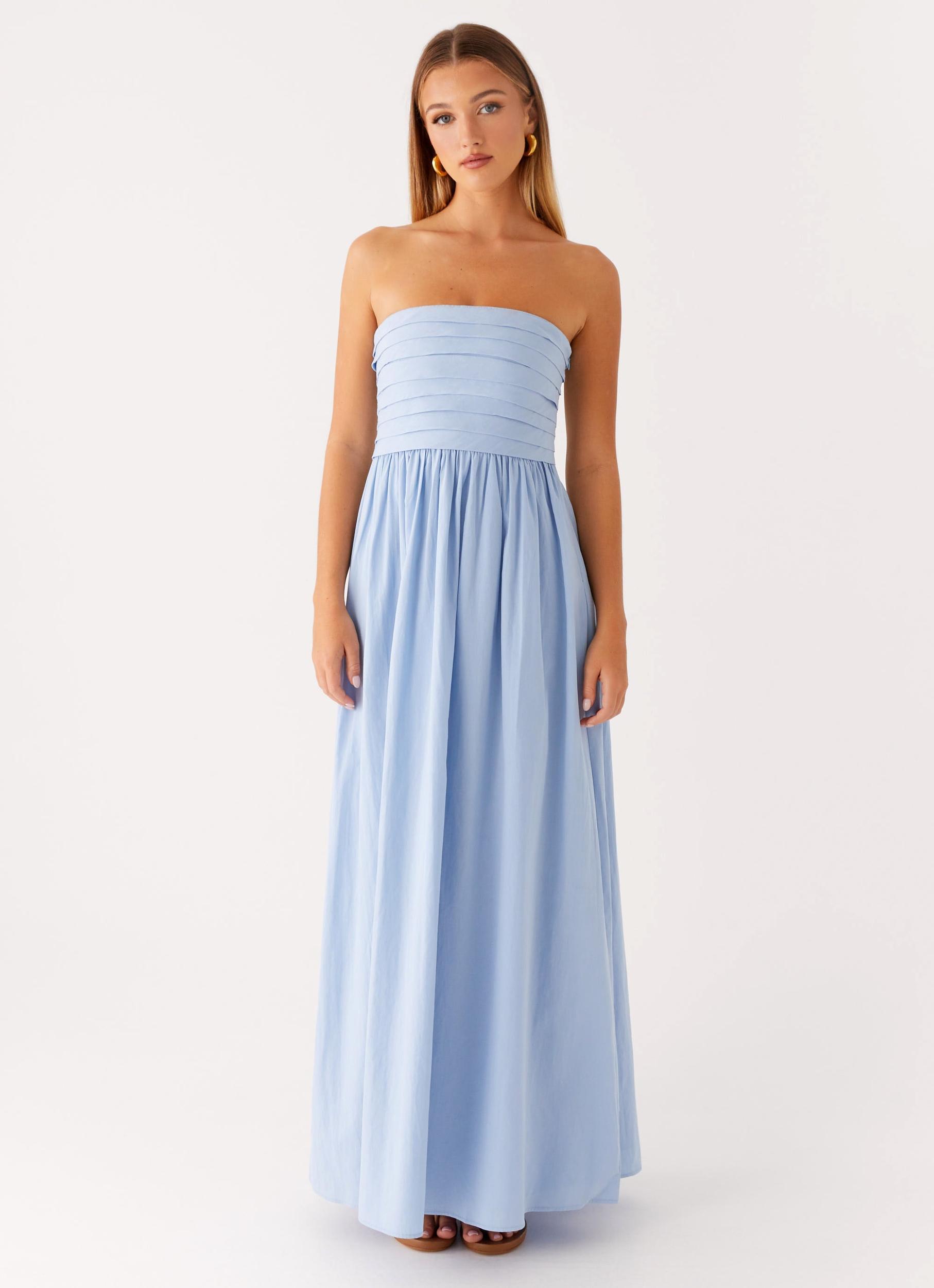 Peppermayo ExclusiveClassic elegance with a modern twist, the Tamia Maxi Dress features a strapless neckline, pleated bodice, and full A-line skirt. Fully lined with an invisible side zip and gripper tape inside the neckline for a secure fit.- Strapless Neckline - Pleated Bodice - Maxi Length - Fully Lined - Side Seam Invisible Zipper - Gripper Tape on Inside Neckline - A-Line Shape - Full Skirt - Fabric: 100% Cotton, Lining: 100% PolyesterSize AU 8 / US 4 garment measurements:bust:76cm/29.9inwaist:68cm/26.8inhem:220cm/86.6inlength:129cm/50.8inYasmin is 174cm and wears size AU 6 / size US 2