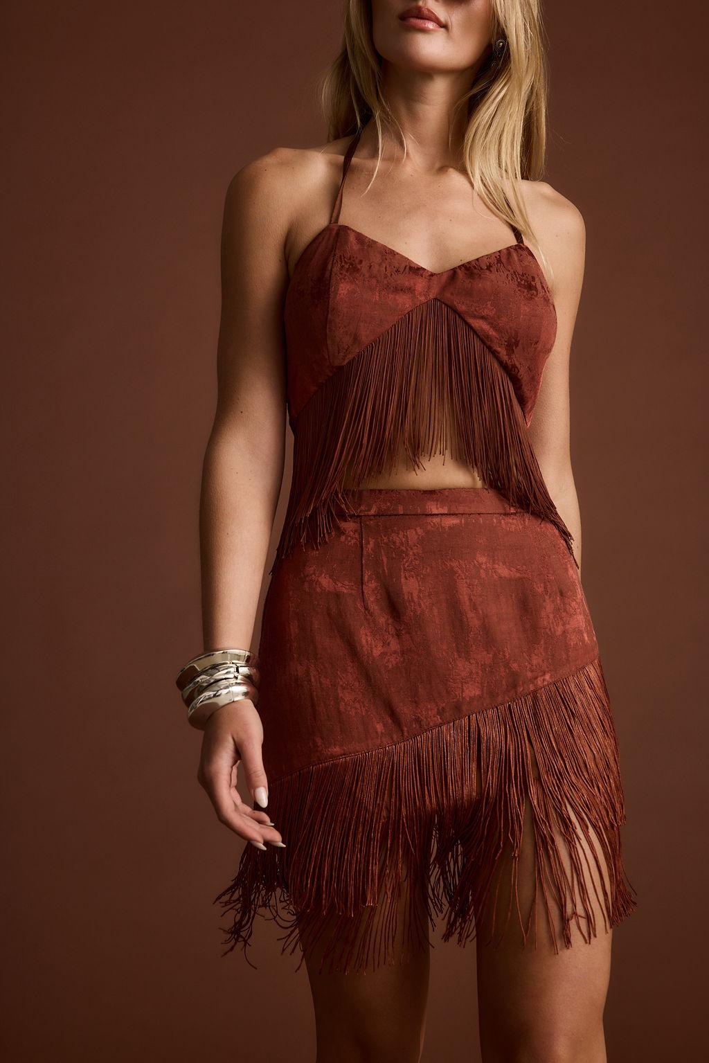 There’s a new cowgirl in town and she’s ready to take center stage. Introducing the statement of the season, the Tamsin Terracotta Jacquard Fringe Set. Made from a luxe satin terracotta red jacquard material with flirty fringe, rebel chic meets western vibes. Perfect for festival days and desert nights, pair it with the matching Tamsin Fringe Crop top for headliner vibes or style it solo for your own take on iconic.