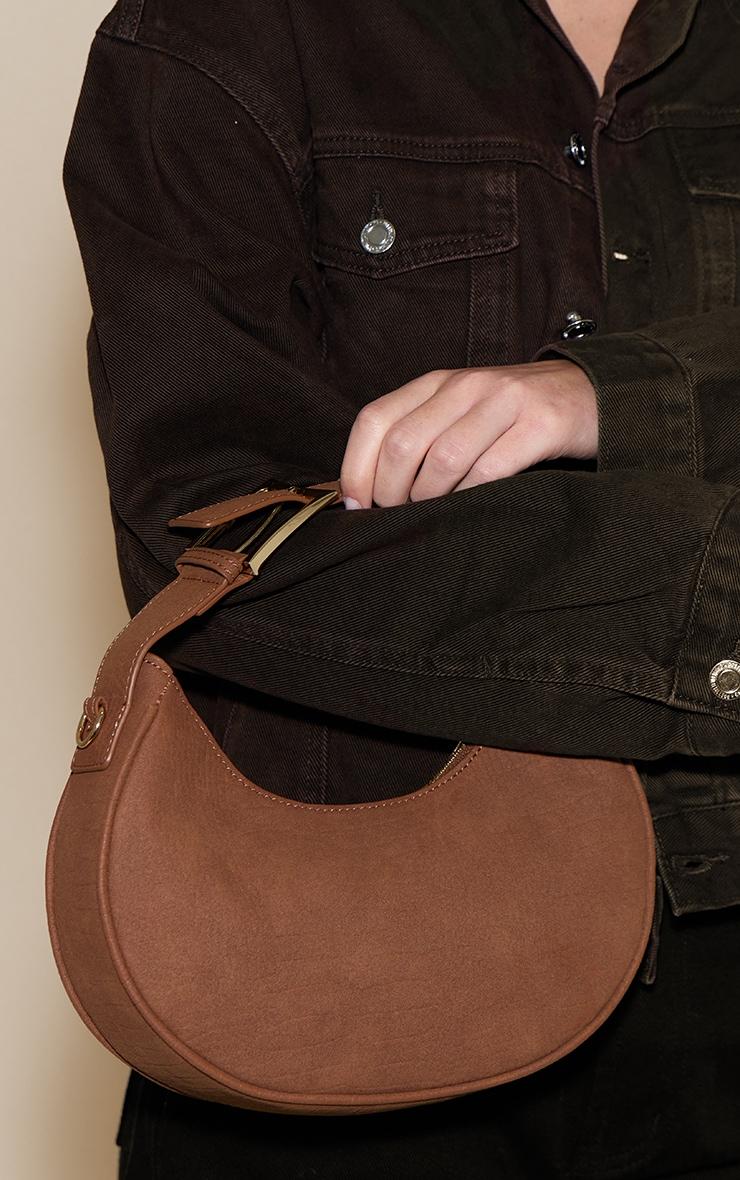 Introduce texture with the tan faux suede croc crescent shoulder bag. Designed in tan faux suede with a croc-effect finish, this crescent shape bag offers both structure and style. Carry with denim or dresses to elevate casual and occasion outfits alike. Approx Height: 16cm/6.5inch Approx Width: 25.5cm/10inch Approx Depth: 7.5cm/3inchp]:!mb-4inch>Brand: PrettyLittleThingCategory: AccessoriesProduct type: Shoulder BagColor: TanMaterial: Faux SuedeOccasion: Day