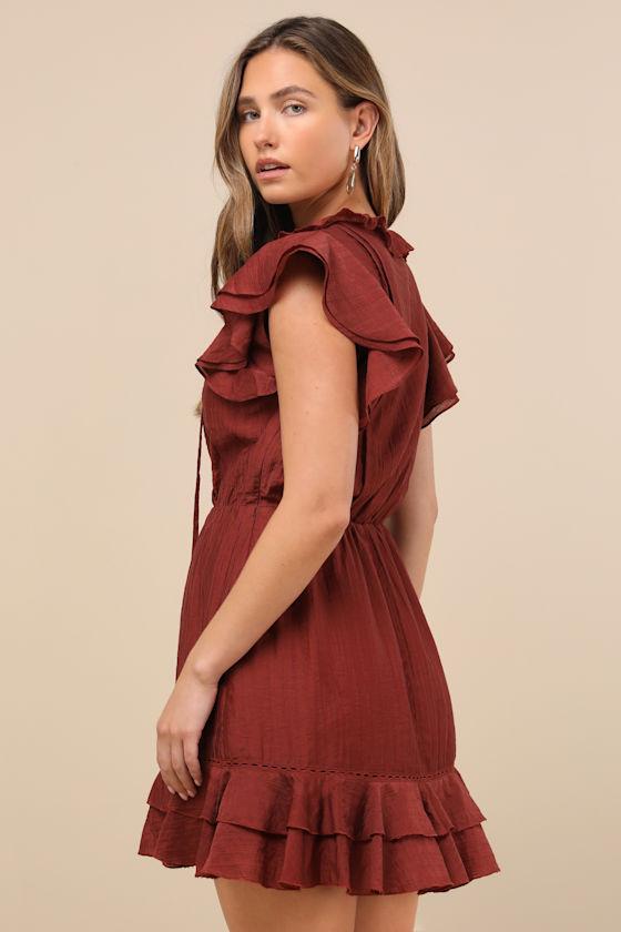 Achieve peak summer bliss every time you style this sweet mini dress, featuring a lightweight woven composition that you'll love during the warmest days. Fluttery tiered sleeves frame a blousy bodice with a ruffle-trimmed tying V-neckline, all atop an elasticized waist and a figure-skimming A-line skirt with tiers of ruffles along the hem. Intricate pierced embroidery throughout completes the Boho-chic look.