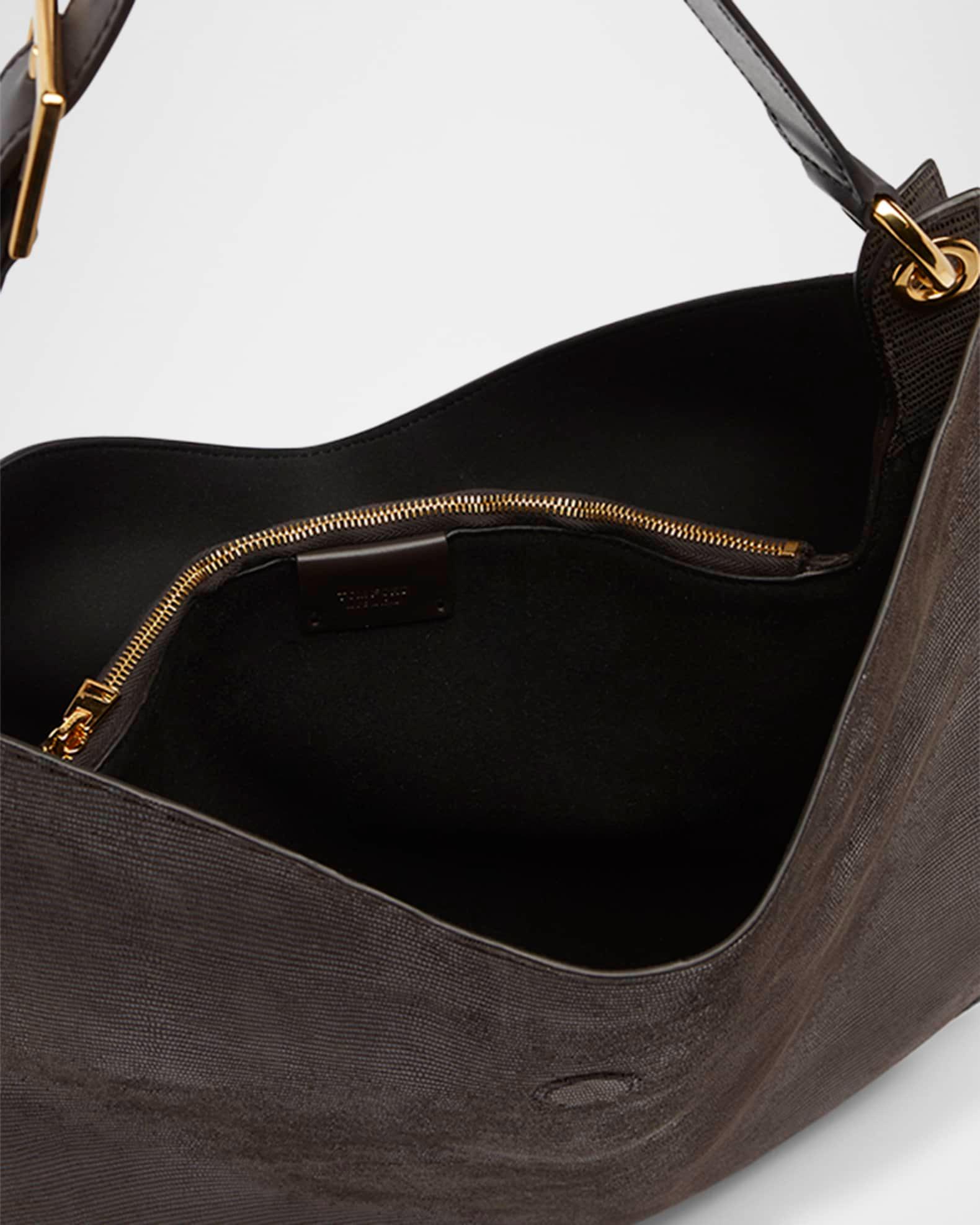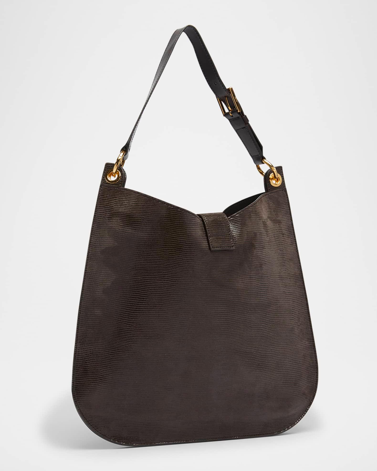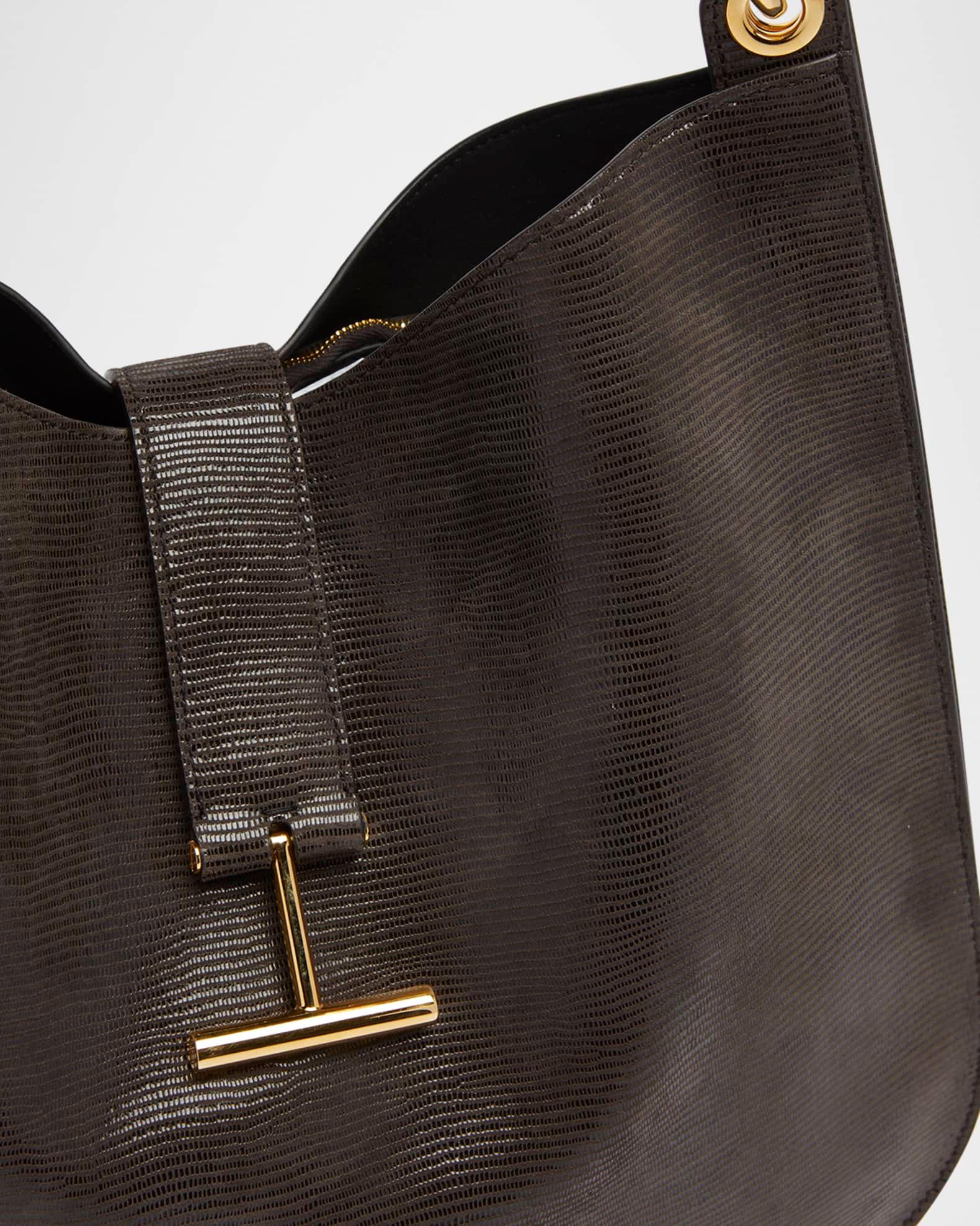 Tom Ford's "Tara" crossbody bag, a striking mix of lizard-embossed leather and luxurious suede, elevates your style with its bold yet refined design. Adjustable shoulder strap Detachable, adjustable crossbody strap Can be worn as a shoulder or crossbody bag Open top with signature T bar magnetic closure Center zip compartment divides interior Approx. 15"H x 15.7"W x 1.6"D Polyurethane Made in Italy