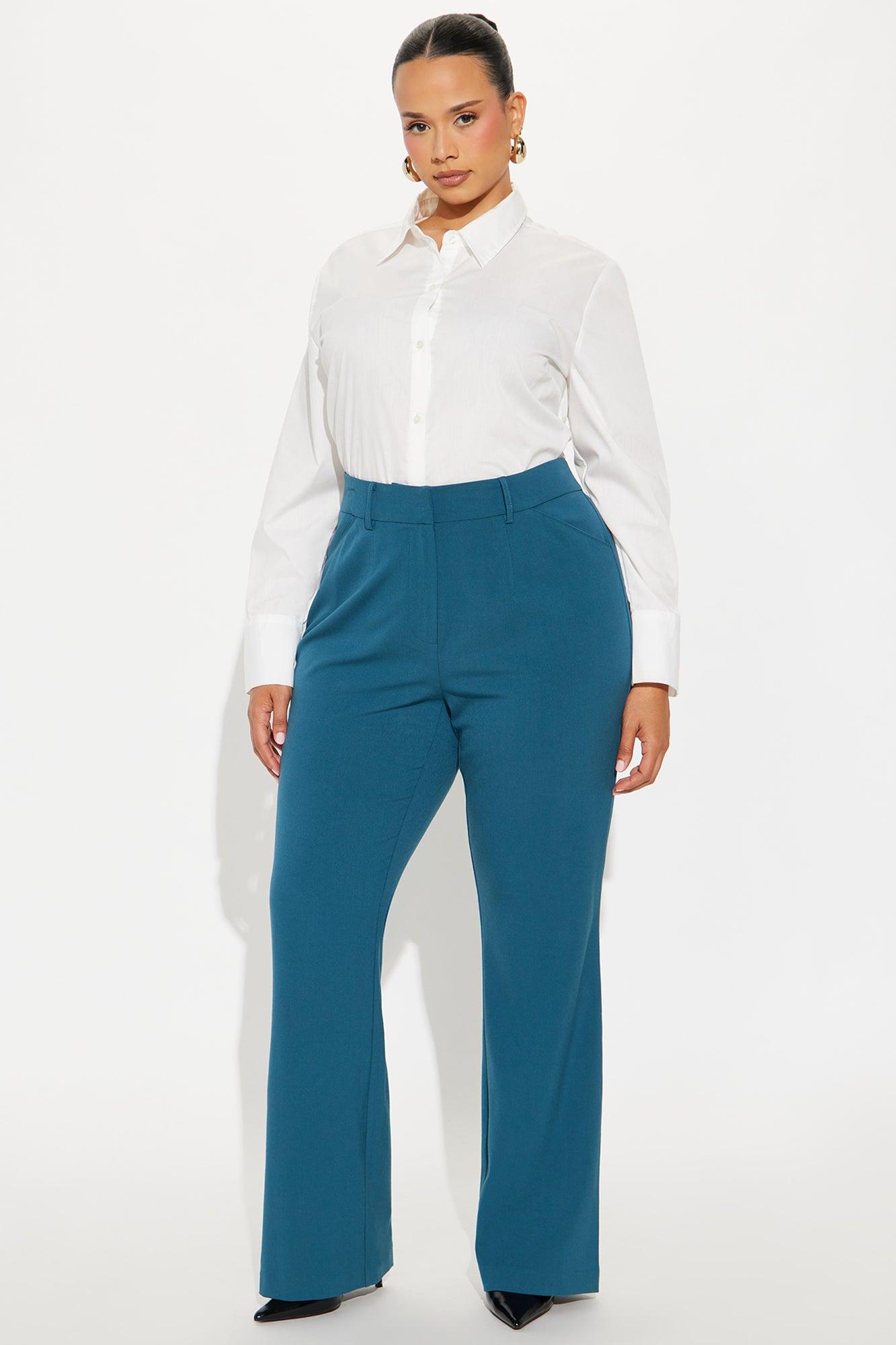 Available In Black, Blush, Brown, Burgundy, Charcoal, Eggplant, Hunter Green, Ivory, Light Blue, Navy, Oatmeal, Royal, Sage And Teal. Dressy Trouser Pant Full Stretch Regular 33" Inseam High Rise 2 Front Pockets Belt Loops Wide Leg Self: 65% Polyester 30% Rayon 5% Spandex Imported