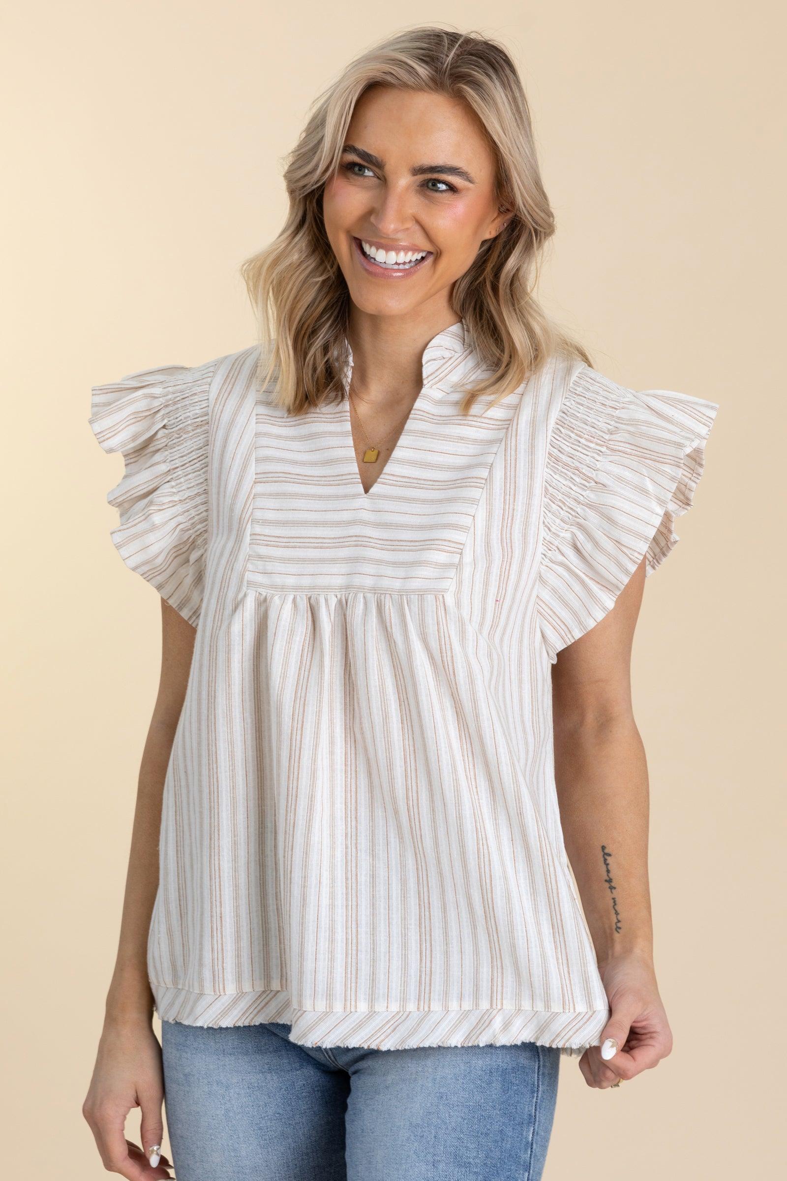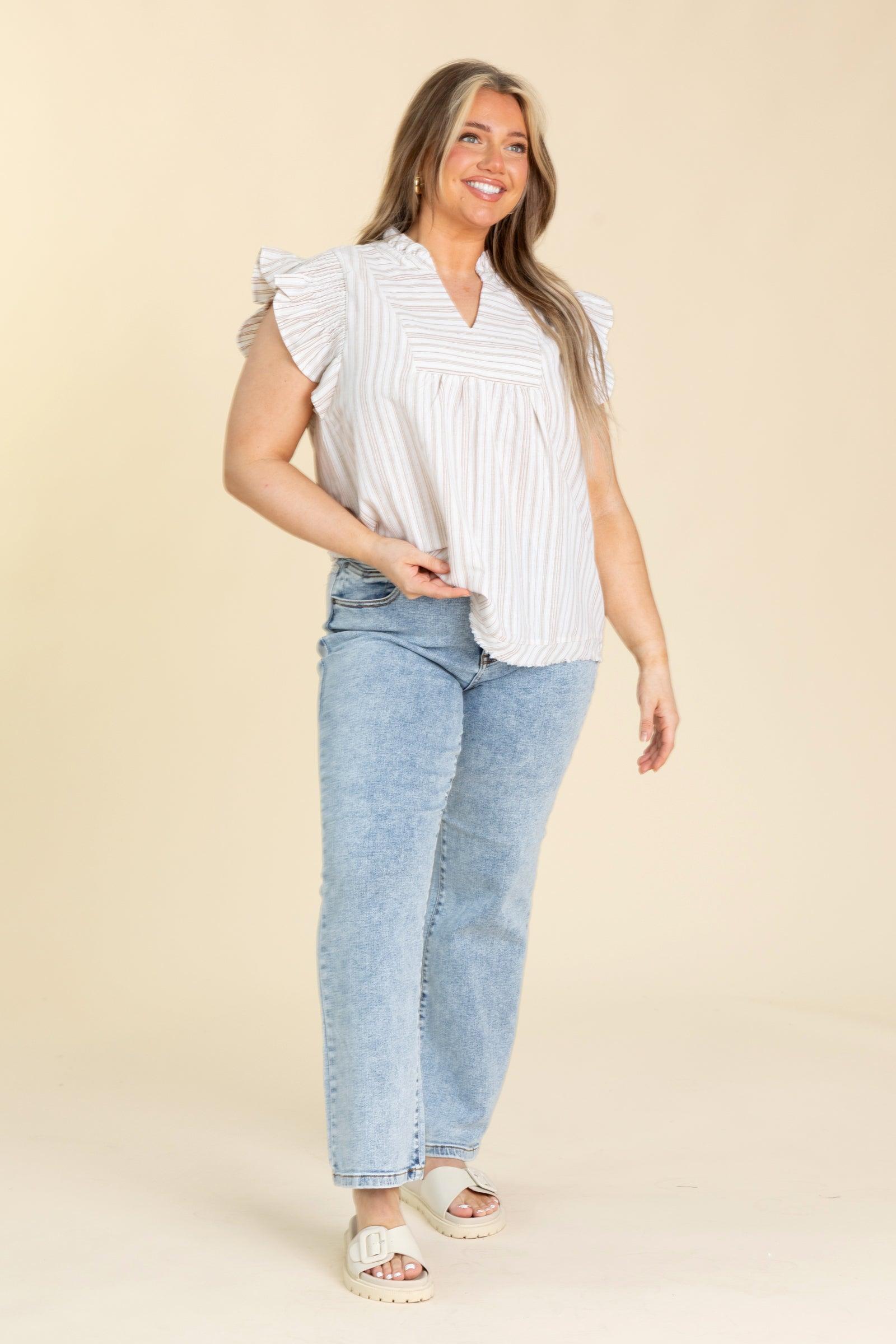 Product Details Colors: Taupe, Beige Print: Stripes Neckline: V-Neck Sleeve: Short Sleeve Hemline: Straight Brand: Umgee Material and Care 55% Cotton 45% Polyester Hand Wash Cold Hang/Line Dry Size and Fit Small: Bust 36" Waist 42" Length 26" Medium: Bust 38" Waist 44" Length 26.5" Large: Bust 40" Waist 46" Length 27" X Large: Bust 42" Waist 48" Length 27.5" 1X Large: Bust 44" Waist 50" Length 28" 2X Large: Bust 46" Waist 52" Length 2.58" Sarah is 5’8” and wearing her true size small Holsten is 5’5” and wearing her true size large