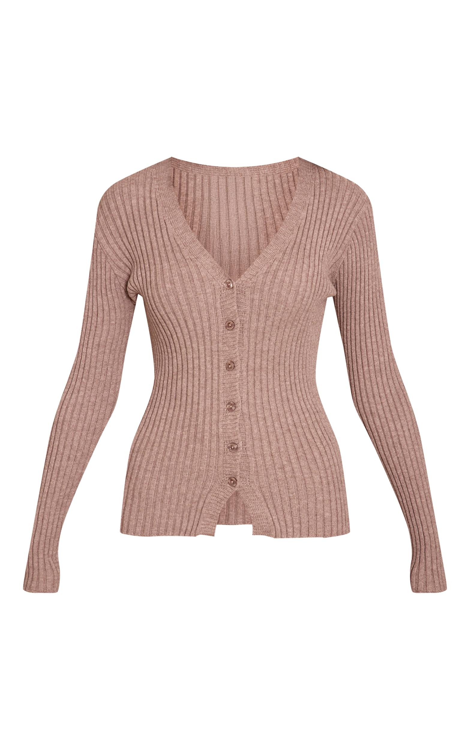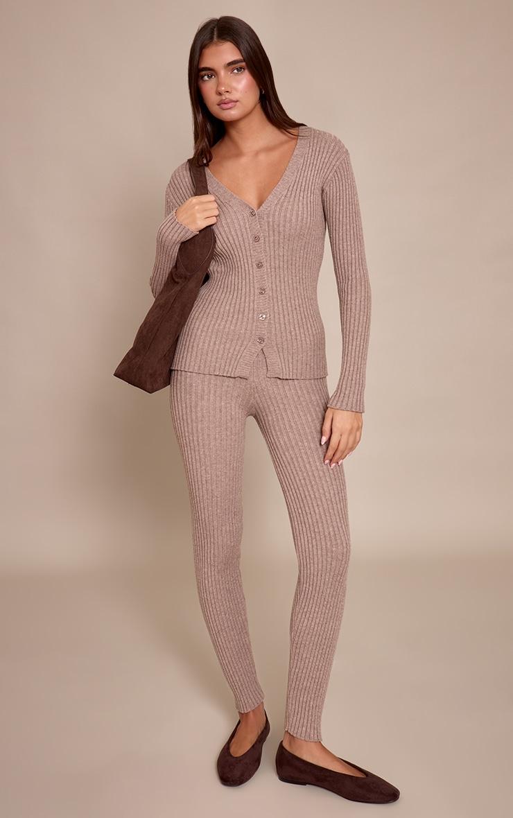 Build a cohesive look around knitwear designed for modern ease. The taupe ribbed knitted long sleeve button down cardigan presents a clean V-neckline and a full button-down front, allowing for effortless versatility. Its distinctive ribbed design defines a streamlined silhouette, perfect for day-long wear. Wear this key piece with the matching ribbed pants for a streamlined two piece set, or alternatively, team it with sleek wide-leg pants for a refined daytime aesthetic. Complete your edit with sharp boots and a hint of understated sophistication from gold earrings, making a confident statement.Length approx 48.5cm/19inch (Based on sample size S)Model wears size SModel Height - 5ft 7inchp]:!mb-4inch>Brand: PrettyLittleThingCategory: KnitwearProduct type: CardigansColor: TaupeMaterial: KnitOccasion: Day