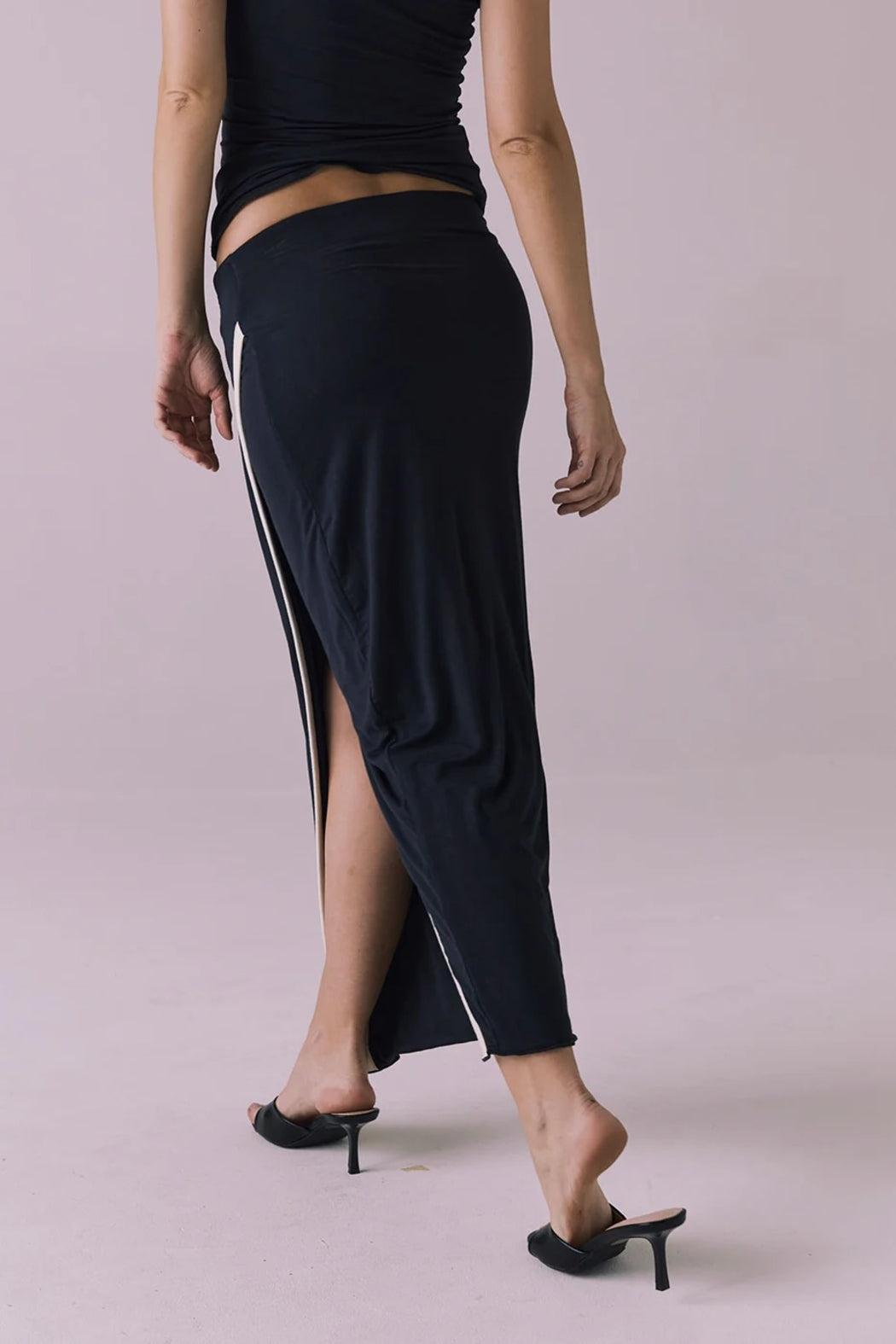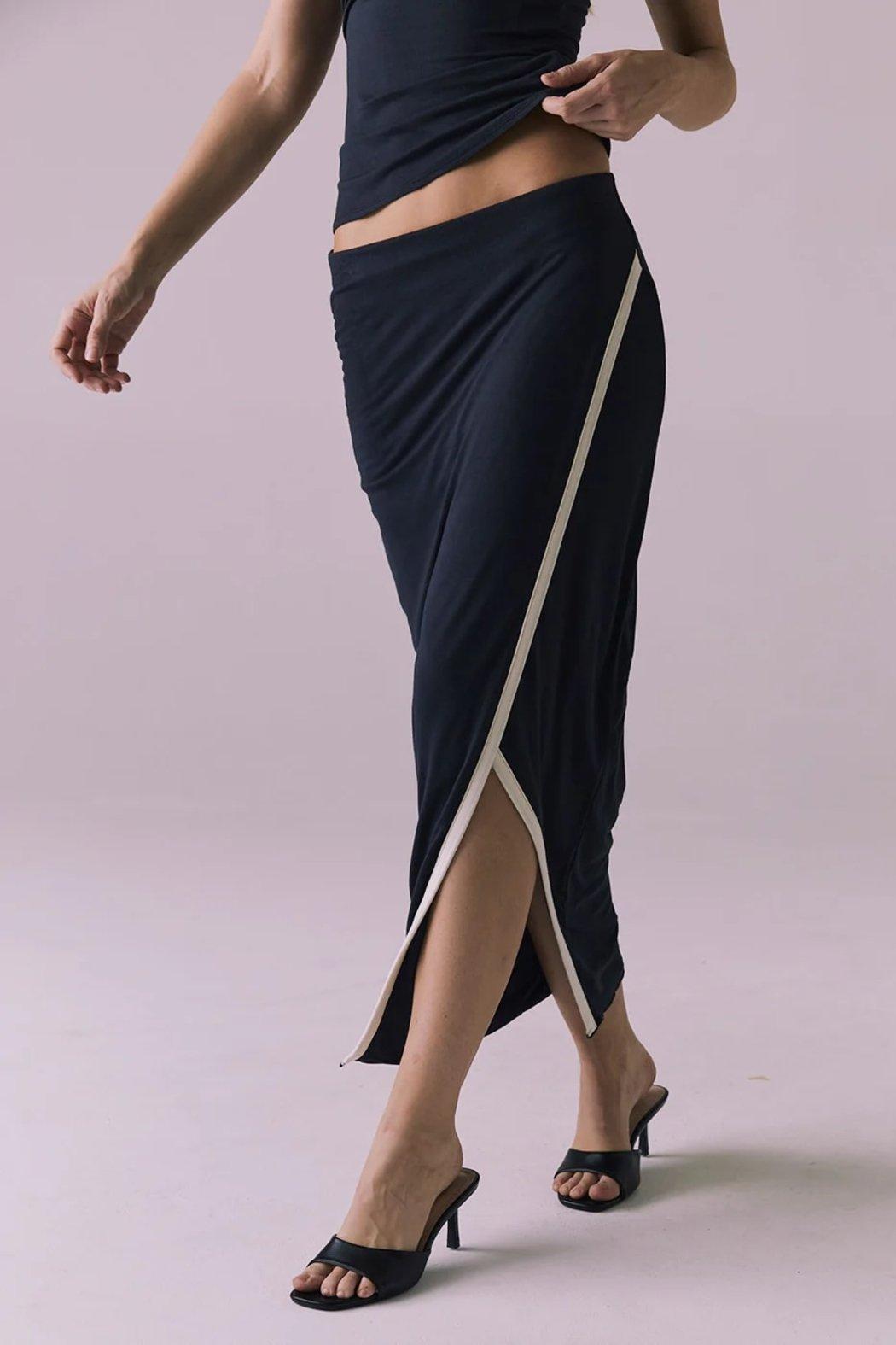 Step up your skirt game with the Licorice black Tavira Midi.