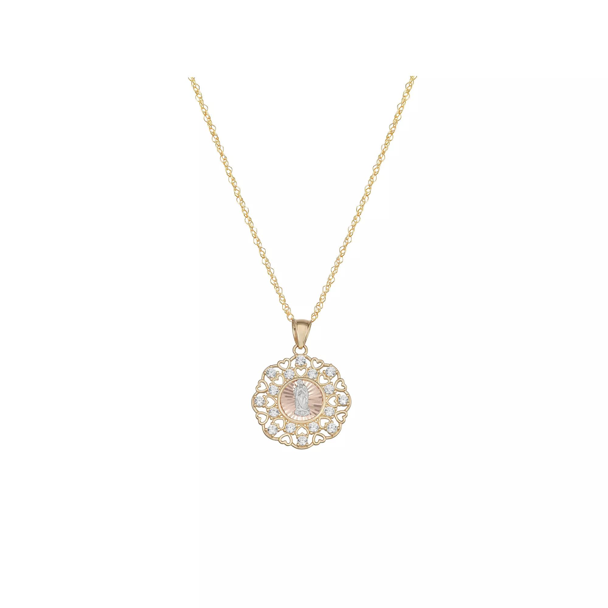 Embrace faith and tradition with this Taylor Grace 10k Tri-Tone Gold Cubic Zirconia Guadalupe Pendant Necklace. Its intricate design and shimmering stones make it a stunning devotional piece. Click on this JEWELRY & WATCHES GUIDE to learn about fit, styles, materials and more! Embrace faith and tradition with this Taylor Grace 10k Tri-Tone Gold Cubic Zirconia Guadalupe Pendant Necklace. Its intricate design and shimmering stones make it a stunning devotional piece. Click on this JEWELRY & WATCHES GUIDE to learn about fit, styles, materials and more! FEATURES Dimensions: 0.82"L x 0.53"W Chain length: 18 in. Chain type: rope Clasp: spring-ring Nickel free Metal: 10k gold Finish: polished Stone type: cubic zirconia Gemstones may have been treated to enhance their appearance. Special care may be required. Please visit our Gemstone Treatment & Special Care Guide for more information. Size: 18-20" ADJ. Color: 10k Tone. Gender: female. Age Group: adult.