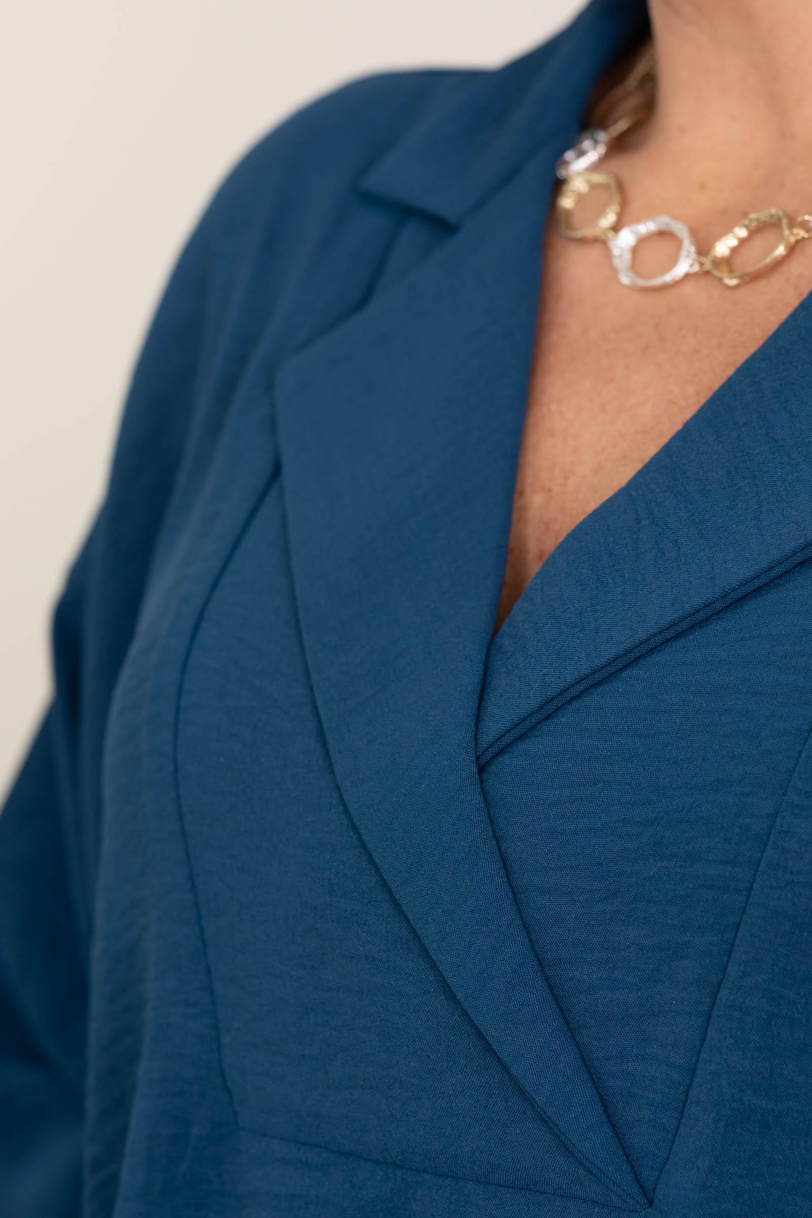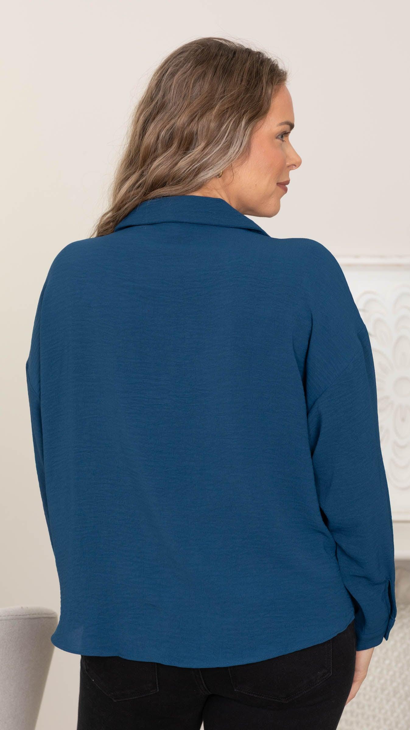 Product Details Colors: Teal Print: Solid Neckline: Surplice Collared Sleeve: Long Sleeve Hemline: Straight Brand: Ott Material and Care 100% Polyester Hand Wash Cold Hang/Line Dry Size and Fit Small: Bust 48" Waist 48" Length 20.5"/24.5" Medium: Bust 50" Waist 50" Length 21"/25" Large: Bust 52" Waist 52" Length 21.5"/25.5" X Large: Bust 54" Waist 54" Length 22"/26" Erica is 5’7” and wearing her true size small