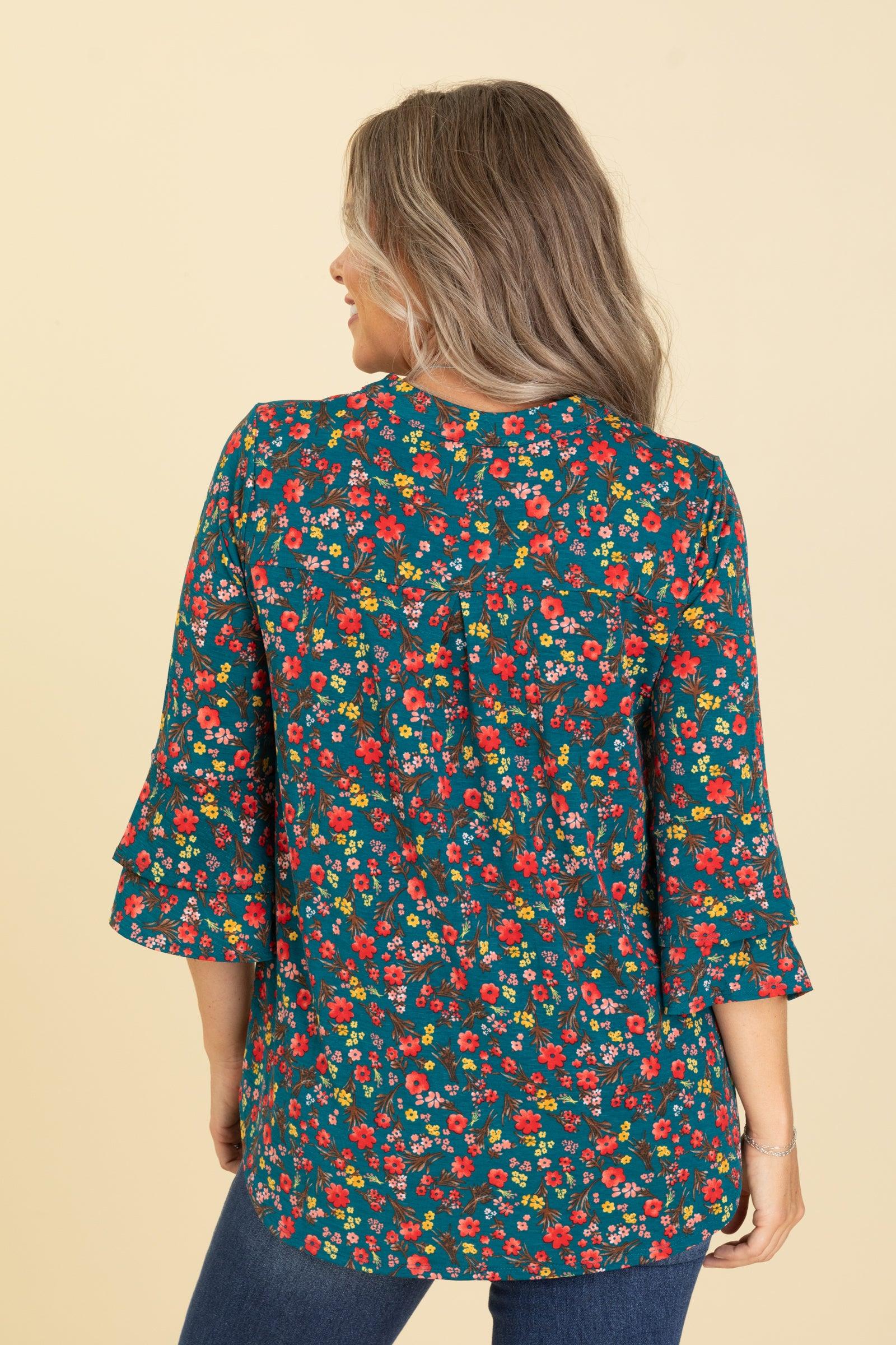 Product Details Colors: Teal, Coral, Peach, Brown, Marigold Print: Floral Neckline: V-Neck Sleeve: 3/4 Bell Sleeve Hemline: Straight Brand: Dear Scarlett Material and Care 94% Polyester 6% Spandex Hand Wash Cold Hang/Line Dry Size and Fit Small: Bust 38" Waist 40" Length 27" Medium: Bust 40" Waist 42" Length 27.5" Large: Bust 42" Waist 44" Length 28" X Large: Bust 44" Waist 46" Length 28.5" 2X Large: Bust 48" Waist 50" Length 30" 3X Large: Bust 50" Waist 52" Length 31" Erica is 5’7” and wearing her true size small