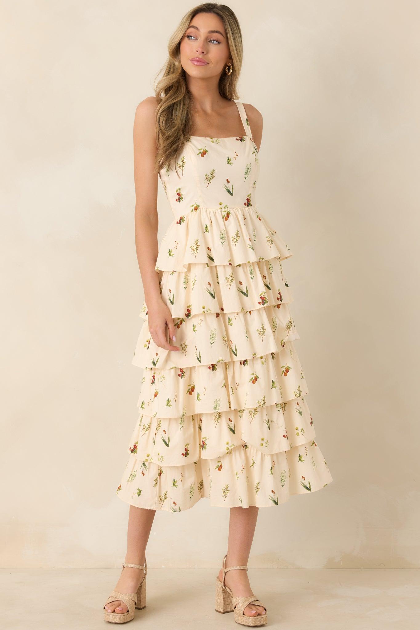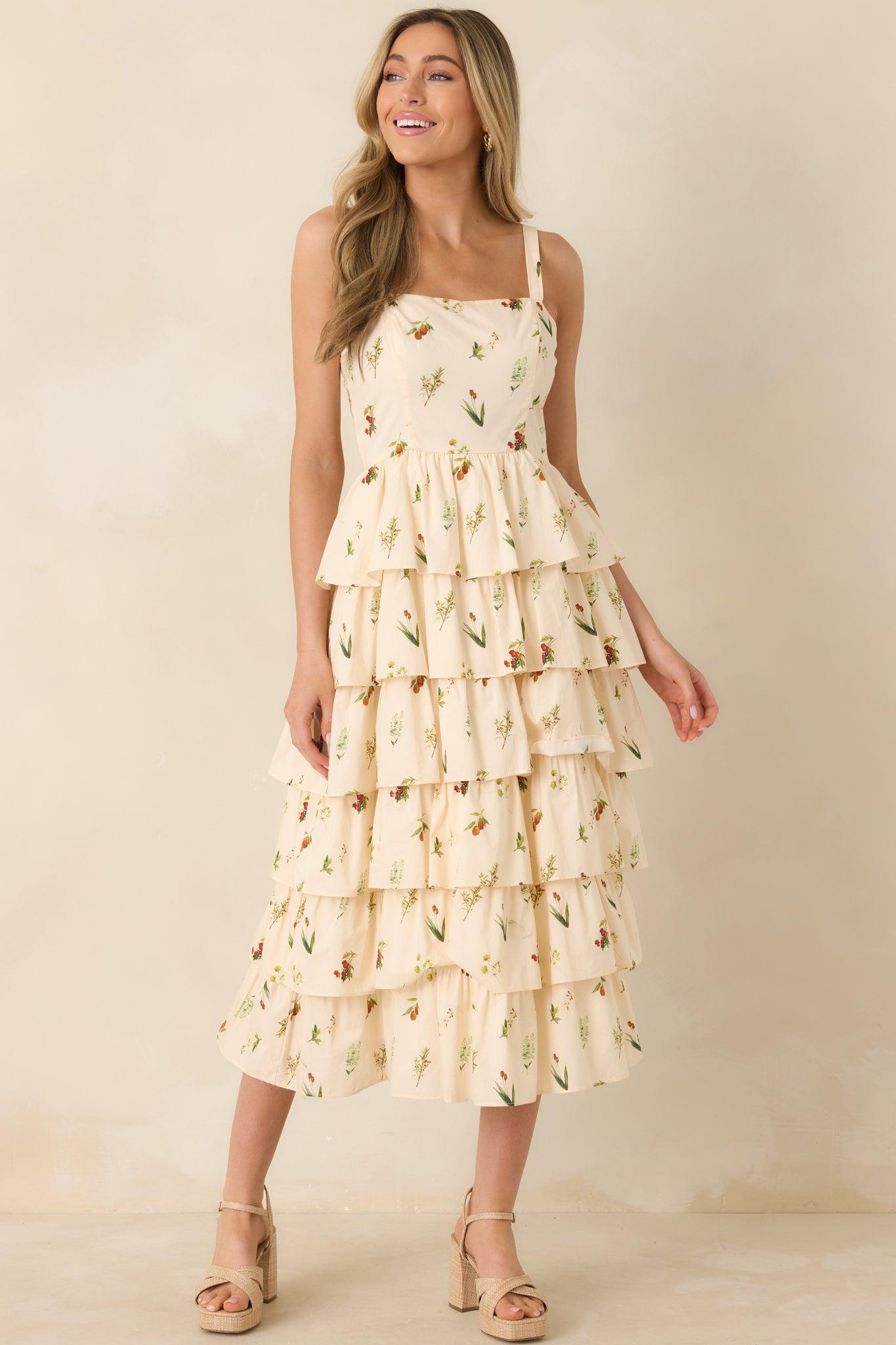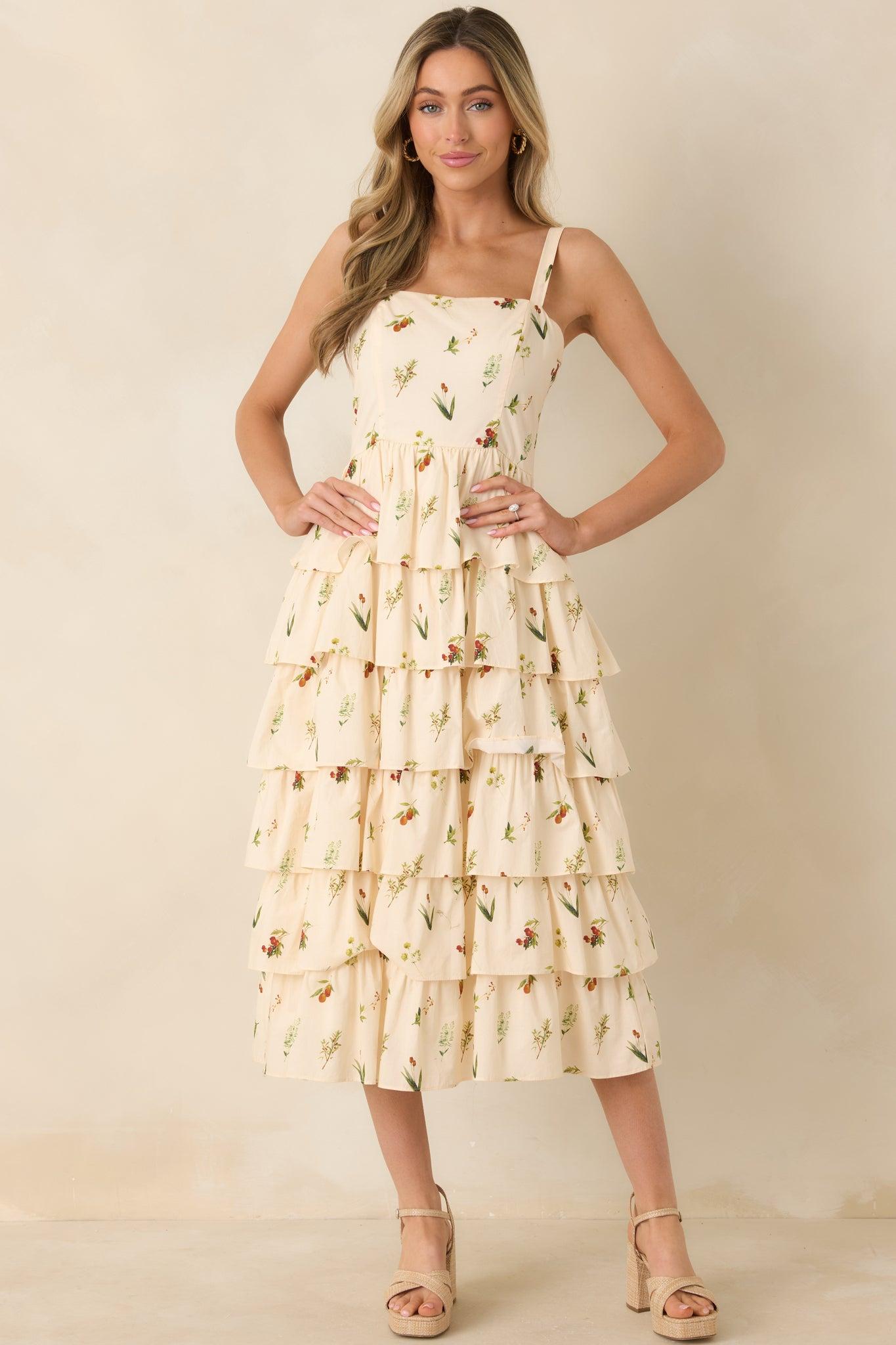 The Tell Me Everything Ivory Multi Floral Print Cotton Midi Dress has that easy, chatty charm, like catching up over coffee or spilling the latest tea with friends—playful, pretty, and made for moments full of stories. This ivory midi dress features a multicolor floral print, square neckline, sleeveless, elastic shoulder strap inserts, paneled bodice design, tiered skirt, and a hidden back zipper closure. 100% Cotton Lined: 100% Cotton Hand Wash Cold Manufactured in China Designed in The USA Model is 5'6" and Wearing a Size Small