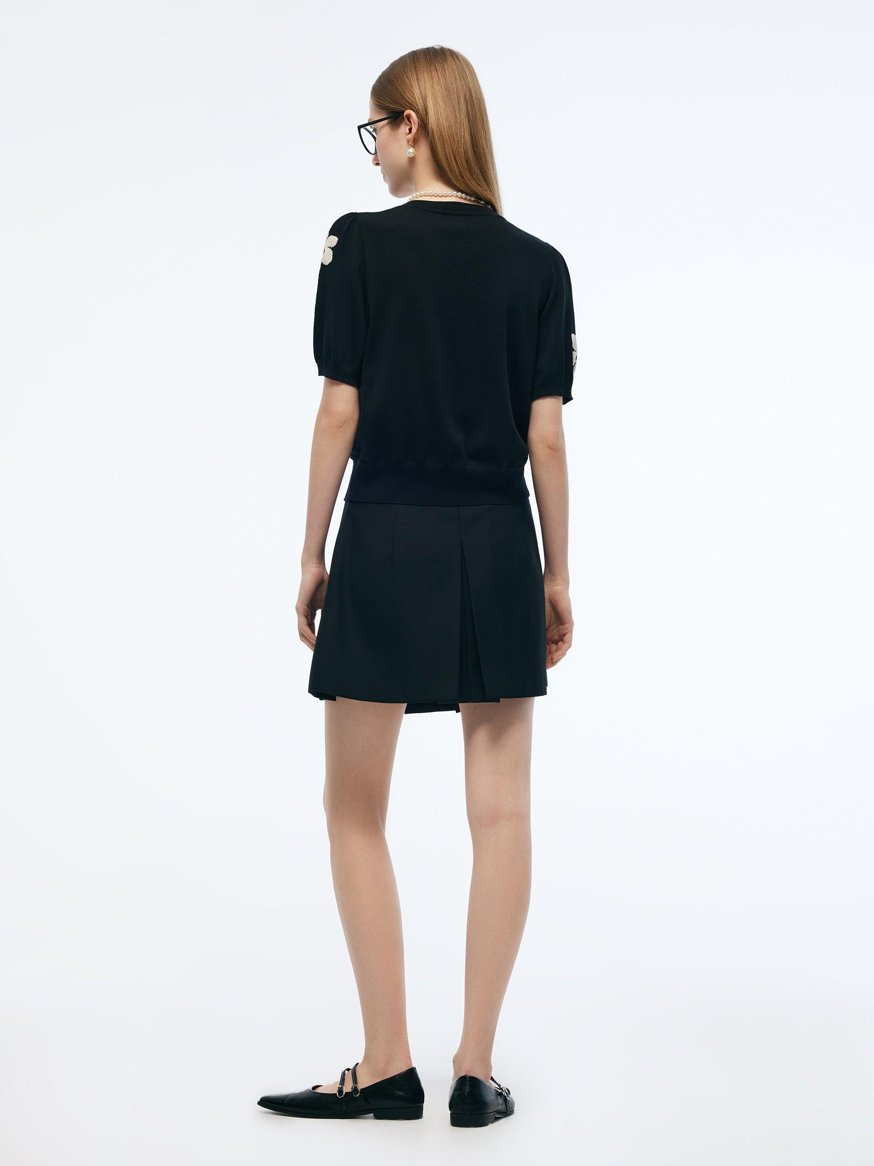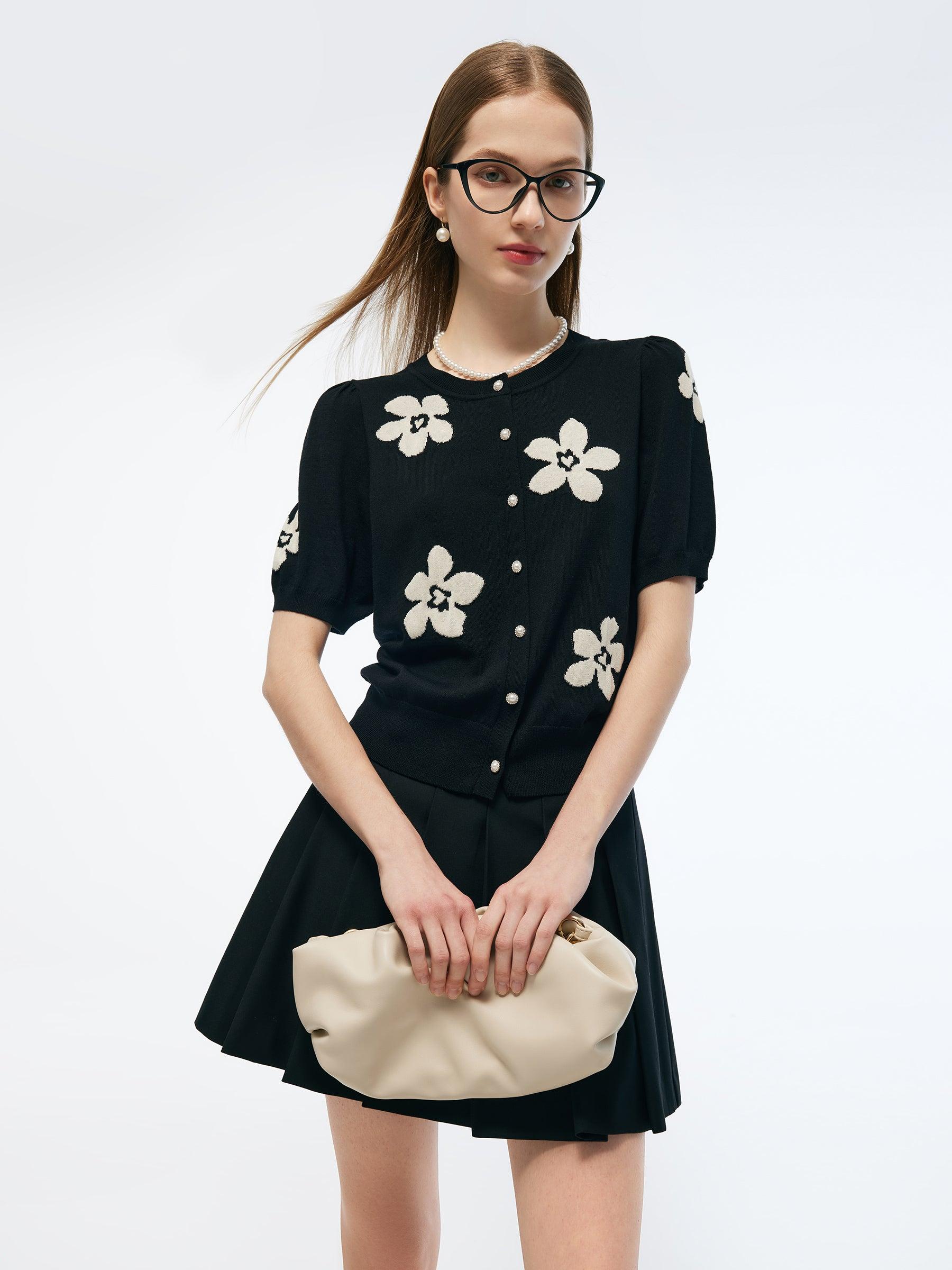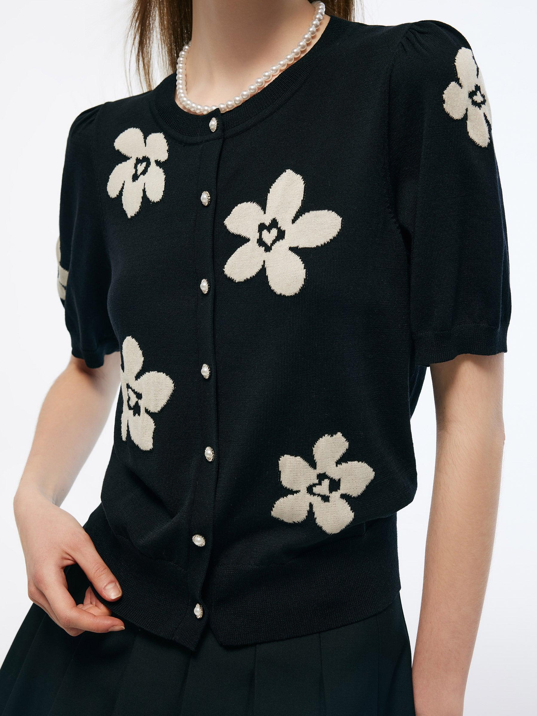 -Tencel and mulberry silk blend fabric -Puff-sleeved design -Breathable Crafted from a luxurious mix of Tencel and silk, this cardigan has excellent breathability and moisture-wicking properties. Delicate white flowers bloom over a sheer mesh knit, adding dimension and charm. Finished with pearl gemstone buttons and a