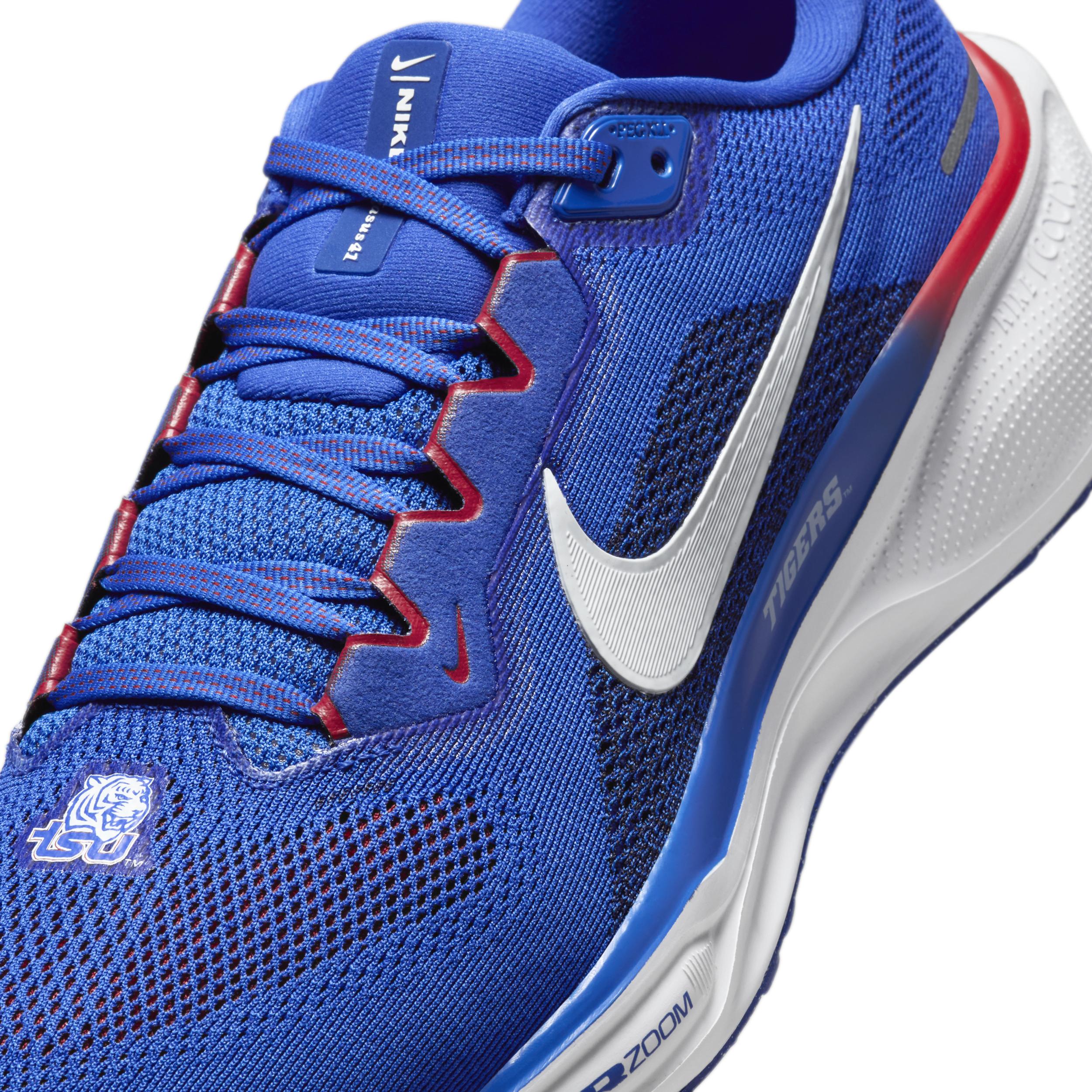 Responsive cushioning in the Pegasus provides an energized ride for everyday road running. Experience lighter-weight energy return with dual Air Zoom units and a ReactX foam midsole. Plus, improved engineered mesh on the upper decreases weight and increases breathability. Key Features:Upgraded breathable engineered mesh upper ReactX foam midsole surrounds forefoot and heel Air Zoom units for an energized ride. Signature waffle-inspired rubber outsole for traction and flexibility Plush collar tongue and sockliner for a secure and comfortable fit What's new? All-new ReactX foam midsole is 13% more responsive than previous React technology. Crafted for performance and planet, ReactX foam is engineered to reduce its carbon footprint by at least 43% in a pair of midsoles due to reduced manufacturing process energy compared to prior React foam. The carbon footprint of ReactX is based on cradle-to-gate assessment reviewed by PRé Sustainability B.V and Intertek China. Other midsole components such as airbags, plates or other foam formulations were not considered. Product Details:Weight: Approx. 297 g/10.4 oz (Men's US 10). Heel-to-toe drop: 10 mm. MR-10 Last - Our best, most consistent fit (same as Pegasus 40). Reflective details. Not intended for use as Personal Protective Equipment (PPE). Style: FZ5146; Color: Hyper Royal/White/Fire Red/White; Size: 7; Gender: Male; Age Group: Adult | Tennessee State Pegasus 41 Men's Nike College Road Running Shoes in Blue, Size: 7 | FZ5146-400