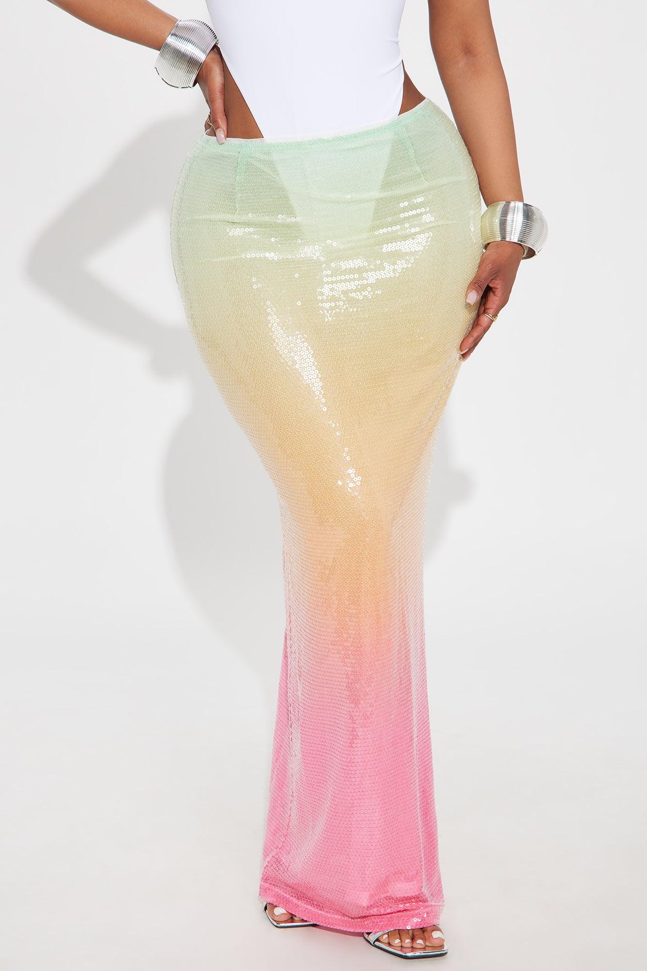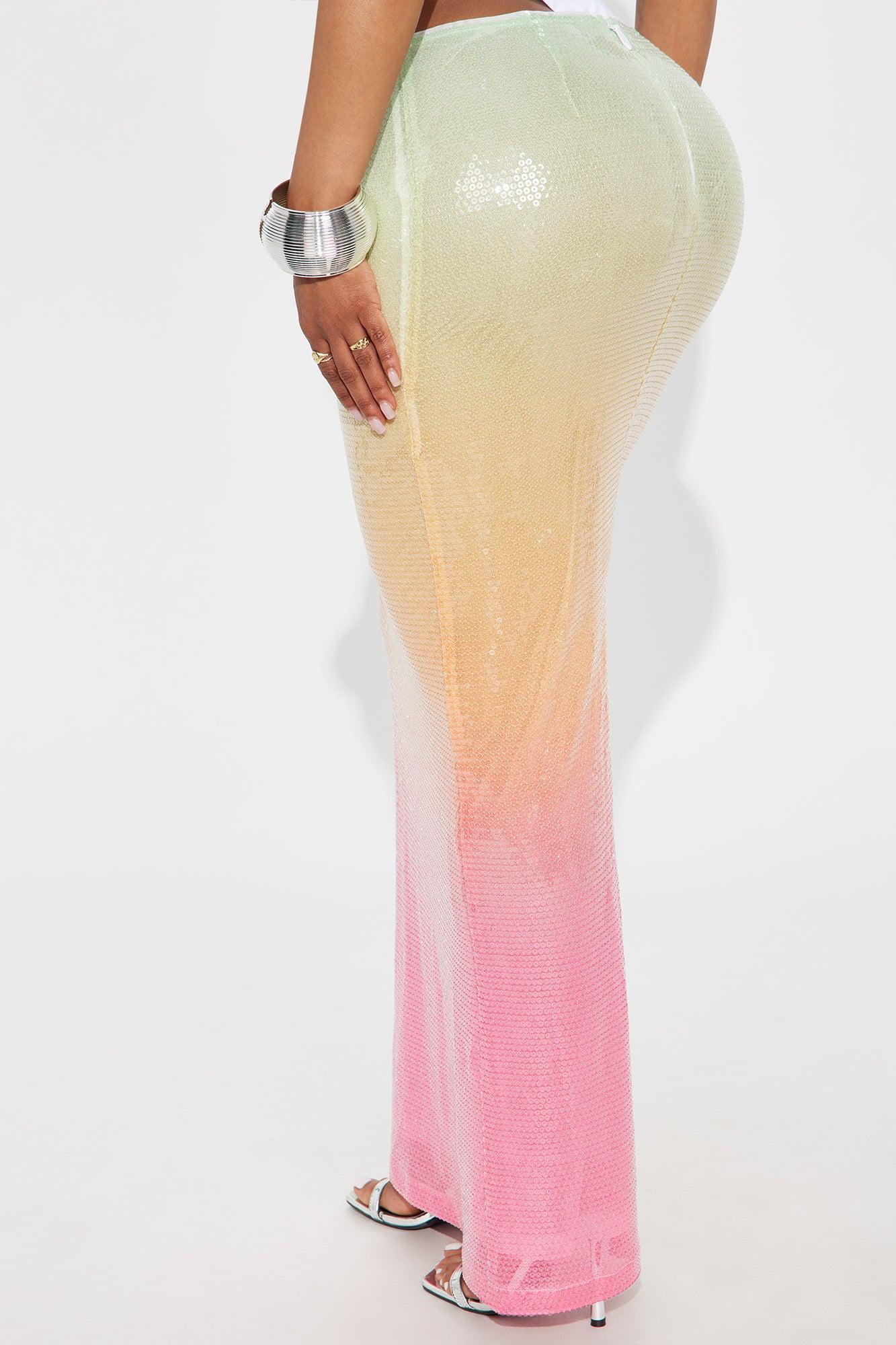 Available In Multi Color. Maxi Skirt Zipper Closure Low Rise Back Slit Ombre Sequin Stretch 40" Length Self: 100% Polyester Lining: 92% Polyester 8% Spandex Imported California Proposition 65WARNING: Cancer and Reproductive Harm - www.P65Warnings.ca.gov.