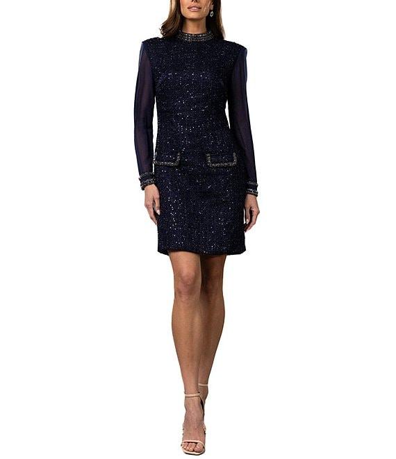 From Terani Couture, this dress features: Sheath silhouette Tweed fabrication Beaded mock neckline Long illusion sleeves with beaded cuff Faux front pockets with beading Zip back closure Lined Approximate length 36" Polyester Dry clean Imported.