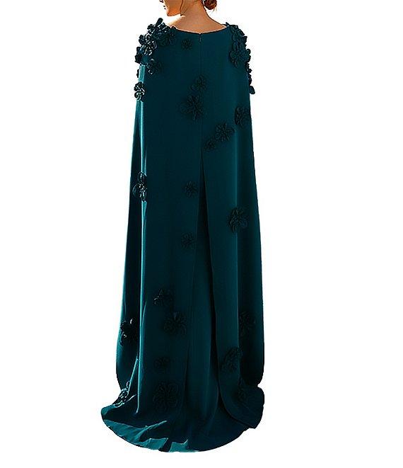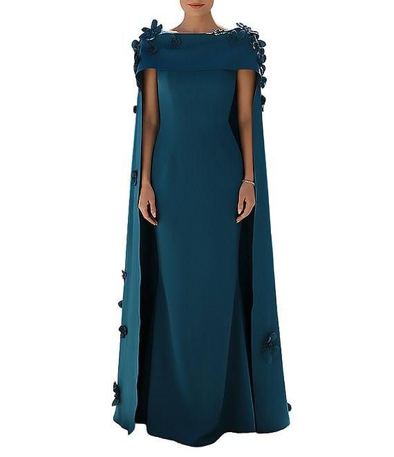 From Terani Couture, this dress features: Crepe fabrication Sheath silhouette Crew neckline Cape overlay 3D Floral appliques Zip back closure Approx. 46" length from waist Polyester Dry clean Imported.