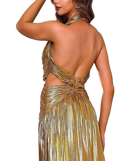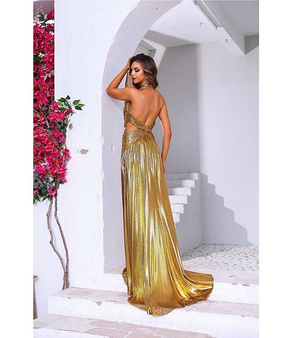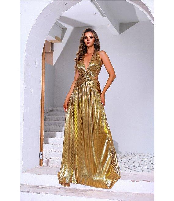 From Terani Couture, this gown features: Aline silhouette Foiled chiffon fabrication Deep V halter neckline Sleeveless Side cut outs Zip back closure Pleated crisscross drop waist Shirring at waist seam Zip back closure Lined Approx. 60" length Polyester Dry clean Imported.