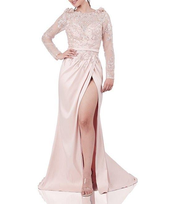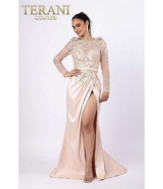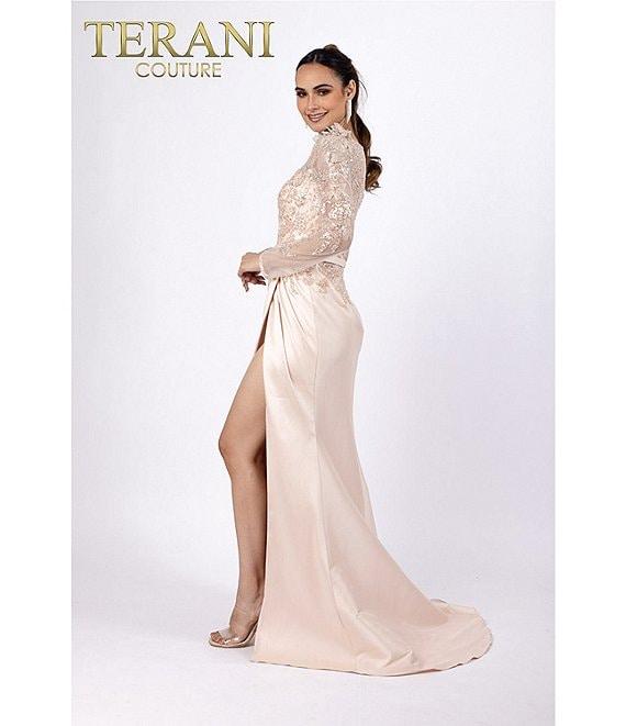 From Terani Couture, this dress features: Stretch mikado fabrication A line silhouette Crew neckline Long illusion sleeves Zip back closure Approx. 60" length Polyester Dry clean Imported.