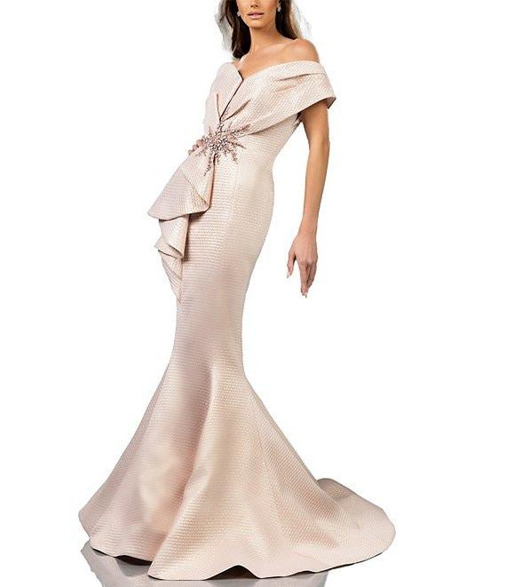 From Terani Couture, this gown features: Mermaid silhouette Jacquard fabrication Asymmetrical neckline One shoulder 3D Ruffle front detail with beading Zip back closure Lined Approximate length 60" Polyester Dry clean Imported.