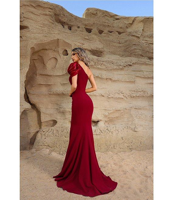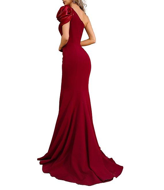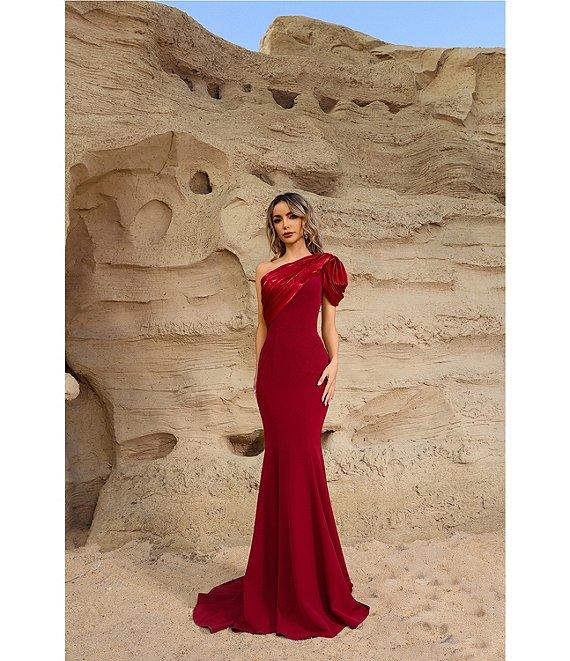 From Terani Couture, this dress features: Stretch satin fabrication Mermaid gown silhouette One shoulder neckline One short sleeve Zip back closure Approx. 60" length Polyester Dry clean Imported.