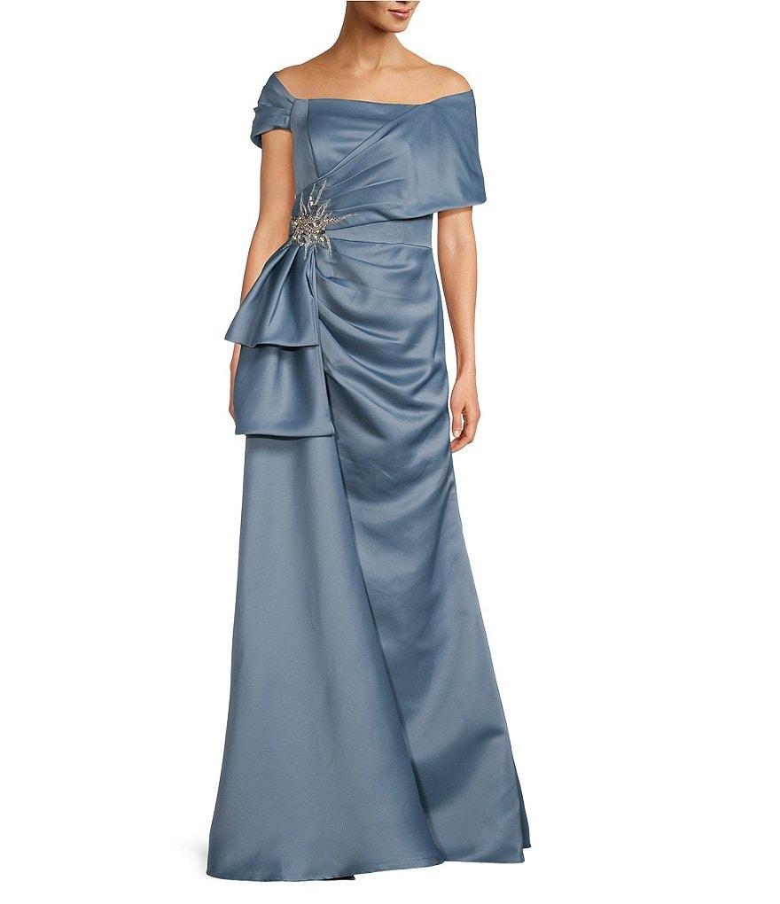 From Terani Couture, this dress features: Satin fabrication Ball gown silhouette Off the shoulder neckline Short sleeves Front drape with rhinestone detail Lined Back zipper closure Approx. 48" length Polyester Dry clean Imported.