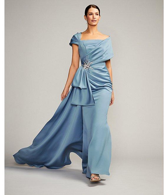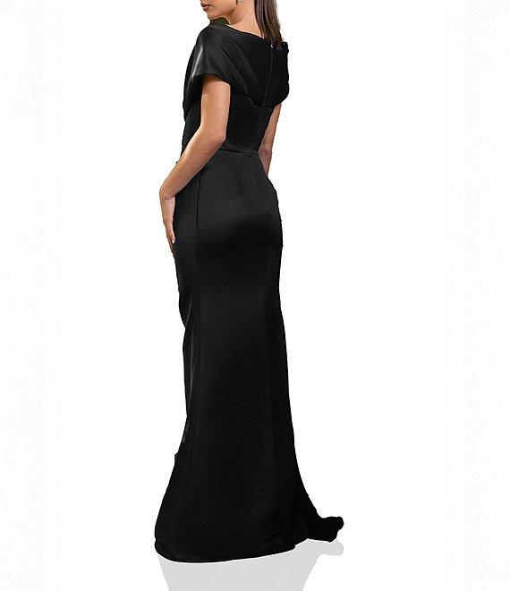 Terani Couture Satin Off The Shoulder Neck Short Sleeve Front Rhinestone Drape Gown