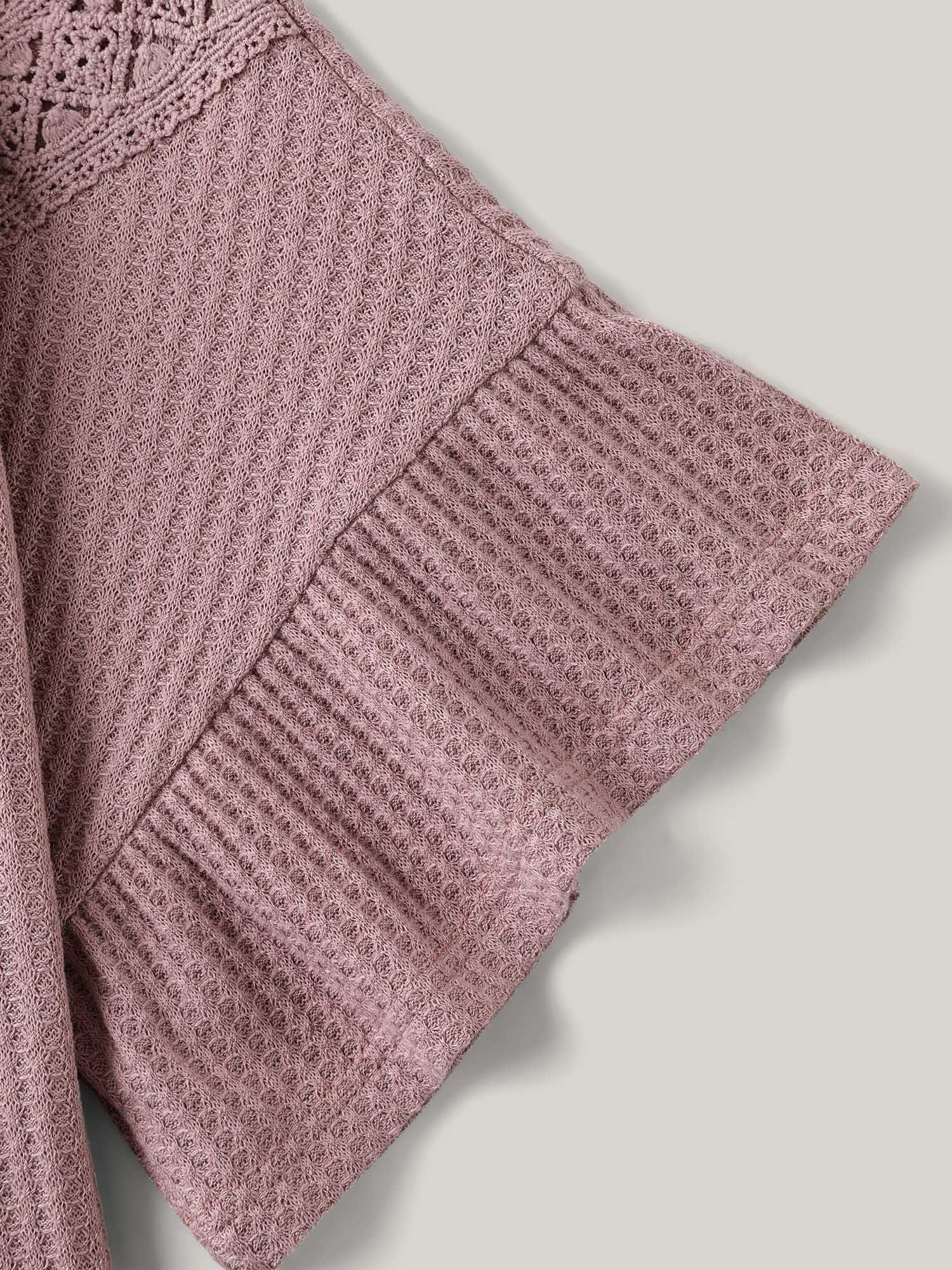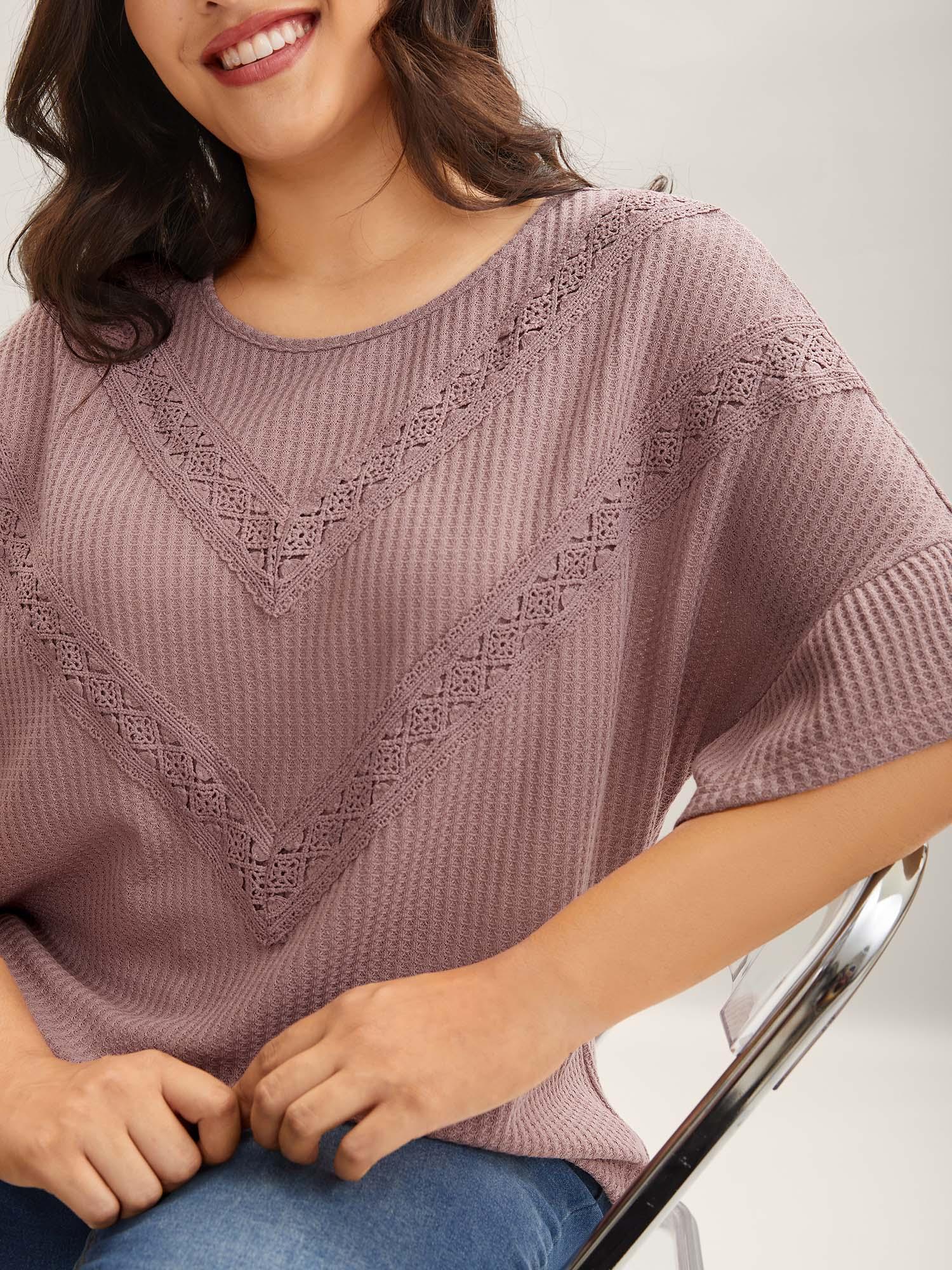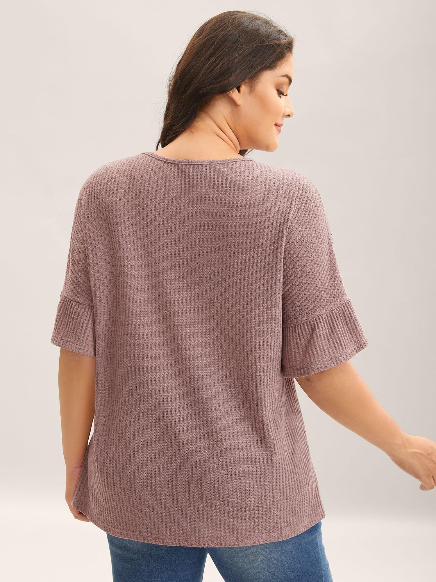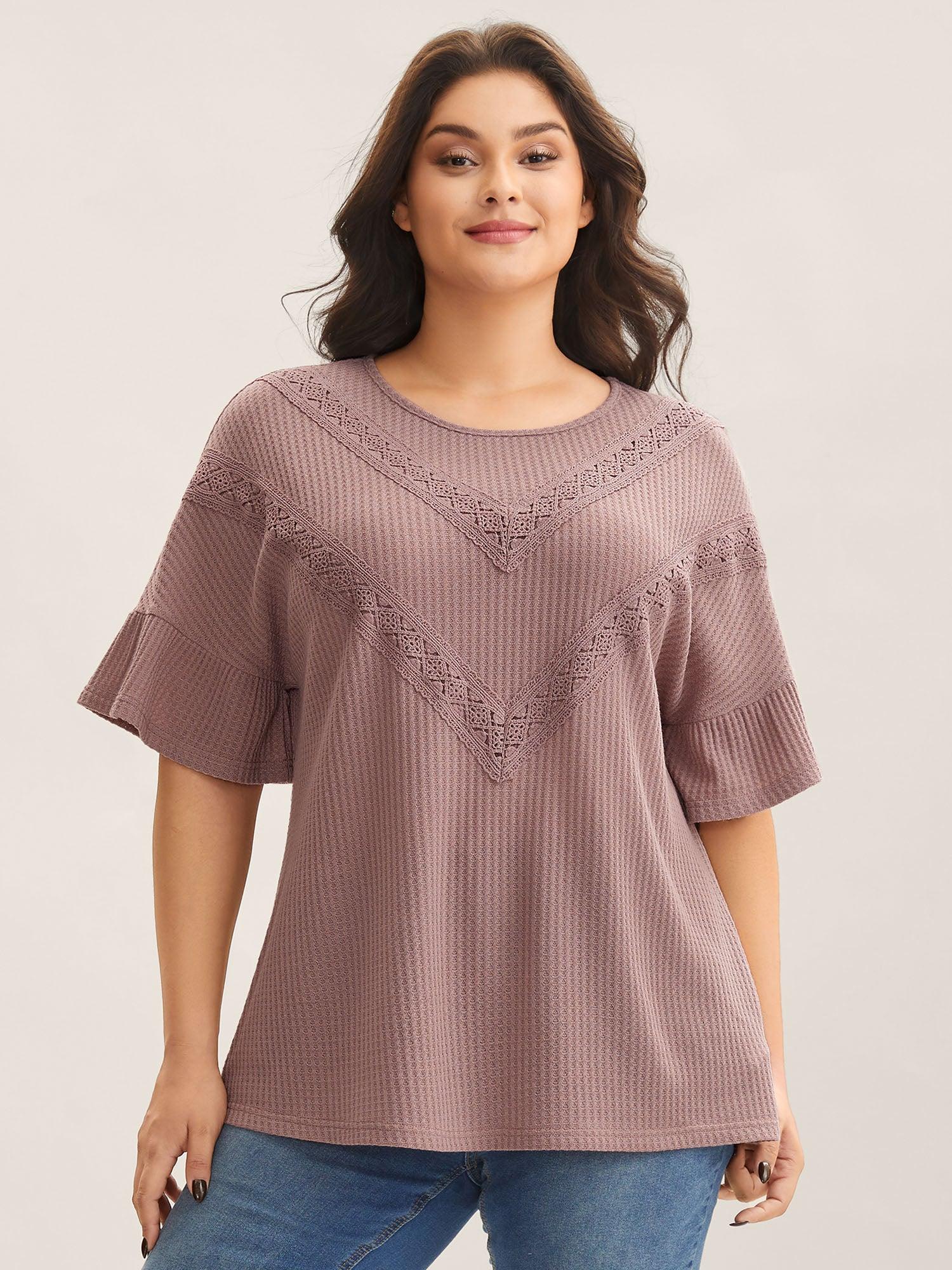 Shop Textured Lace Ruffled Sleeve T-Shirt now and redefine your style with confidence at BloomChic. Tailored for mid and plus-size women. This trendy Tops Women, sizes 10-30. Color:Rouge;Prints:Non;Neckline:Round Neck;Sleeve Type:Ruffle Sleeve;Details:Woven ribbon&lace trim, Texture;Pocket:No-pocket