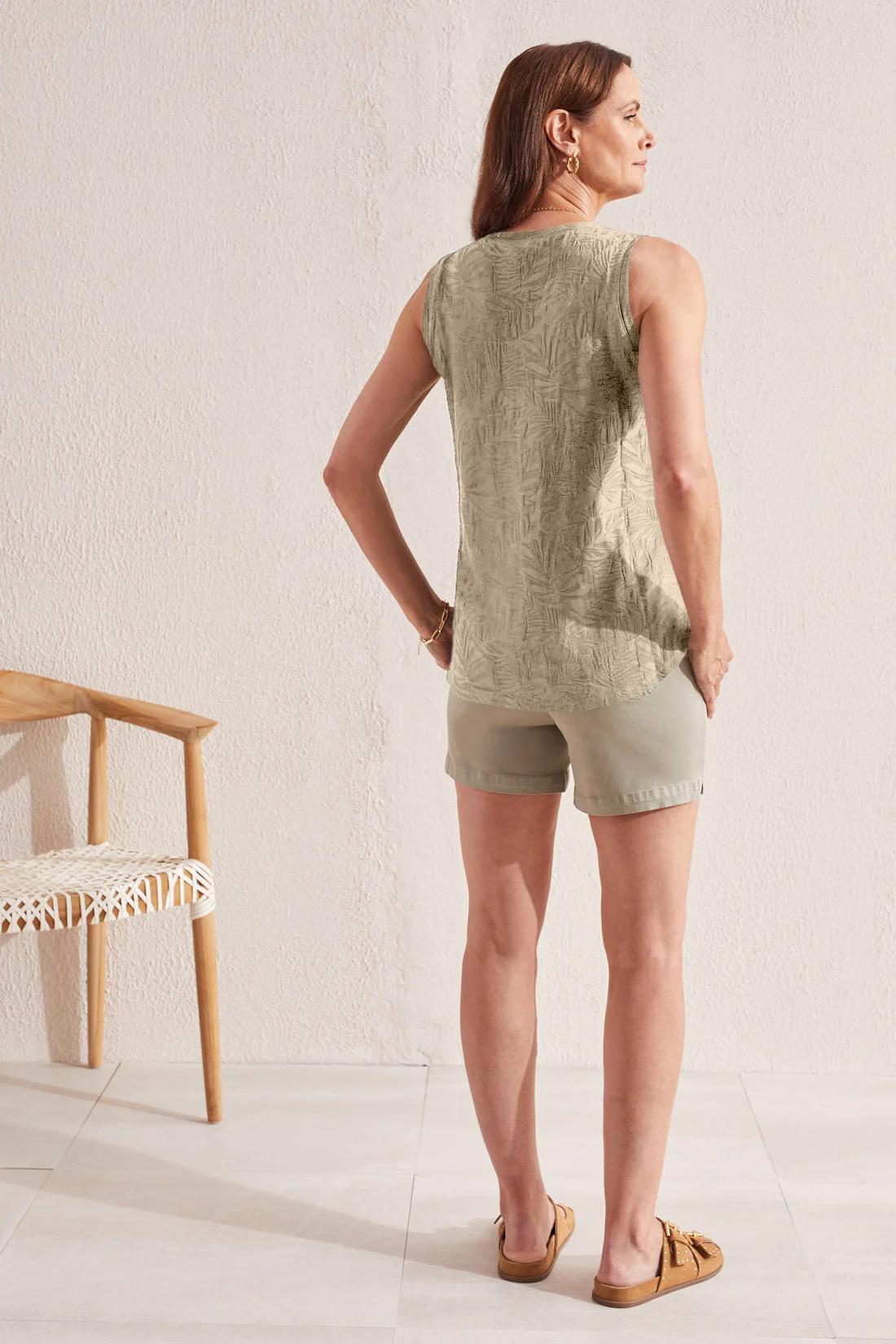 Bring out your everyday flow with this sleeveless v-neck top featuring fluttering side slits and a textured knit construction. The self-cleaning band helps keep pesky stains at bay and the curved hemline adds casual elegance to this classic staple.