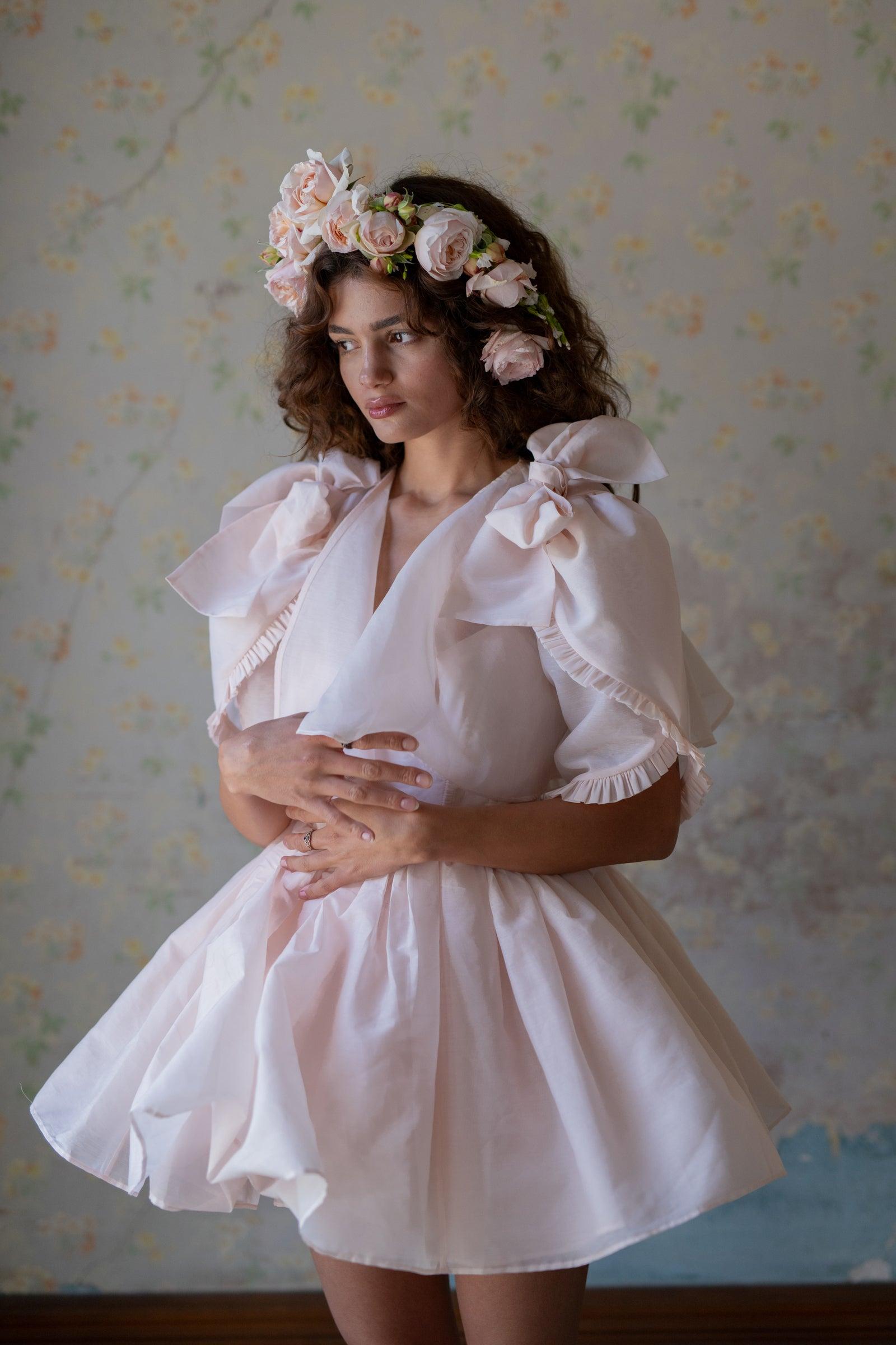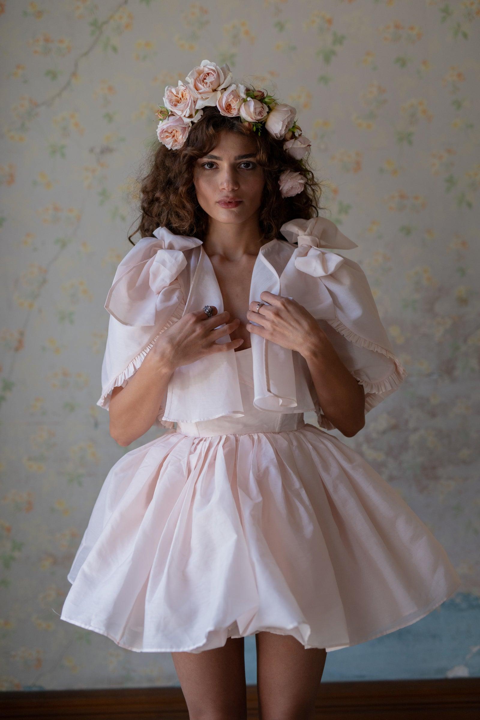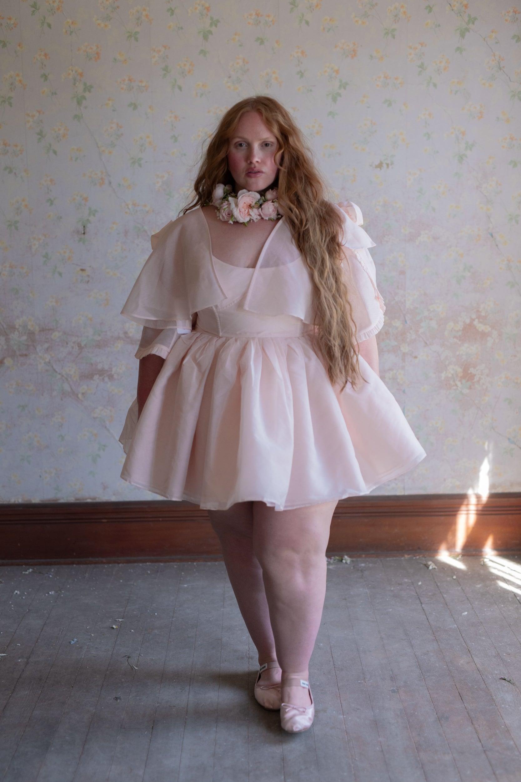 Evocative of a caterpillar's metamorphosis, shedding its chrysalis and unveiling vibrant wings, this cotton gauze capelet effortlessly cascades across the body. Cast in the dreamy pink shade of a butterfly's stained wings, it is further elevated by delicate bow details adorning the shoulders. Style with the Blush Veuve Dress to complete the look. Poly organdy cropped capelet Bow details at shoulder Unlined To ensure the best fit, measure your across bust before ordering and steam for optimal beauty. Vie is 5’8” and wearing a size XXS in Selkie. Her measurements are 31” bust, 23” waist, 36” hip. Lynley is 5’4” and wearing a size 1X in Selkie. Her measurements are 45” bust, 37” waist, 54” hip. For more specifics, please text our help line. Fabric: 100% Polyester Designed and fit in LA, Made in partnership with our reputable and expert production team in Jianying, China. Our products are made with the utmost in quality by some of the best craftsman in the industry. Learn more about our team and see our facilities!