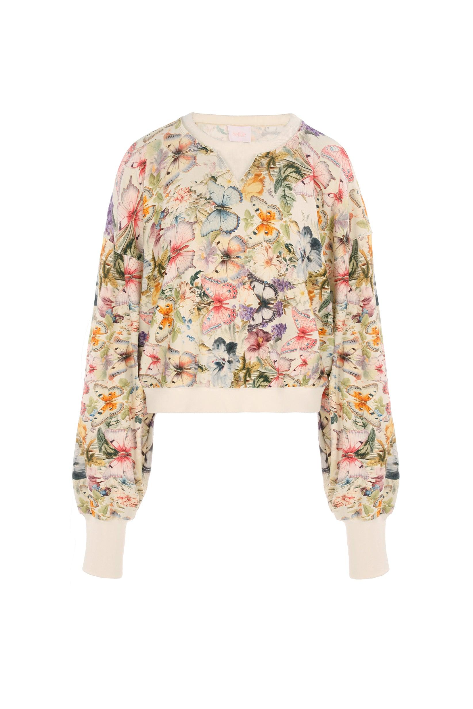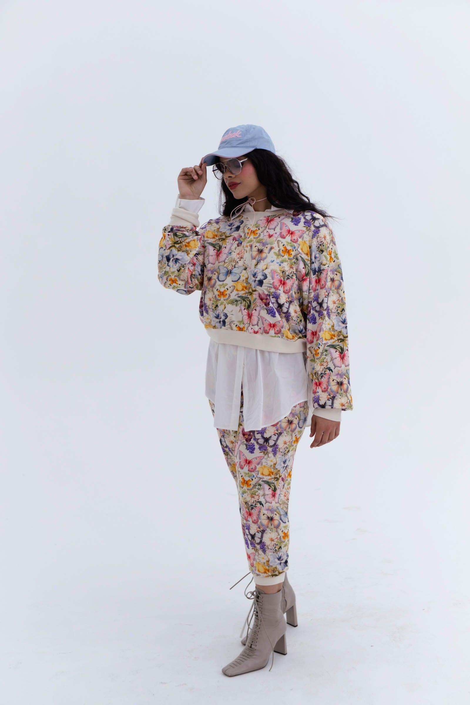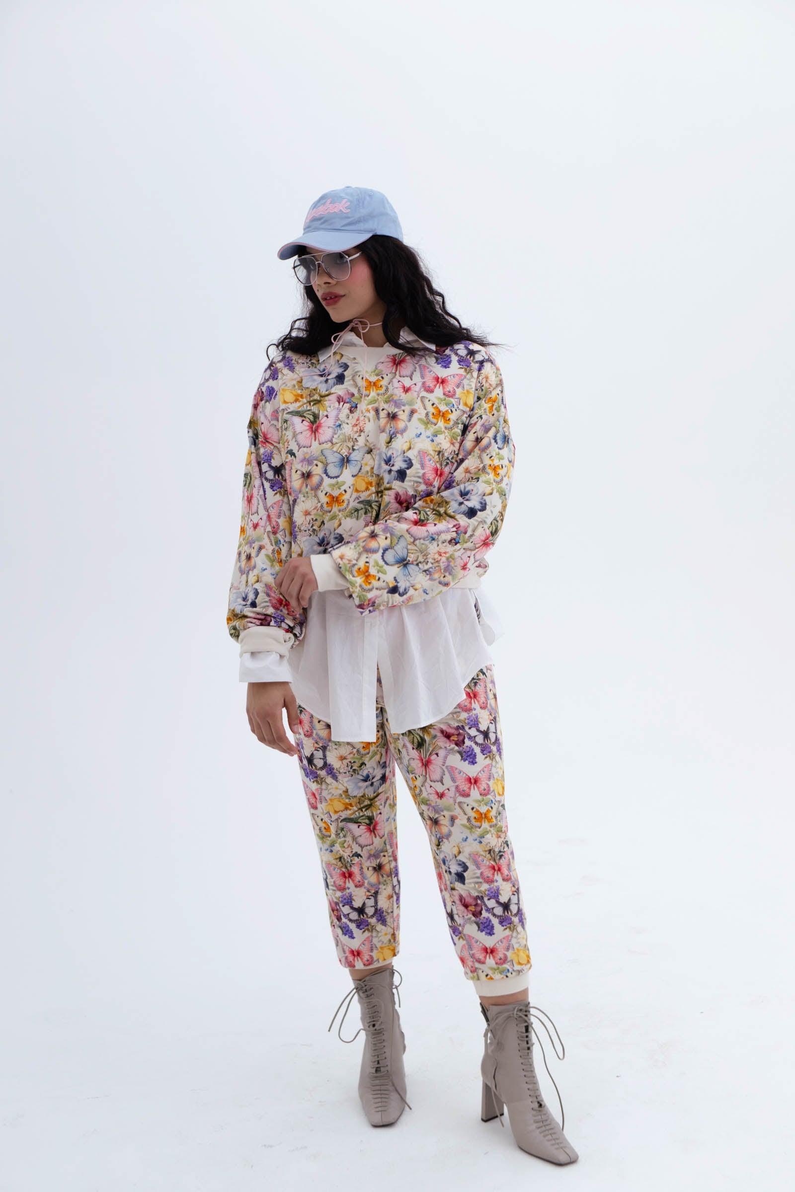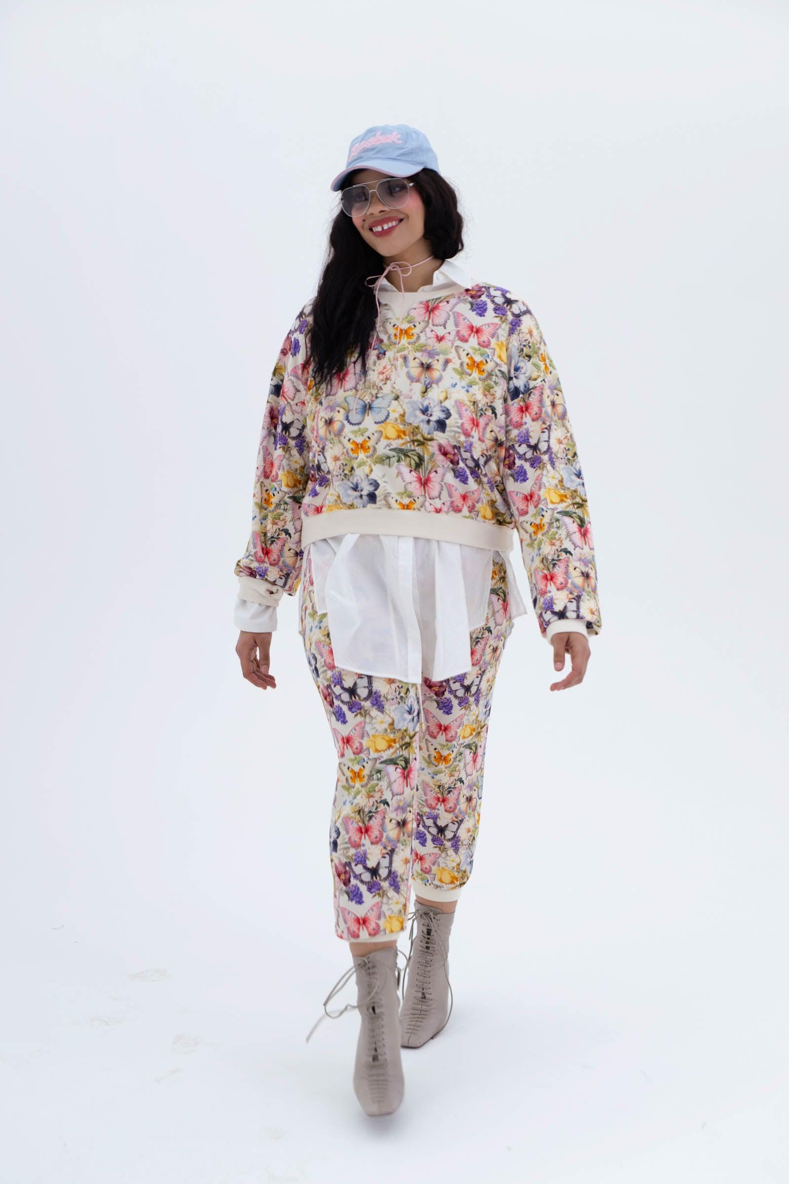 Wrap yourself in the cozy cocoon of our Huggable Sweater, adorned with a vibrant tapestry of colorful butterflies with its perfect slouchy fit and just-right crop, complemented by a drop-shoulder. Pair with the Butterfly Botanics Sleepover Pants to complete the look. Oversized stretchy, fleece pullover sweater Scoop neck with drop shoulder To ensure the best fit, measure your bust before ordering and steam for optimal beauty. For more specifics, please text our help line. Mariah is 5’10” and wearing a size XL in Selkie. Her measurements are 44” bust, 36” waist, 48” hip. Fabric: 70% Modal 26% Cotton 4% Spandex Care: Gently hand wash cold, lay flat to dry or dry clean