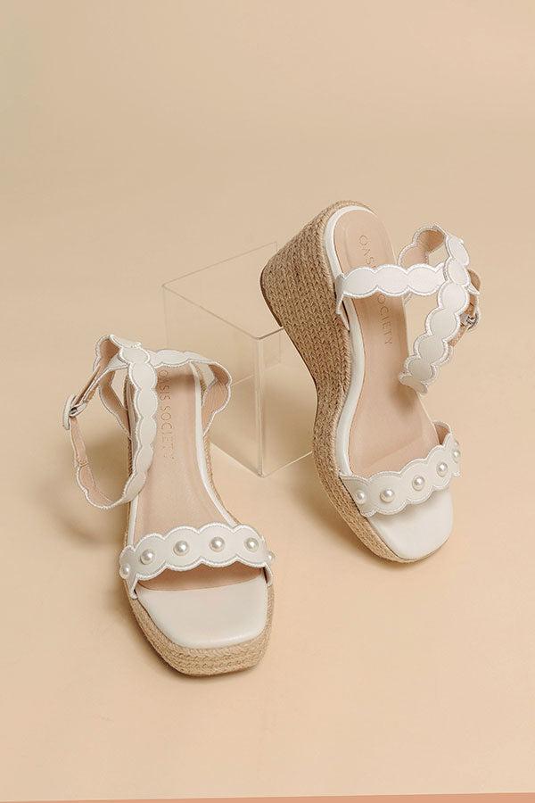 Soft, elegant, and timeless, these pearl embellished espadrille wedges are designed to elevate warm-weather looks with effortless charm. Featuring smooth faux leather straps in a creamy ivory hue, this style is accented with delicate scalloped edges and pearl embellishments for a refined, feminine finish. The jute-wrapped espadrille wedge provides flattering height while remaining lightweight and stable, and the cushioned footbed ensures comfortable wear throughout the day. An adjustable ankle strap offers a secure, customized fit-perfect for special occasions or all-day events. Details: Faux leather upper Scalloped strap design with pearl accents Jute-wrapped espadrille wedge Open-toe silhouette Wedge Height: 4 inches Fit: Runs true to size, If in-between sizes we recommend going the next size up Oasis Society's signature DreamCloud cushioned sole for lasting comfort Stable espadrille wedge for easy walking Adjustable ankle strap with buckle closure