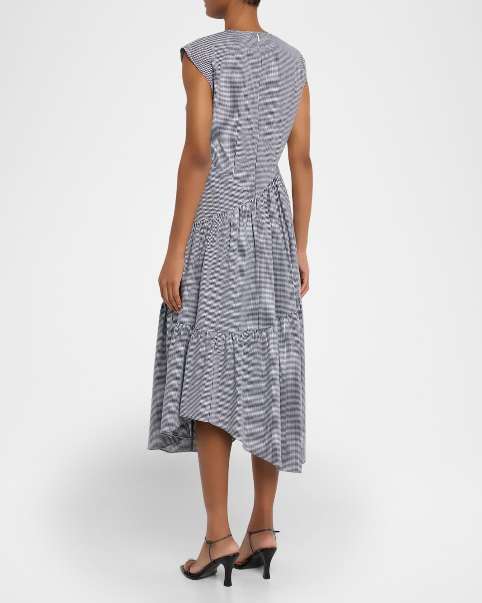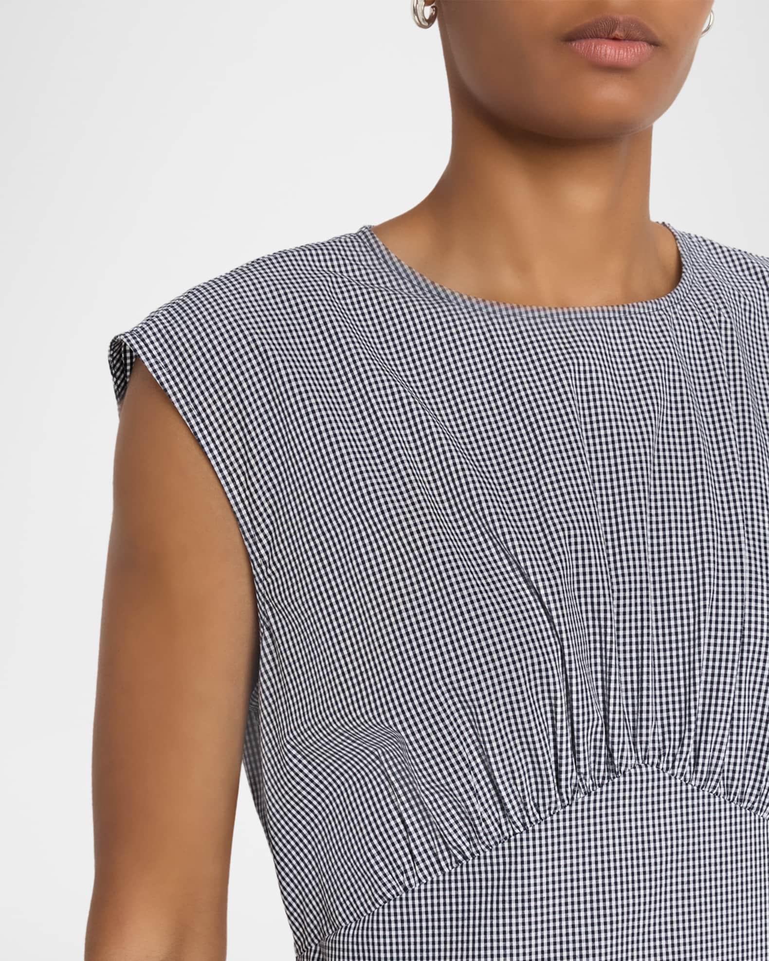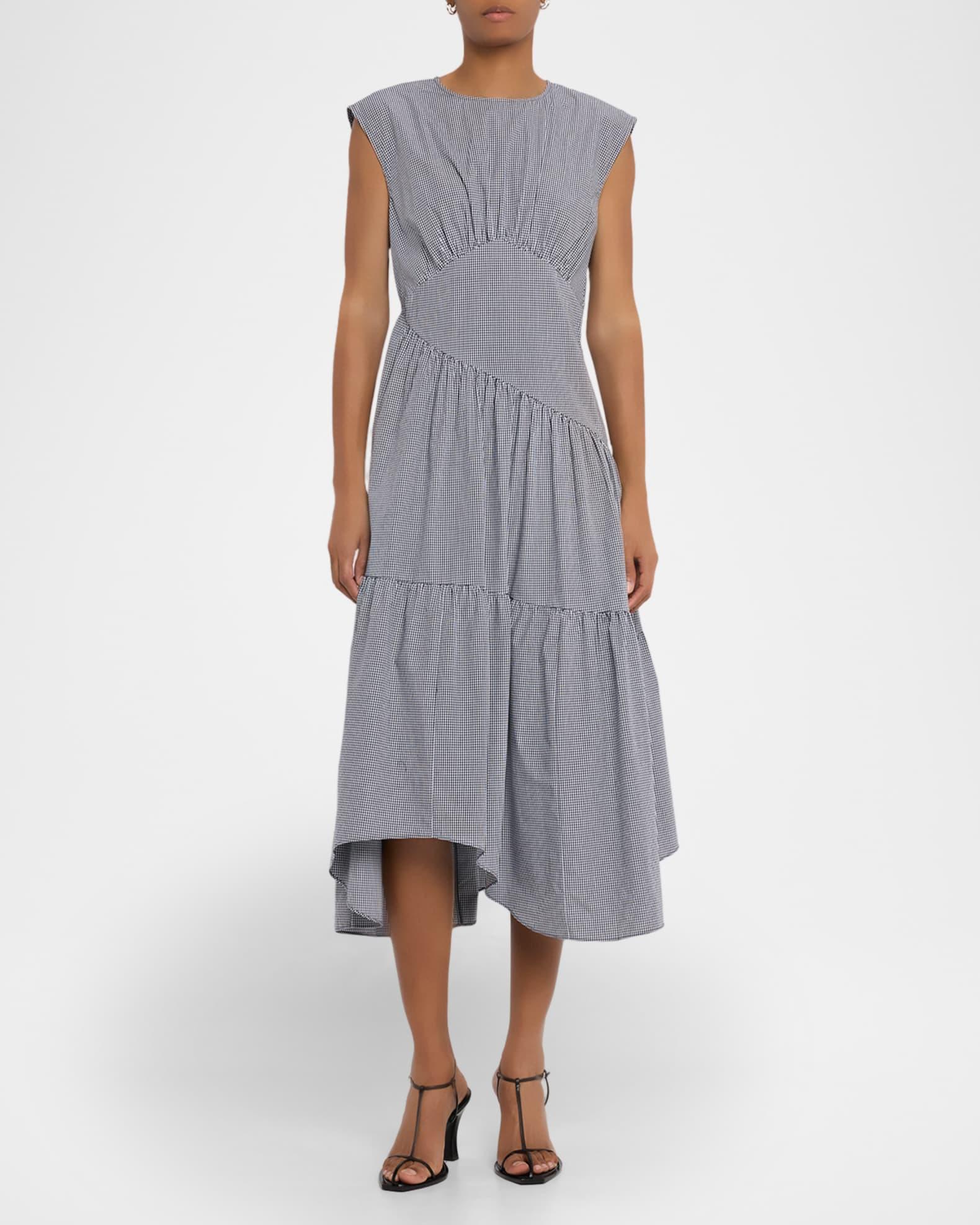 FRAME gathered cotton midi dress decorated in a micro-check print Crew neckline Sleeveless Tiered, A-line silhouette Hem falls below the knee Center back zip Cotton Imported