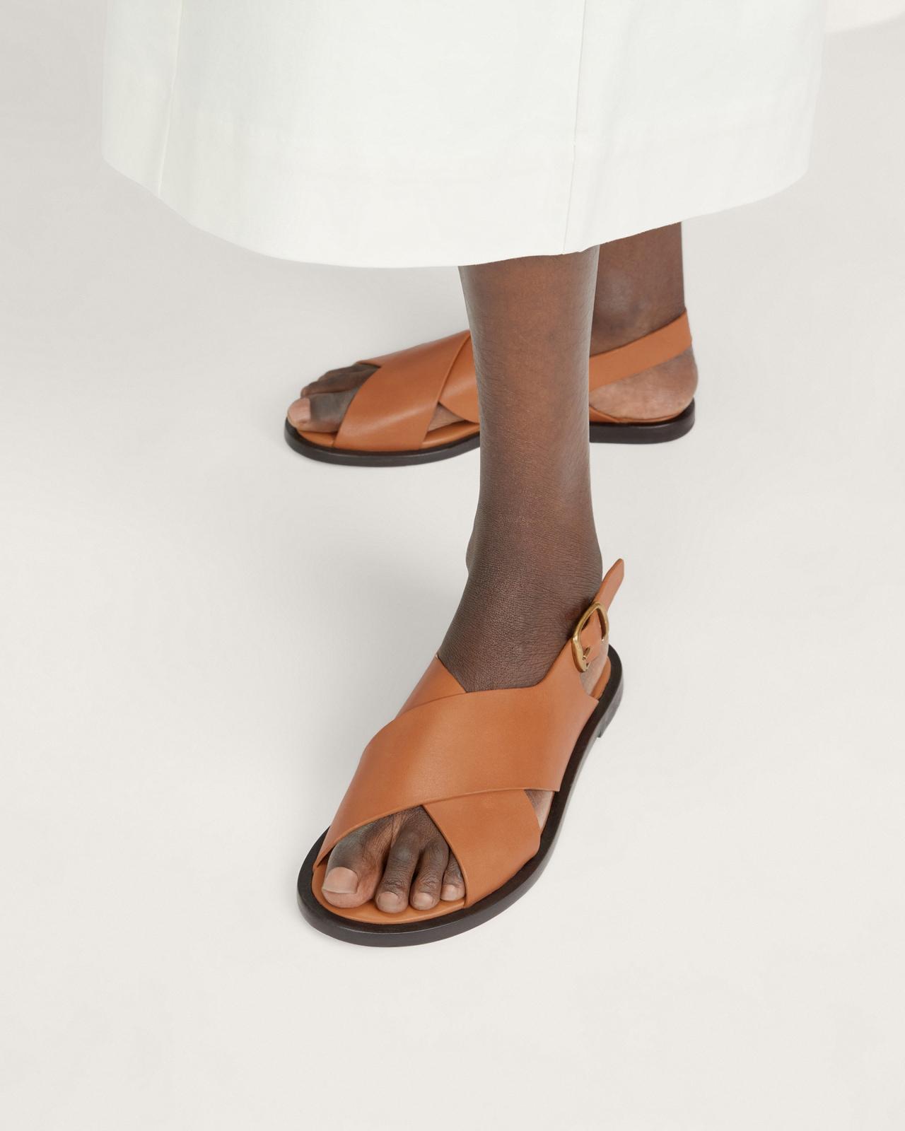 City slicker. The City Crossover Sandal features a leather crisscross upper with a raw inked edge a leather welt and stacked outsole with an adjustable buckle strap. Denim shorts dressesthis sandal is the perfect addition to your Summer wardrobe. Plus with the adjustable strap you dont have to worry about these slipping off on your warm weather excursions. City Crossover Sandal by Everlane in Desert Tan, Size 7