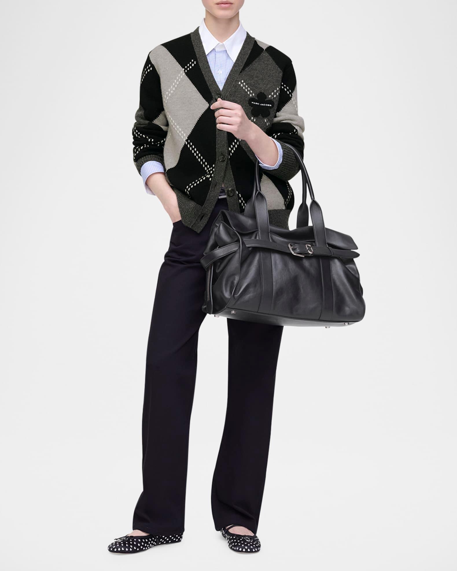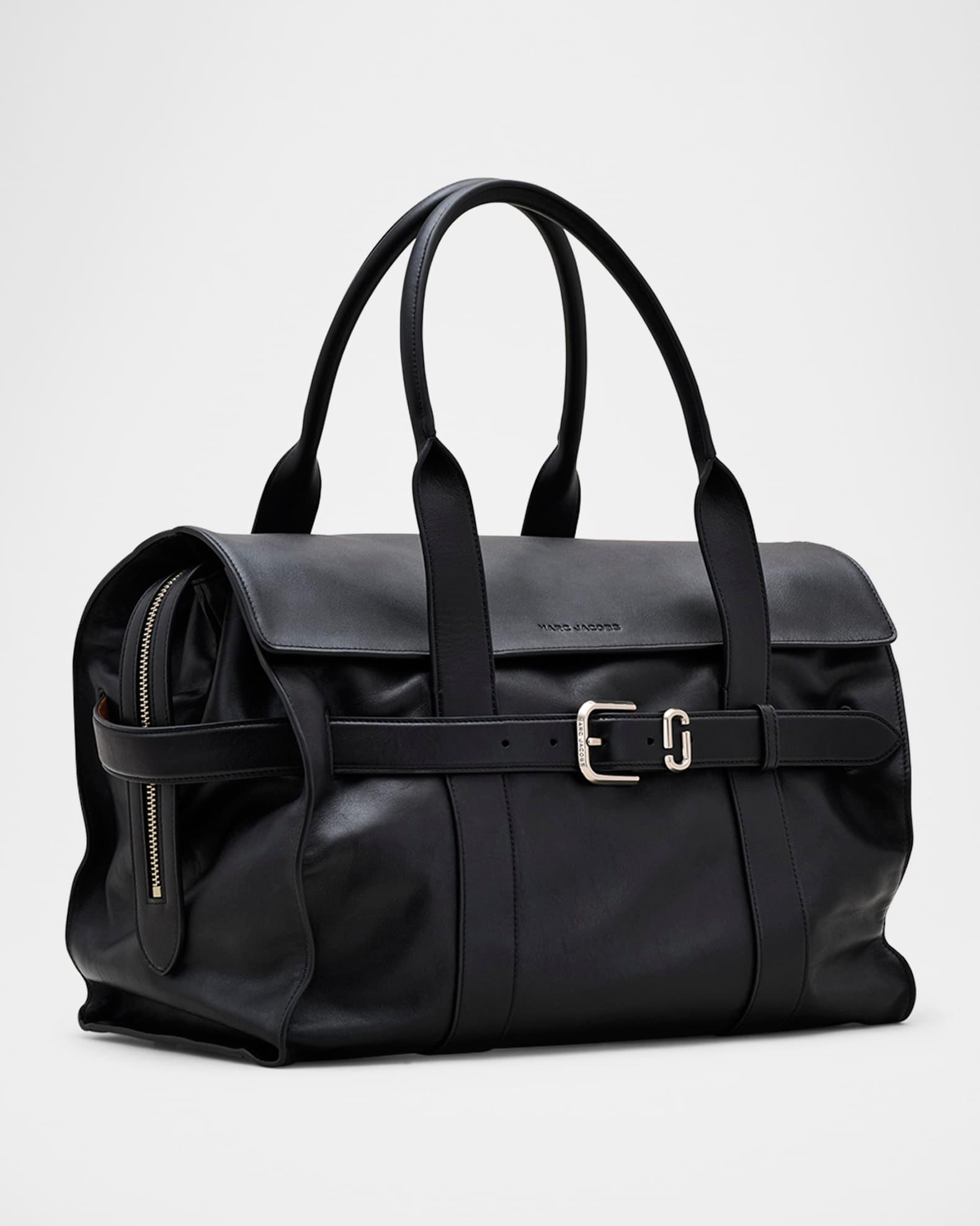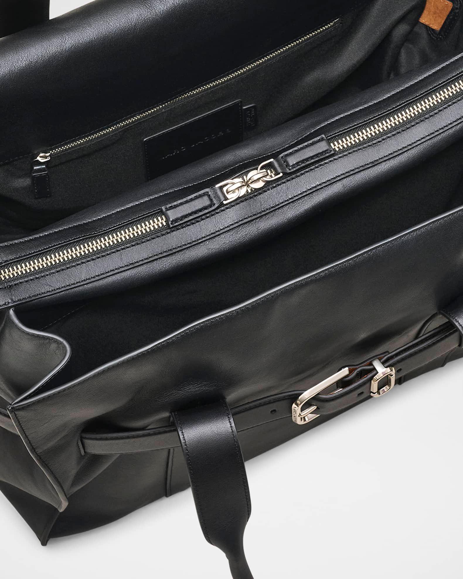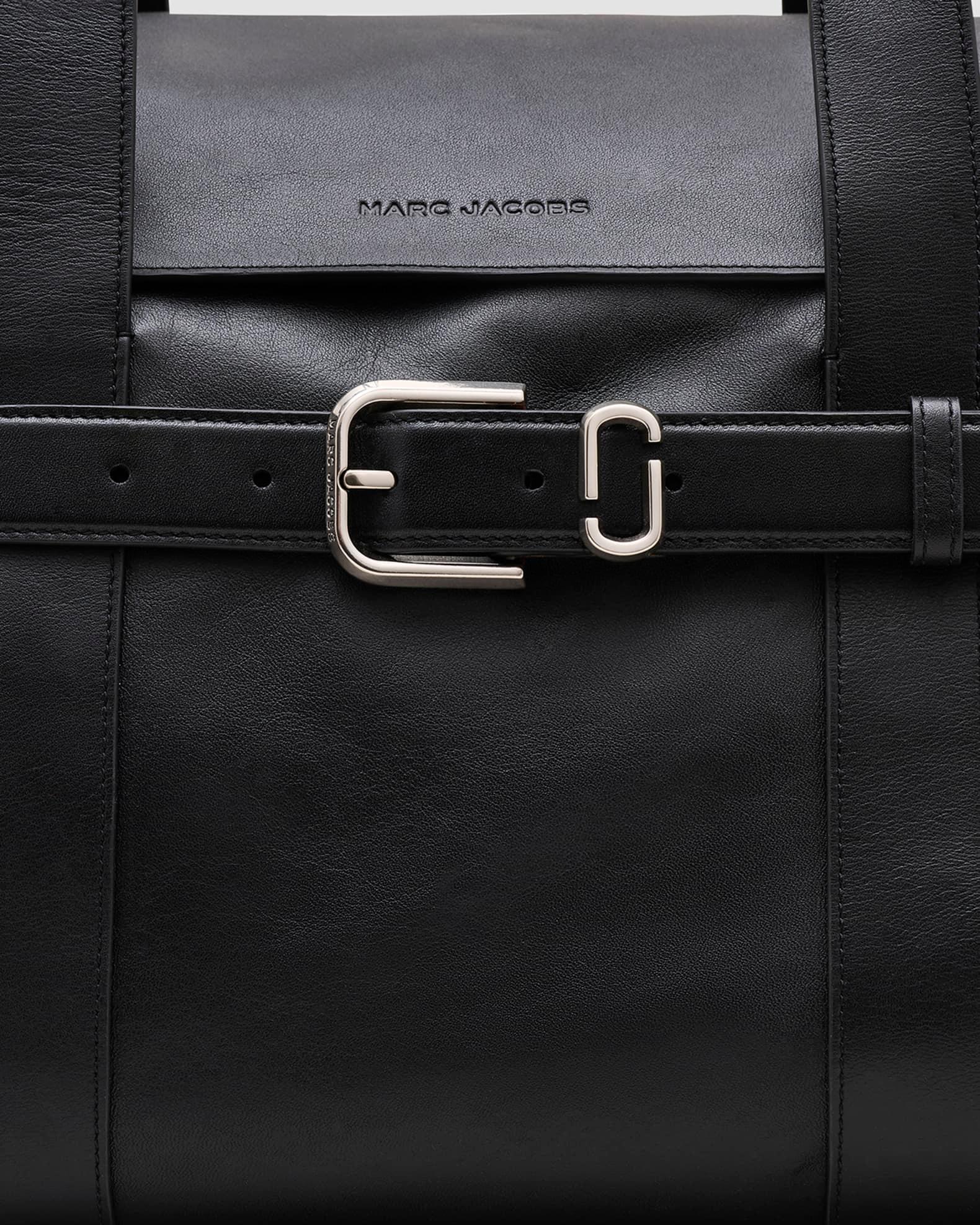A modern design with a soft and unstructured silhouette, this Marc Jacobs "The Dakota" tote bag is crafted in smooth leather and features an adjustable J Marc logo belt to cinch or relax the shape Rolled shoulder straps, 7.1" drop Flap top closure Two-way center zip divides the interior, one zip pocket and one slip pocket Lining: Cotton Feet protect the bottom of the bag Approx. 11.4"H x 16.1"W x 5.9"D Imported