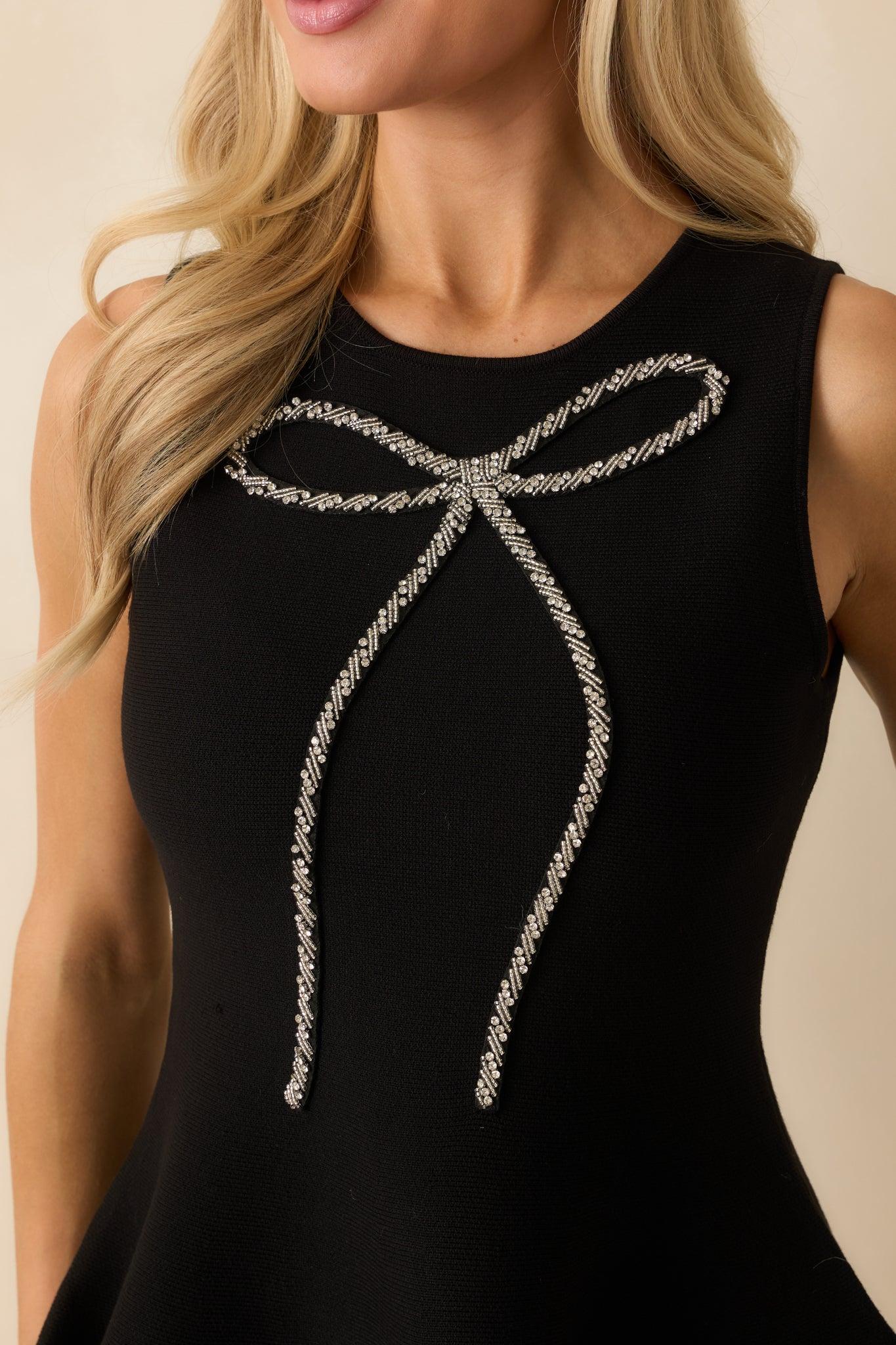 A little shine goes a long way, and The Finishing Touch Black Sleeveless Beaded Bow Peplum Top proves it beautifully. The beaded bow detail adds just the right amount of sparkle, while the soft peplum hem gives your look a polished, feminine finish. Pair it with denim or dress it up for the holidays — it’s the kind of standout staple that completes any outfit effortlessly. This black sleeveless top features a crew neckline, beaded bow embellishment, fitted bodice, and a soft flared peplum hem with a pullover design. 72% Viscose & 28% Polyester Unlined Hand Wash Cold Manufactured in China Designed in The USA Model is 5'8" and Wearing a Size X-Small