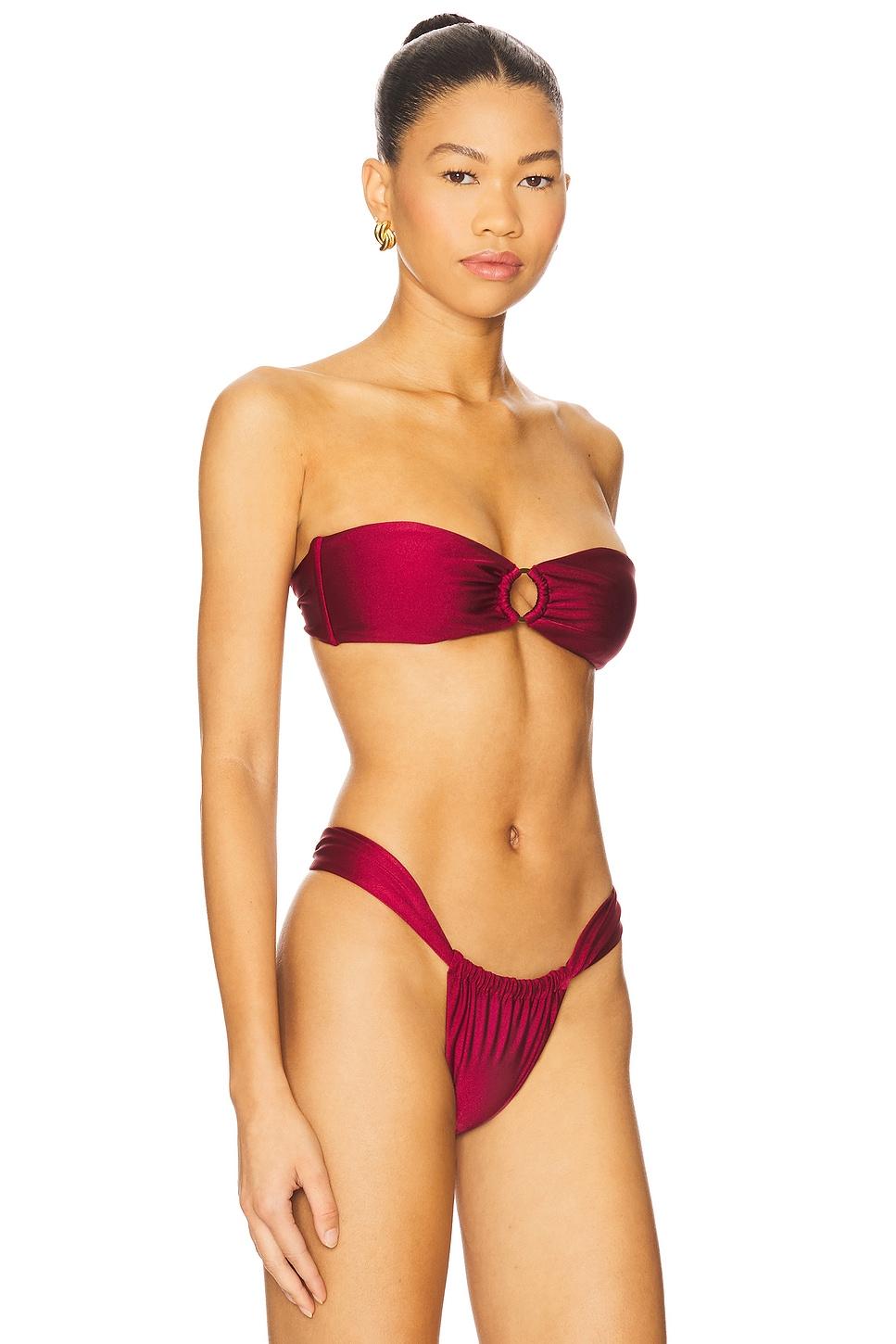80% nylon, 20% elastane. Hand wash. Unpadded cups. Back tie closure. Boned sides. Front gold-tone ring accent. Lightweight swimwear fabric. Item not sold as a set. Made in Indonesia. Revolve Style No. LEWA-WX867. Manufacturer Style No. LWX10018 U25.