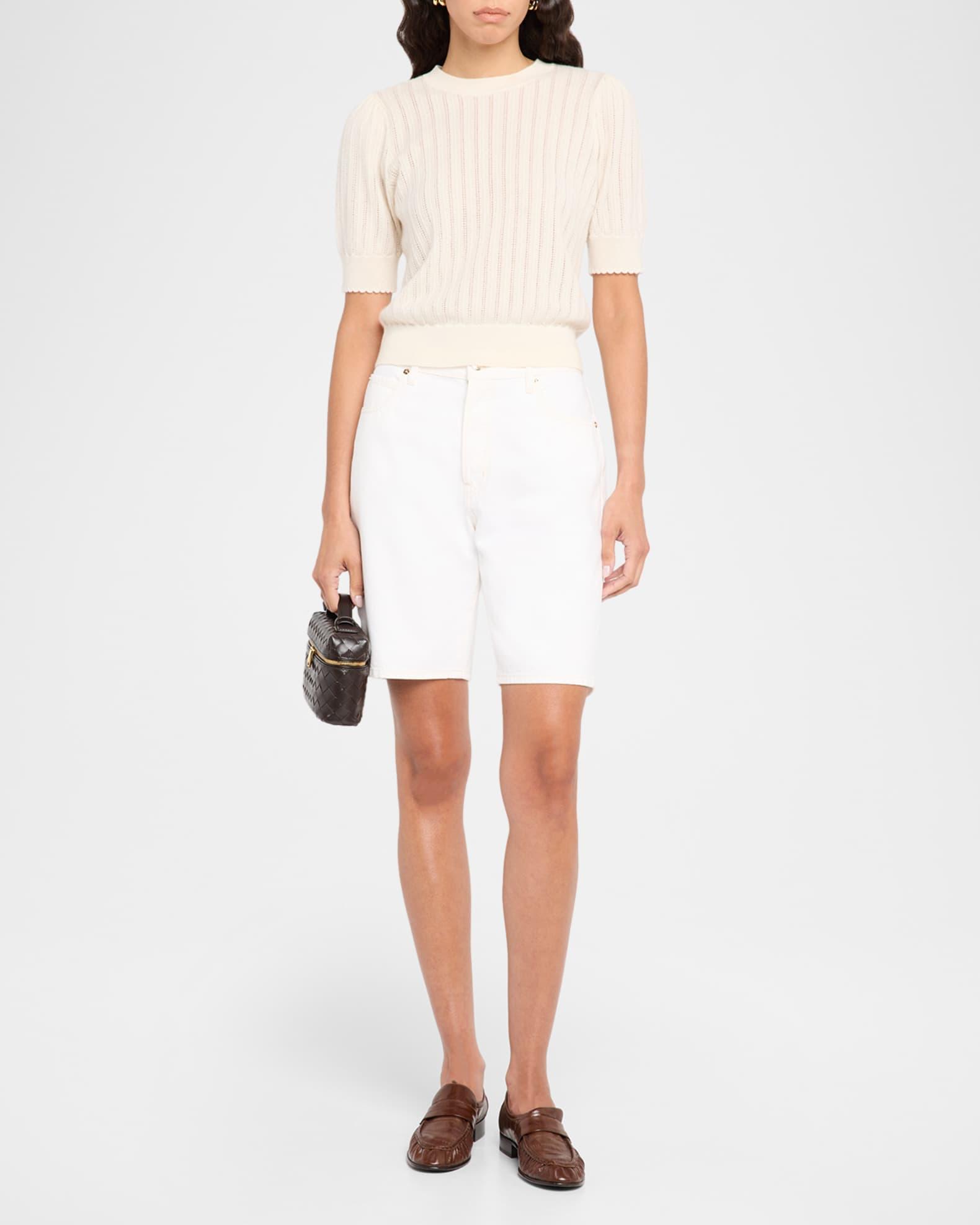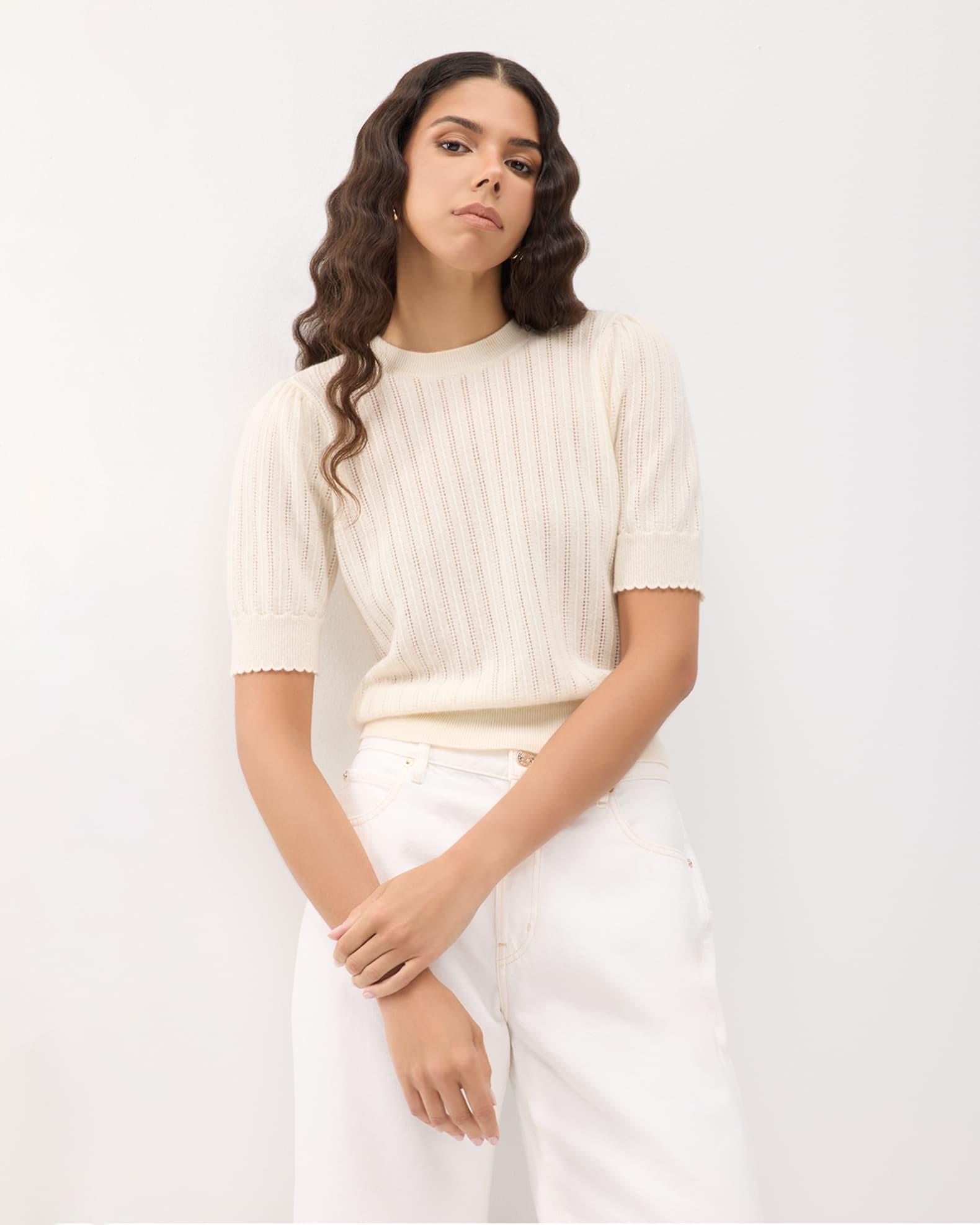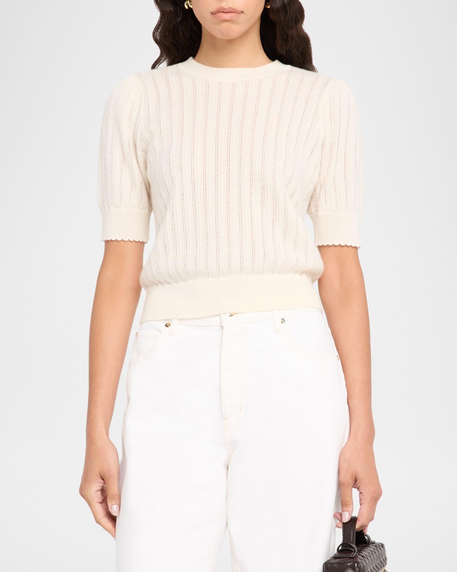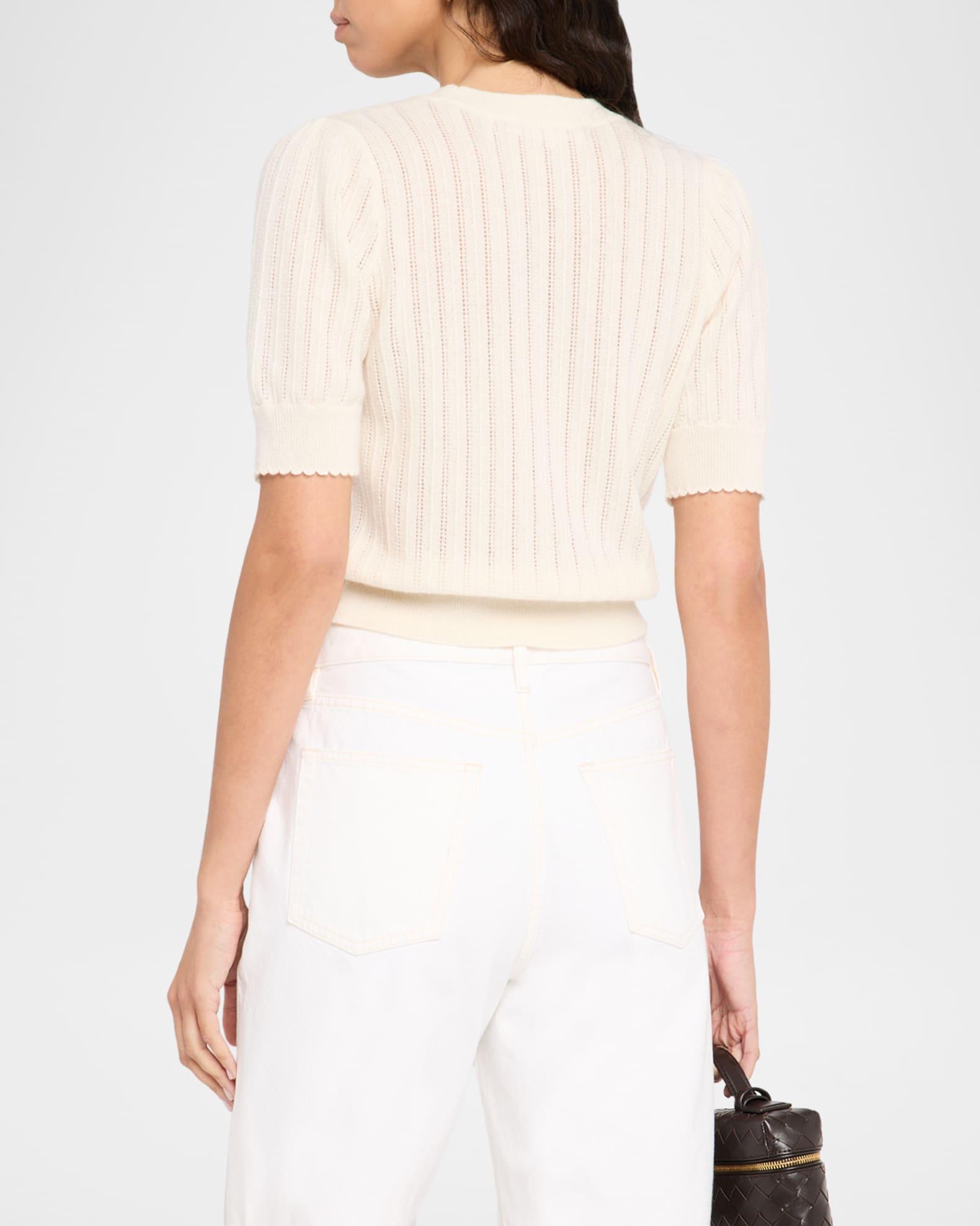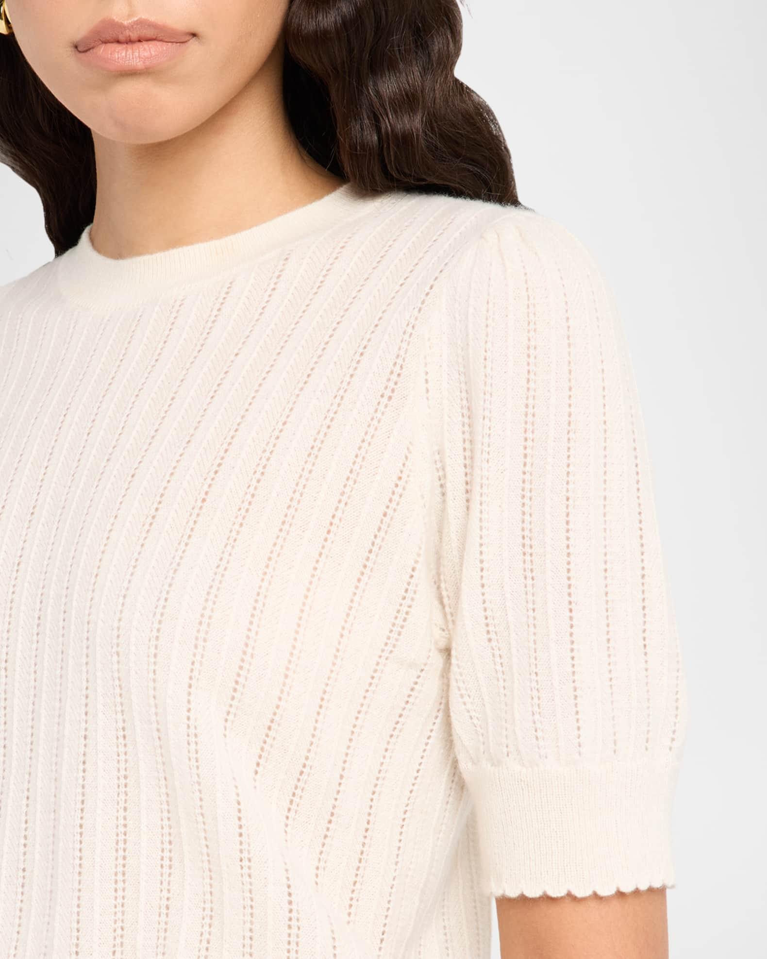 FRAME pointelle sweater crafted in luxurious cashmere Crew neckline Short sleeves Classic fit Hem sits at the hip Pullover style Cashmere Dry clean Imported