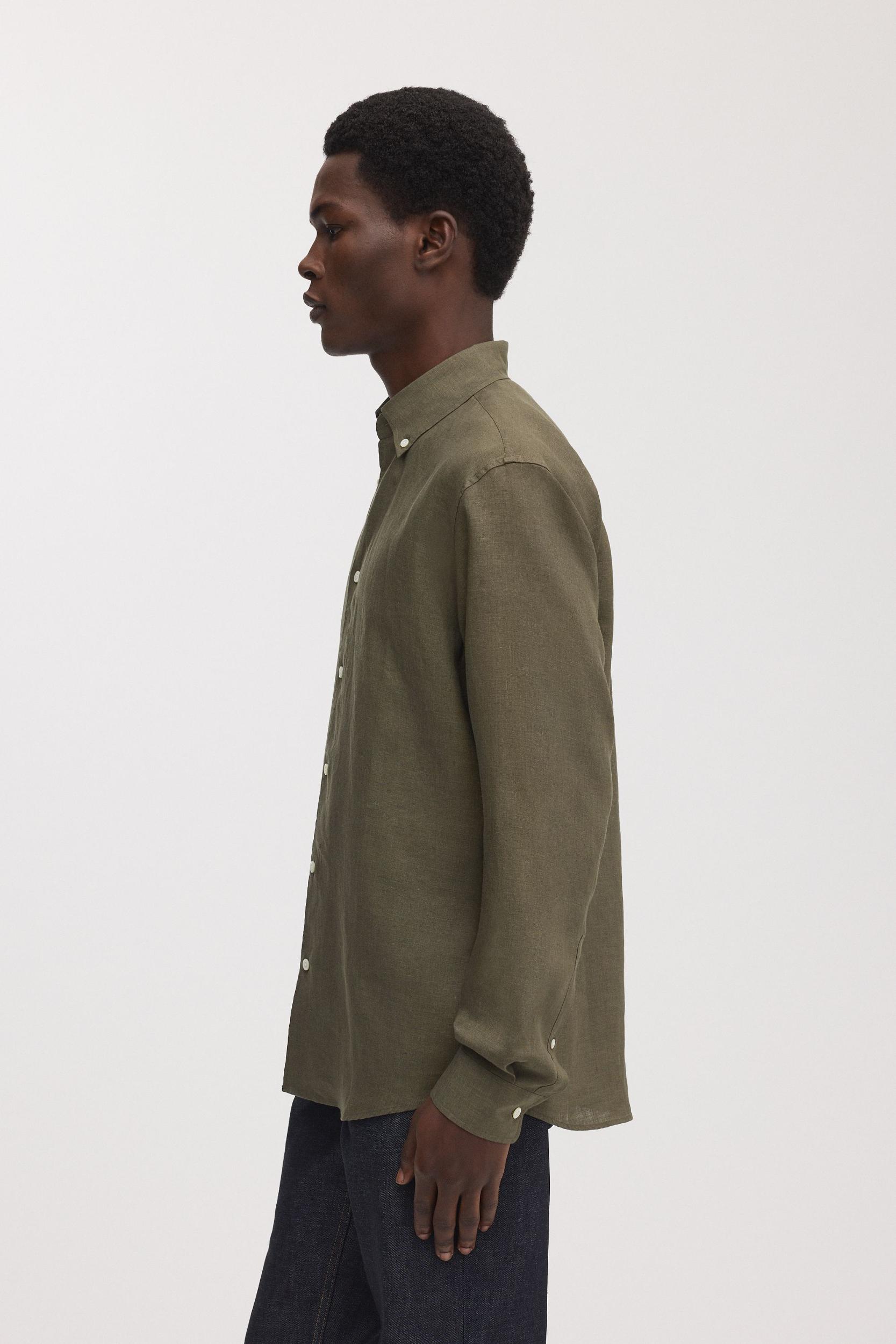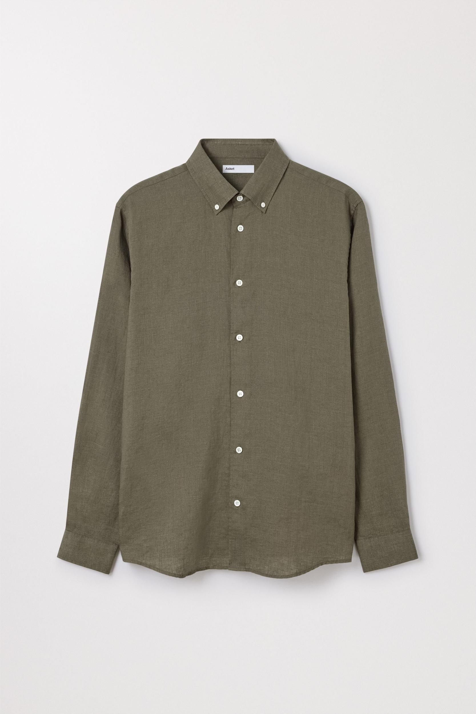 The Linen Shirt in Olive: Lightweight 100% Linen Button Down Shirt. Tailored for a relaxed yet structured fit. Available in long, regular and short