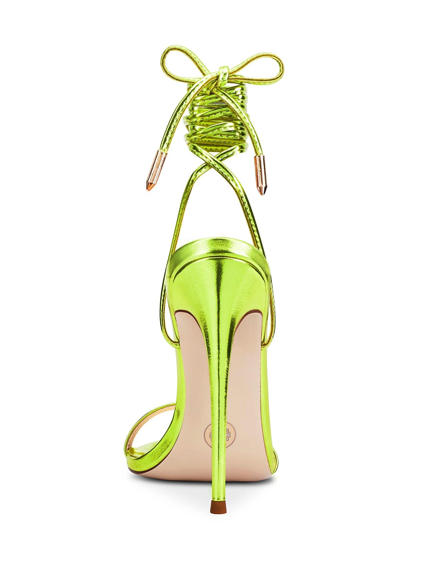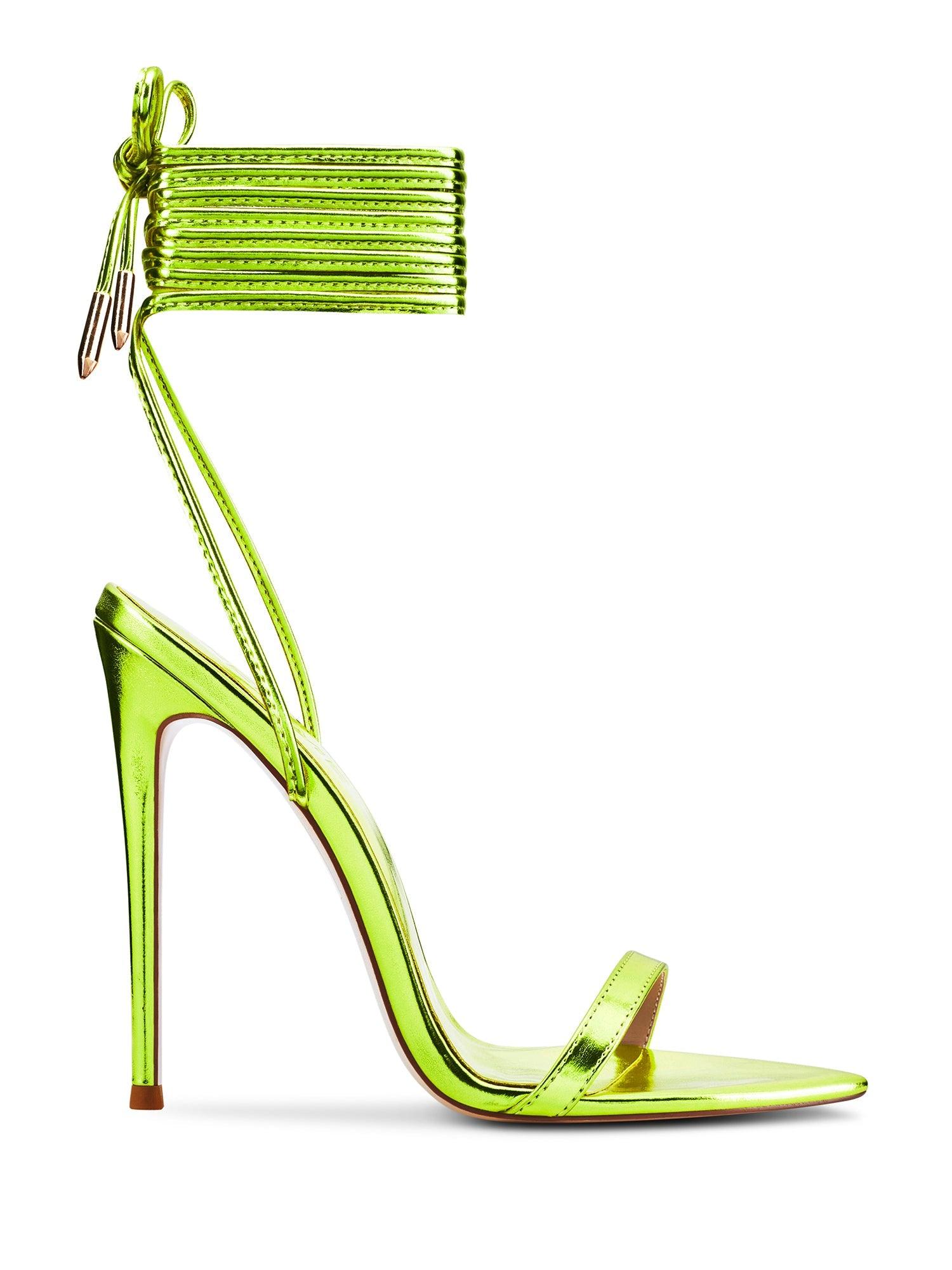 The item is a final sale product. This item is sold "as-is" and is not eligible for returns or exchanges. Please reach out to us regarding sizing questions or any inquiries. Presenting the London Sandal – a harmonious fusion of minimalist and contemporary aesthetics. Featuring a streamlined spiked stiletto heel cloaked in glistening metallic vegan leather and complemented by wraparound lace-ups, this sandal emanates elegance and adaptability. The London Sandal is the perfect selection for the style-conscious woman seeking to enhance her look with a sophisticated and fashionable pair of sandals, effortlessly transitioning from daytime to evening wear. Vegan upper Vegan Insole Vegan outsole Open-Pointed toe Wraparound lace-up Handmade Designed in LA Self-covered stiletto heel, 4.75" (120mm)