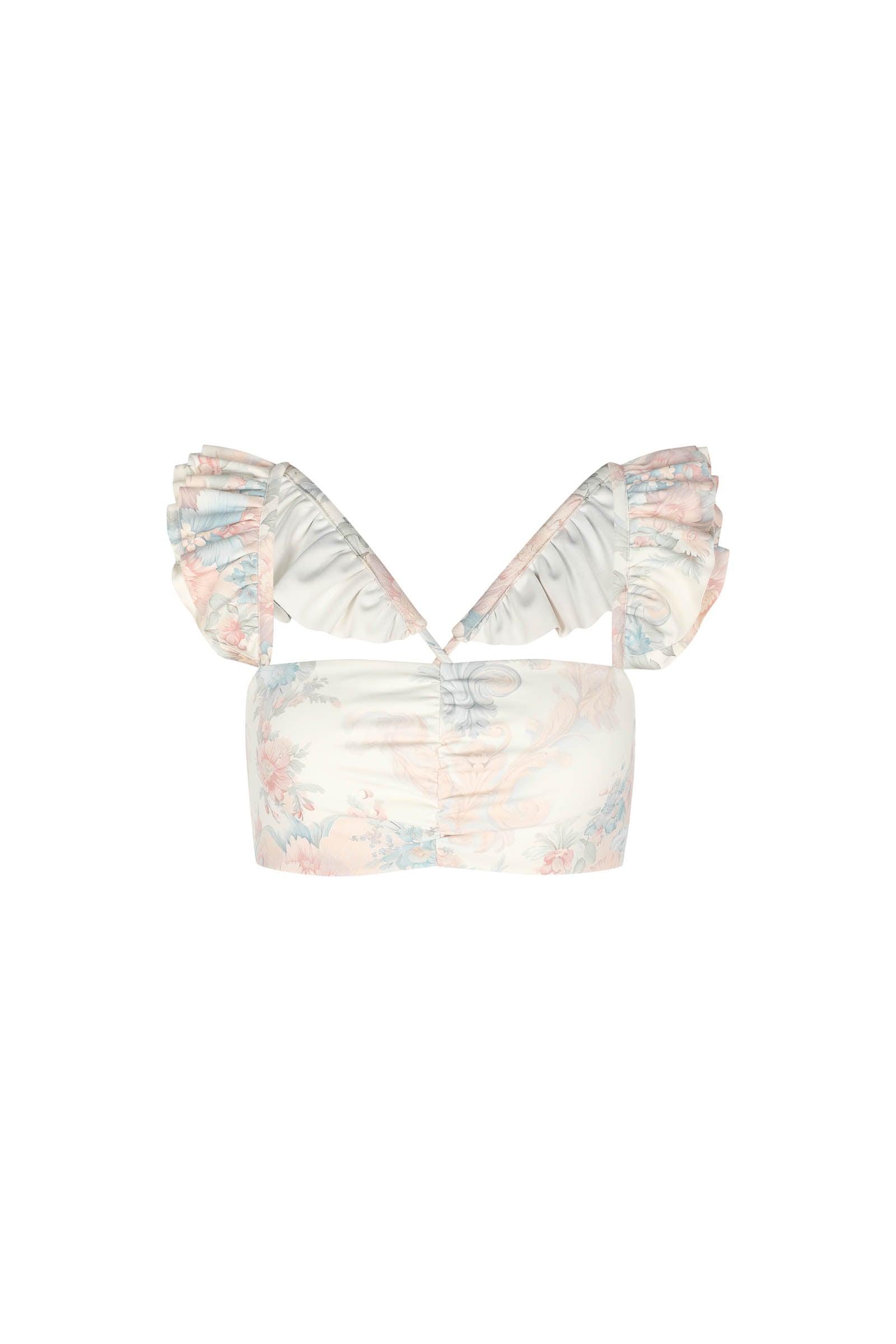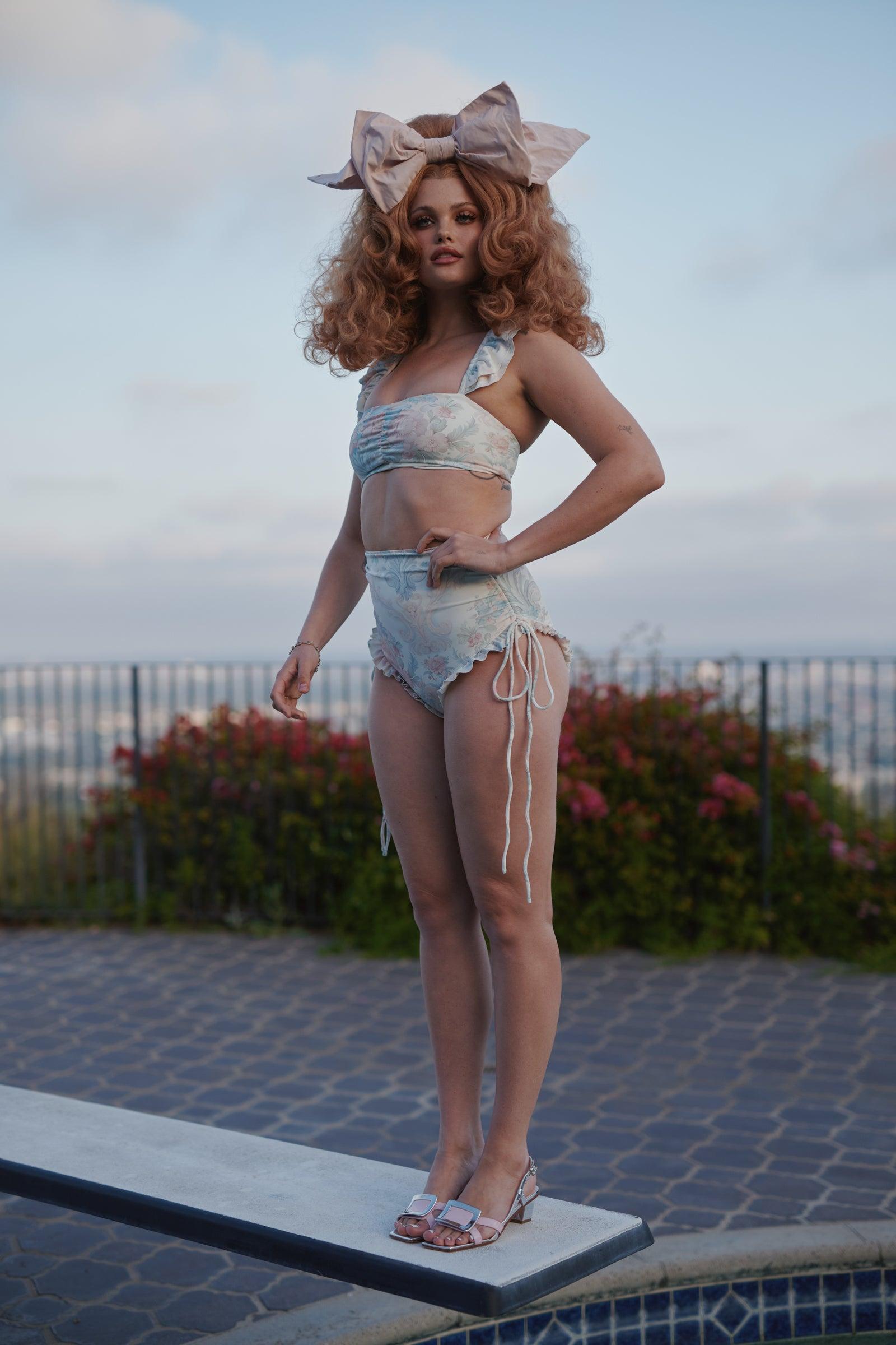 Selkie’s bikini debut is a nod to the classics, reminiscent of the iconic bikinis worn by bathing beauties of yesteryear, this suit is crafted in a classic spandex fabric. Featuring ruffle straps and a gathered bust, this top is ideal for a 60s dame, the Macaron print blending the grandiosity of 18th-century style with the playful audacity of swinging sixties. Pair with the Macaron Bardot Bikini Bottoms. Style with the Macaron Beverly Hills Cover-Up Top and Dauphine Cover-Up Skirt to complete the look. Bandeau swimsuit top with ruffle straps and gathered bust Stretch fabric Versatile shoulder straps can be tied multiple ways, adjust the ties to ensure the perfect fit Pull-on style To ensure the best fit, measure your across bust before ordering and steam for optimal beauty. Bintou is 5’8” and wearing a size XXL in Selkie. Her measurements are 45” bust, 38.5” waist, 45” hip. Jordyn is 5’9” and wearing a size XS in Selkie. Her measurements are 35” bust, 27.5” waist, 39.5” hip. Fabric: 85% Nylon 15% Spandex Lining: 92% Nylon 8% Spandex