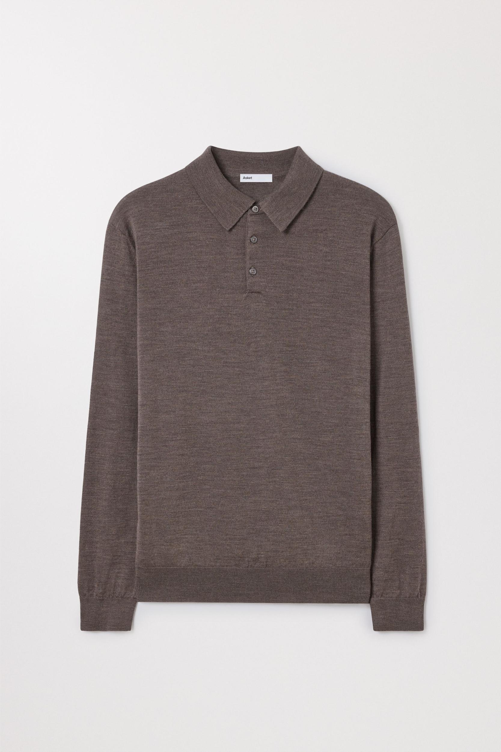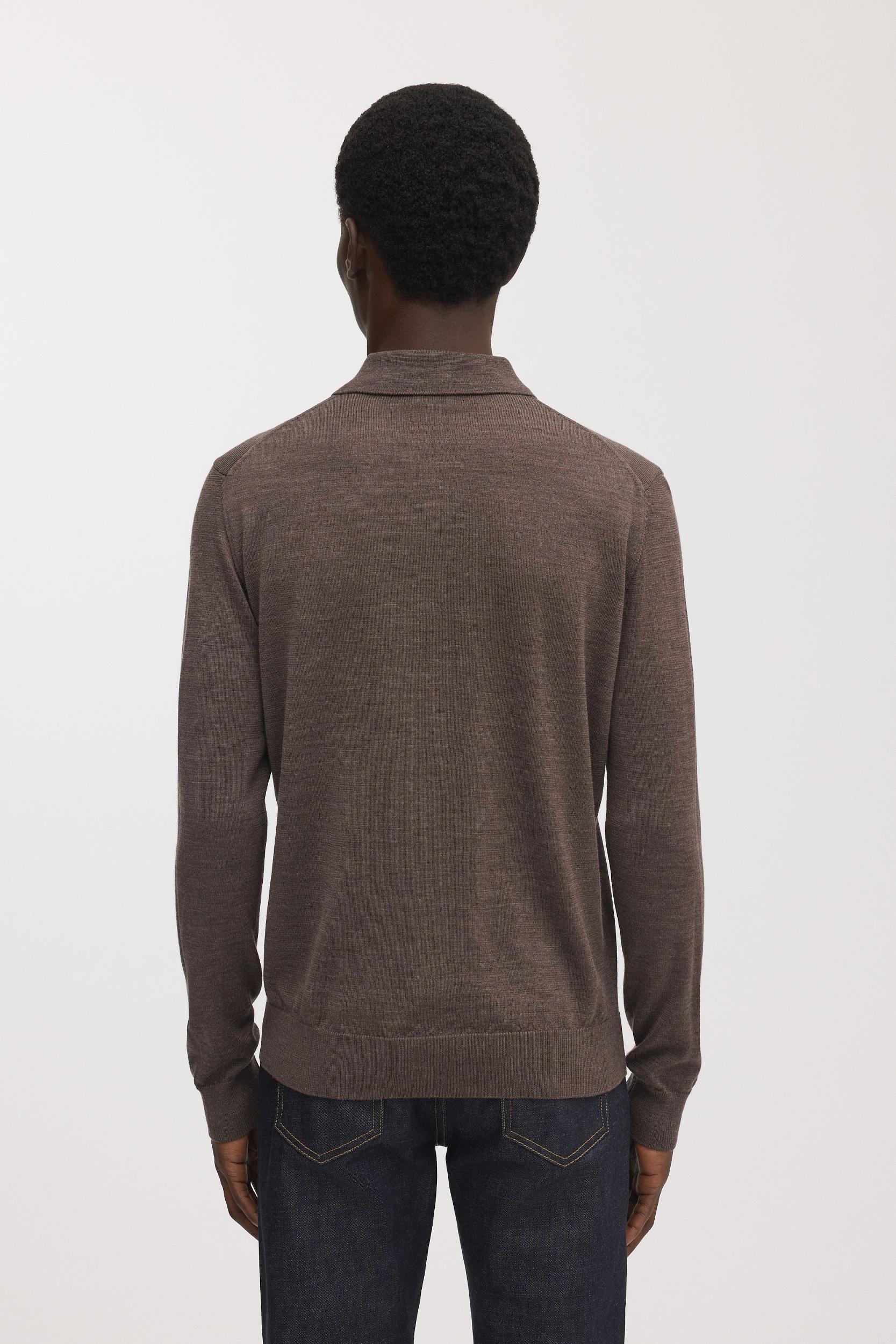 The Merino Wool Polo in Brown Melange. Knitted in Italy from 100% extra-fine Australian merino wool, embellished with mother of pearl buttons.