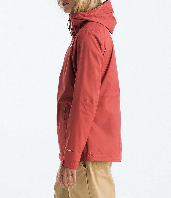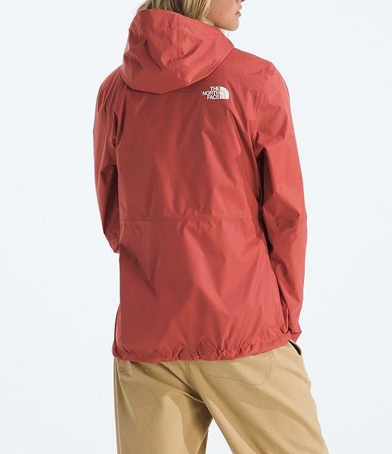 From The North Face, this jacket features: DRYVENT fabrication Rain jacket silhouette Attached three piece hood with cinch cord and cord lock Long sleeves with adjustable hook and loop cuffs tabs Secure zip chest pocket Exposed zip hand pocket Internal drop in pocket behind hand pocket Jacket stows in vertical Pit-zip venting Water repellent Regular fit Fully lined Internal elastic cinch cord with cord lock hemline Zip front closure Recycled nylon Machine wash Imported. Regular fit/Waterproof, breathable, seam-sealed DRYVENT 2.5L shell with a non-PFC DWR finish helps keep you dry/Body fabric and body lining made with recycled nylon/Attached, adjustable, three-piece hood with a cinch-cord and cord locks/Exposed, water-repellent center front zip with a zipper garage at upper neck/Jacket stows in vertical, secure-zip chest pocket/Exposed-zip hand pockets/Internal drop-in pocket behind hand pocket/Pit-zip venting/Adjustable hook-and-loop cuff tabs/Internal elastic cinch-cord with a cord lock at hem for adjustability/Printed lining/Heat transfer logo on left chest and back-right shoulder