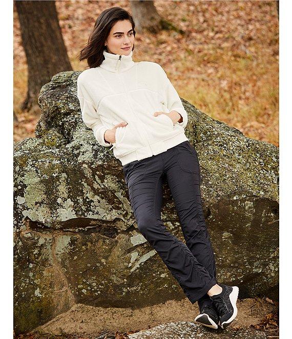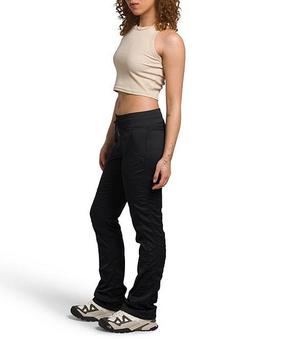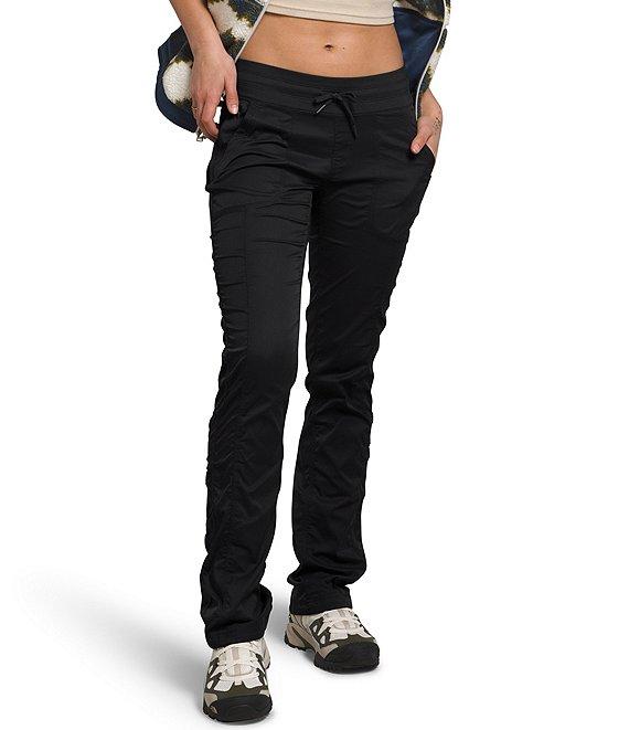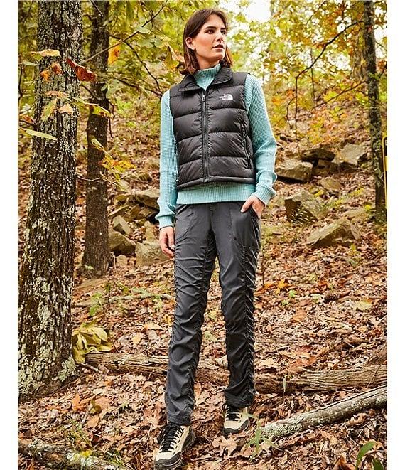 From The North Face, these pants feature: Herringbone woven fabrication Flat front silhouette Mid rise Straight slim leg Shirring on legs with stretch drawcord at leg opening for style and adjustability Slant pockets with concealed-zip Vertical bartack at back waistband to secure drawcord Cinched drawstring Four-way stretch Faux fly Pull-on construction Approx. 30" inseam; 17" leg opening Nylon/recycled nylon/elastane Machine wash Imported.