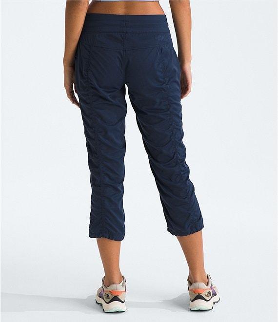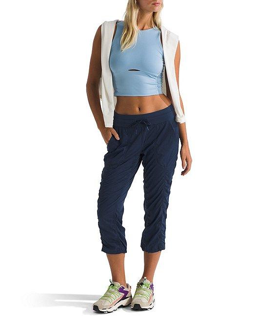 From The North Face, these pants features: Herringbone woven fabrication Flat front silhouette Wide drawcord waistband 4-way stretch 40+ UPF ultraviolet protection Non-PFC DWR finish for added water repellency Vertical bartack at back of waistband to secure the drawcord FlashDry materials offer enhanced moisture Embroidered logo on back right yoke Faux fly Straight leg fit Pull-on construction Approx. 22" inseam; 17" leg opening Recycled nylon/recycled polyester/elastane Machine wash Imported. Stay comfortable wherever you explore in the Women s Aphrodite 2.0 Capris durable, water-repelling, quick-drying pants that are perfect for quality time in the outdoors.