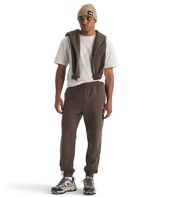 From The North Face, these joggers feature: Drawstring elastic waistband Hand pockets "The North Face" logo and icon logo detail embroidered on left leg Ribbed cuffs on the leg hems Pull-on construction Regular fit Solid color of cotton/polyester; solid pocket of cotton Machine wash/tumble dry Imported.