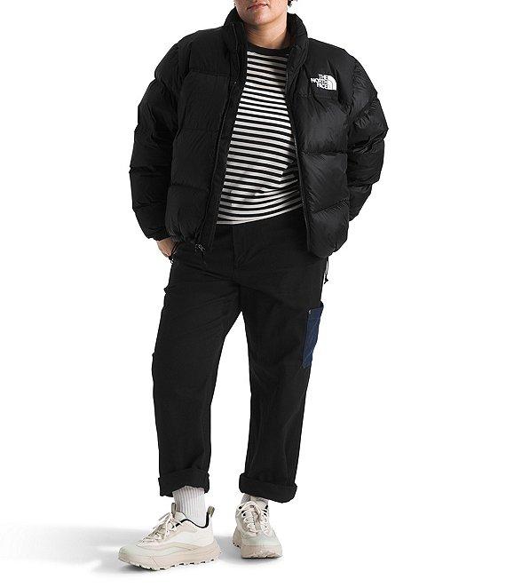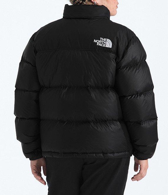 From The North Face Plus, this jacket features: Shiny ripstop fabrication Boxy silhouette Stand collar neckline Stowable attached three-piece hood Long sleeves Secure zip hand pockets Jacket stows in right hand pocket Partially encased elastic cuffs Adjustable hook and loop cuff tabs Internal drawcord with cord lock at hemline for adjustability 700-fill goose down Oversize baffles Non-PFC DWR finish for added water repellency Embroidered logo on left chest and back right shoulder Oversize logos of the original '96 jacket Relaxed fit Fully lined Straight hemline Exposed VISLON center front zip closure Approx. 26" length Recycled nylon ripstop Machine wash Imported.