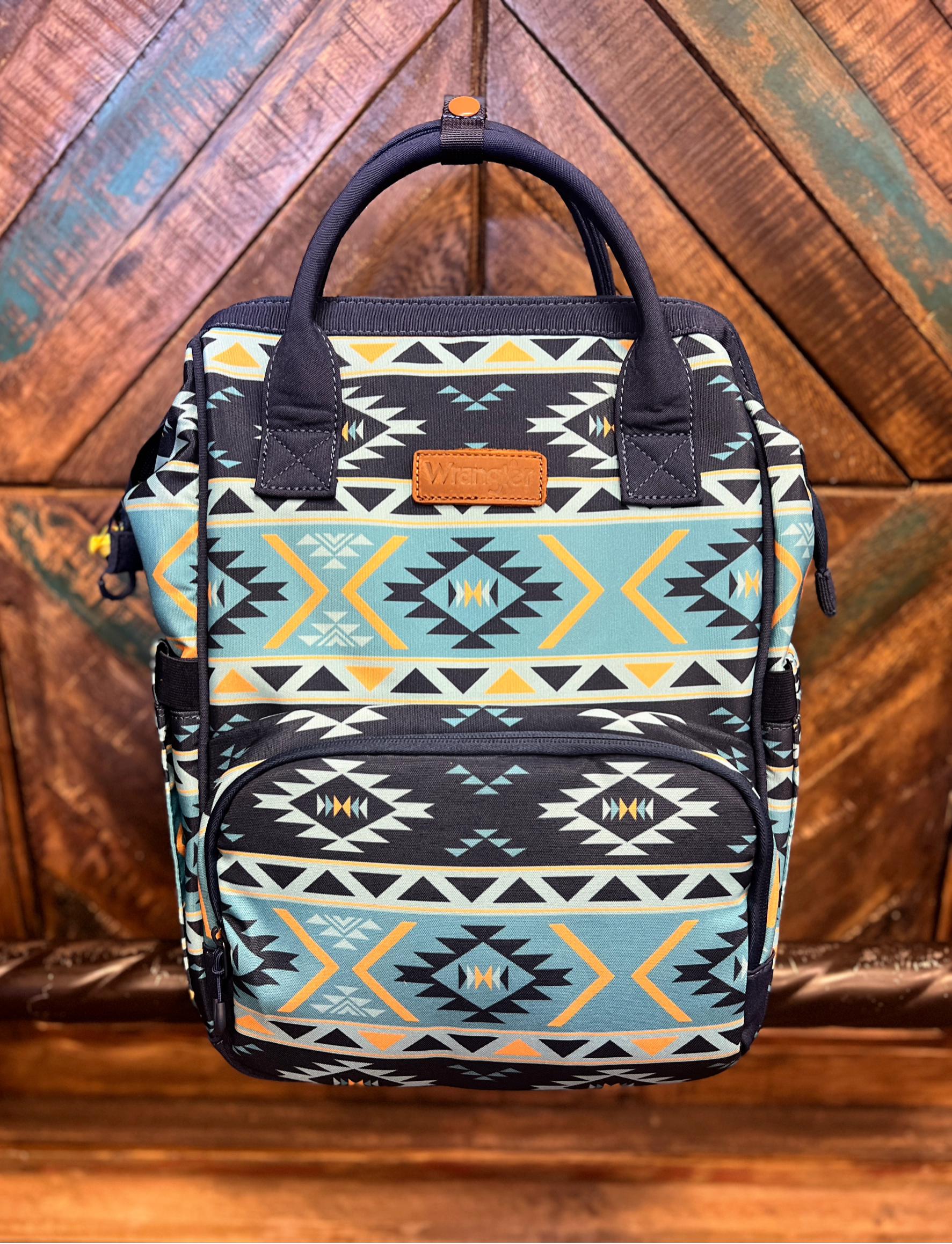 Expertly designed for modern parents, The Original Wrangler Diaper Bag combines style and functionality. Its backpack style and top zipper closure make it easy to access supplies, while the wide mouth bag and exterior pockets provide ample storage. Stay on trend with the navy & blue aztec design and keep bottles fresh with thermal insulated pockets. Adjustable straps will offer supreme comfort and the perfect fit for mom, dad, grandma, or anyones else! Western meets practicality with this must-have accessory. The bag is so versatile that it can absolutely be used as an ordinary backpack!