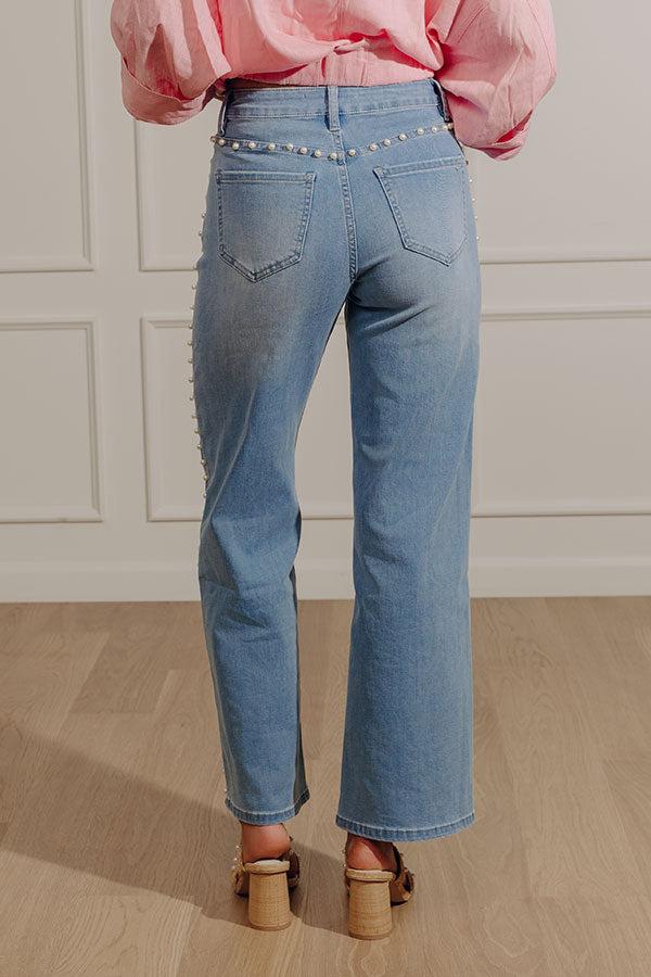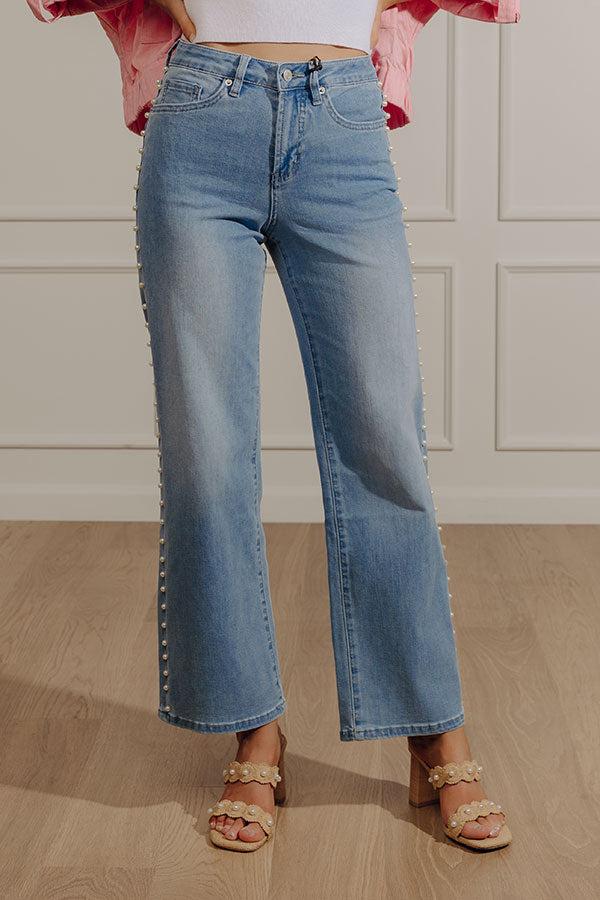 Denim just got a glow-up. These wide leg jeans bring a fresh twist to a classic favorite with luminous faux pearl embellishments that instantly catch the light. The pearl detailing adds a refined, statement-making finish that elevates the entire silhouette while keeping the look modern and polished.