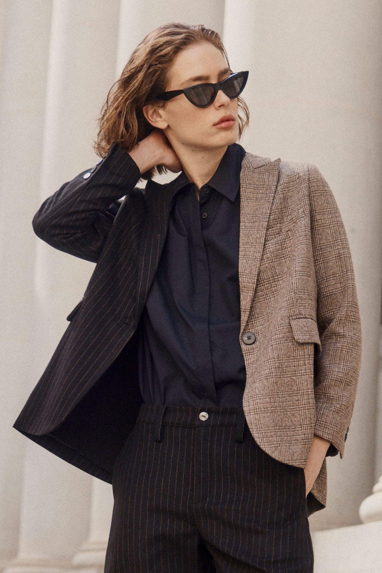 A bold remix of the classic blazer, designed with contrasting pinstripe panels in black and brown. Tailored yet playful, it’s a statement layer for work or weekend.
