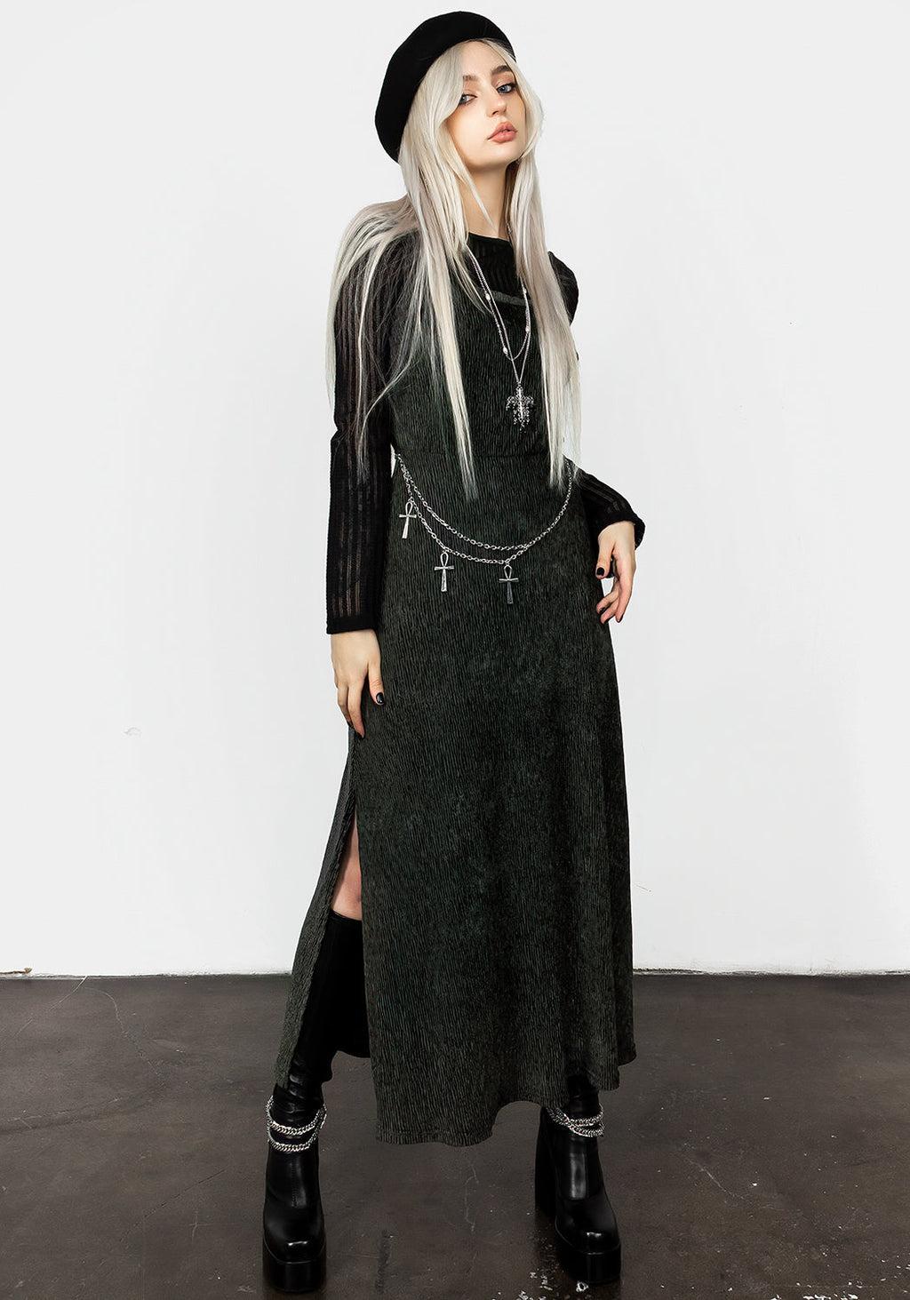 Get ahead of the times- Black velour maxi dress with charm belt - Classic A-line fit for a soft silhouette - Scoop neck and elasticated waistband fits to form - Fully lined bodice for a smooth & sleek silhouette- Removable silver charm belt features ankh symbols - Blue-toned dark grey crinkle velvet for a luxe finish - Stretch fabrication for comfortable, any day wear - Wear alone for a casual look or layer over button-ups for more structure Main: 92% polyester, 8% elastaneLining: 95% polyester, 5% elastaneTanya is 5'5" and wearing a UK8
